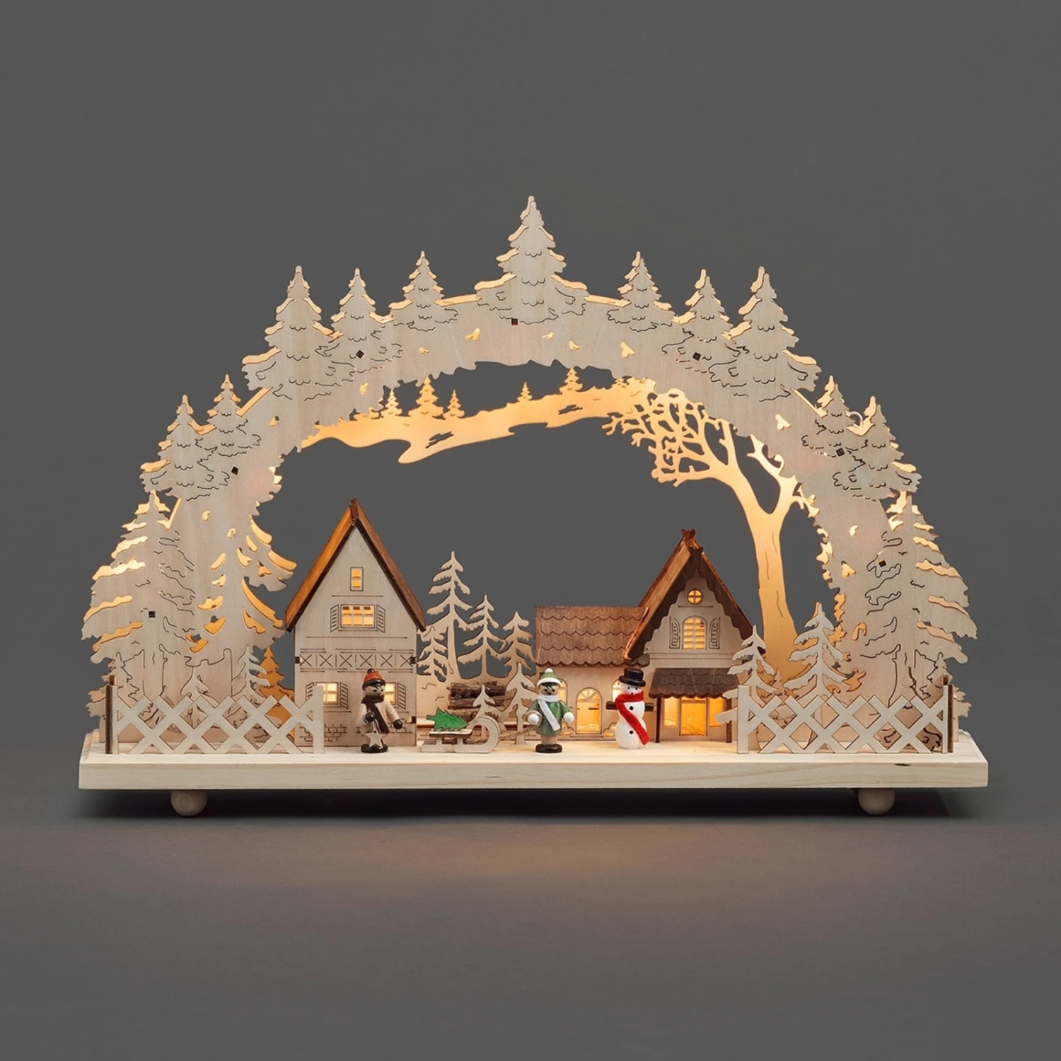 Mit diesem schönen Lichterbogen im Fenster entsteht zum einen eine gemütliche Atmosphäre im Raum, zum anderen wirkt das Haus – von außen betrachtet – besonders behaglich und einladend. Die Dorfszene aus naturfarbenem Holz wird von 10 LEDs mit warmweißem Licht in Szene gesetzt. Funktion wahlweise mit Trafo oder Batterie. Batterie nicht im Lieferumfang enthalten.