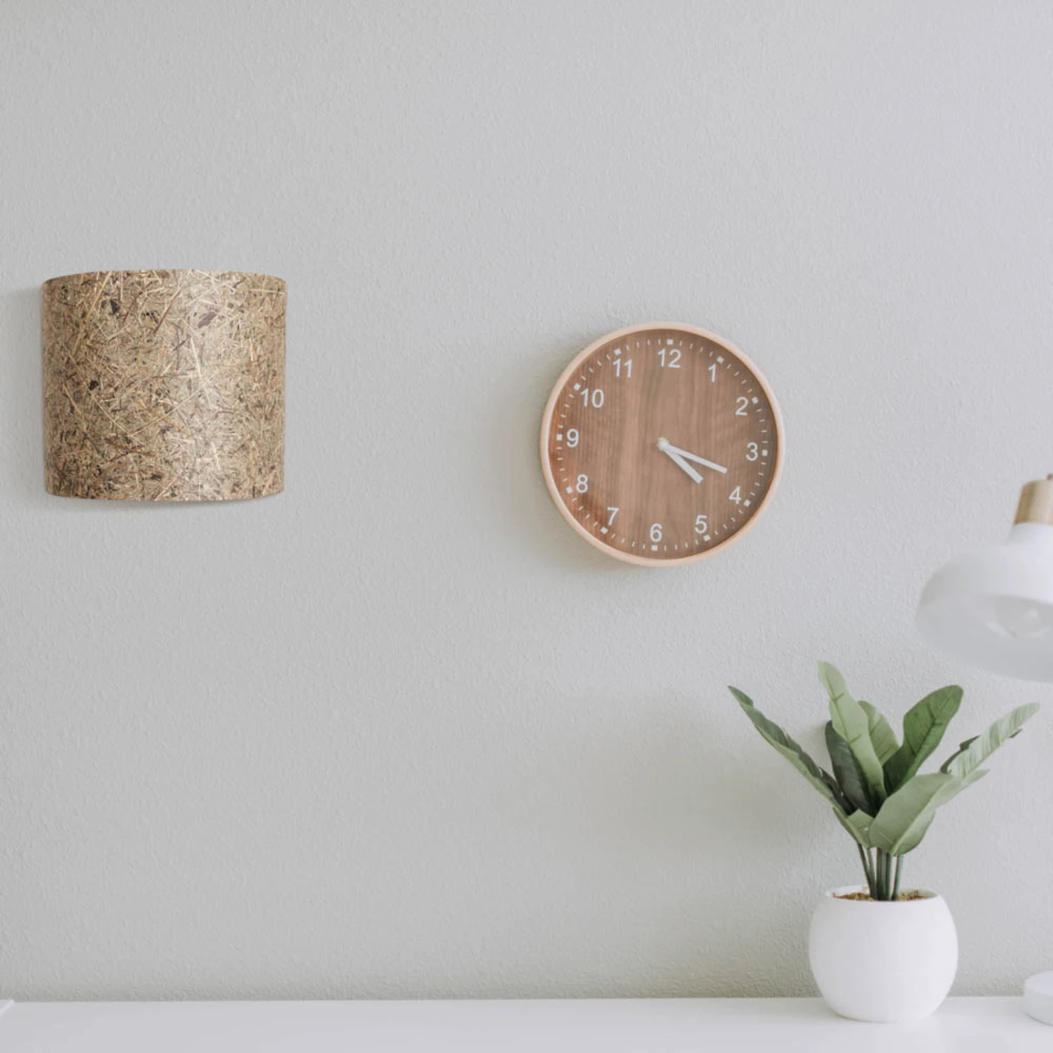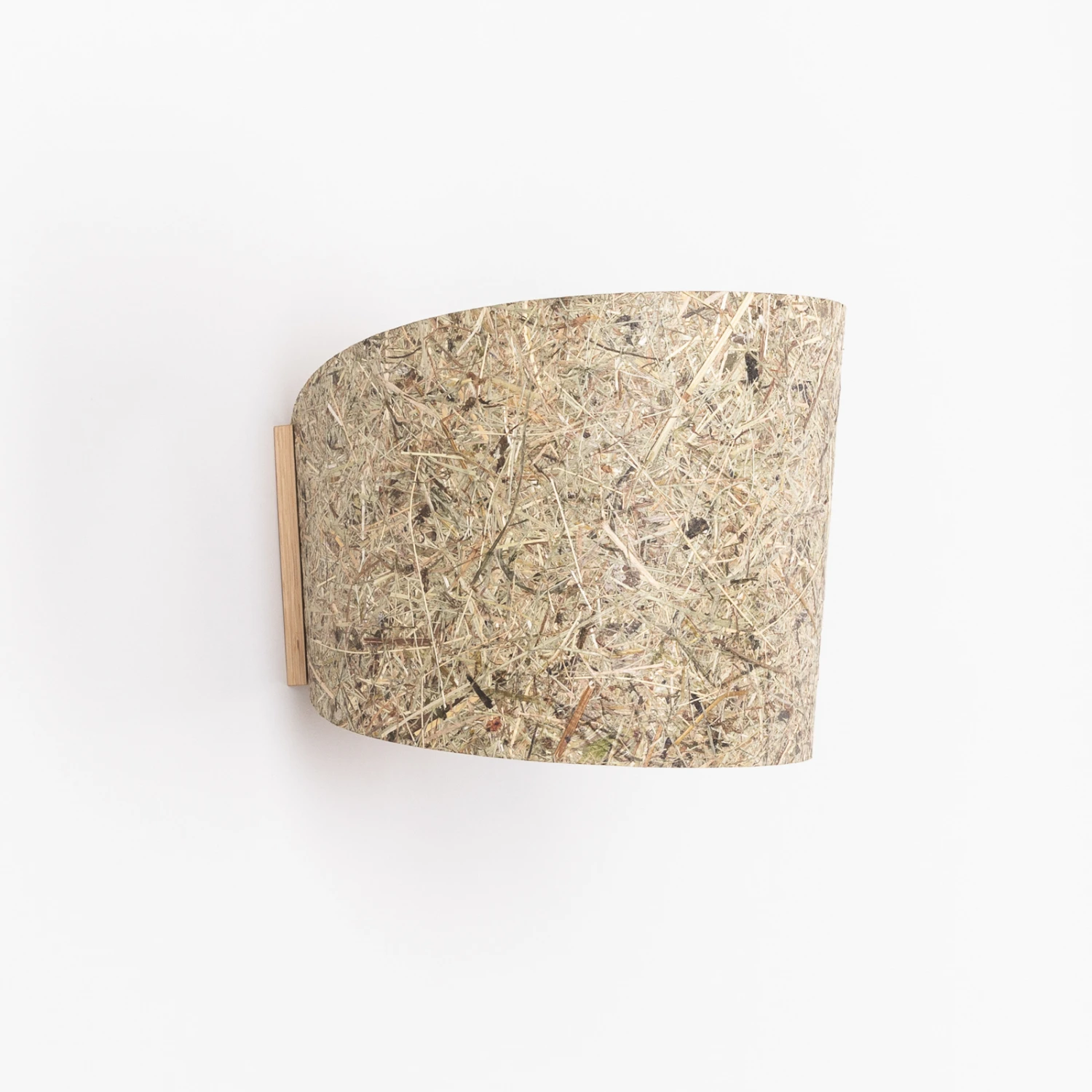 Die Wandbefestigung dieser Wandleuchte aus der Designlinie 1411 besteht wie die übrigen Versionen der Serie aus Eichenholz. Doch das Highlight stellt hier der zylindrische Leuchtenschirm dar, der mit aus purem Heu belegt ist. Hierdurch erlangt die Leuchte eine außergewöhnlich natürliche Ausstrahlung. Wie alle Leuchten des österreichischen Startups Almut von Wildheim wird dieses Produkt in Europa gefertigt, wobei natürliche Rohstoffe zum Einsatz kommen und keinerlei tierische Erzeugnisse einfließen. Mit Fug und Recht können die Leuchten als nachhaltig und vegan bezeichnet werden.