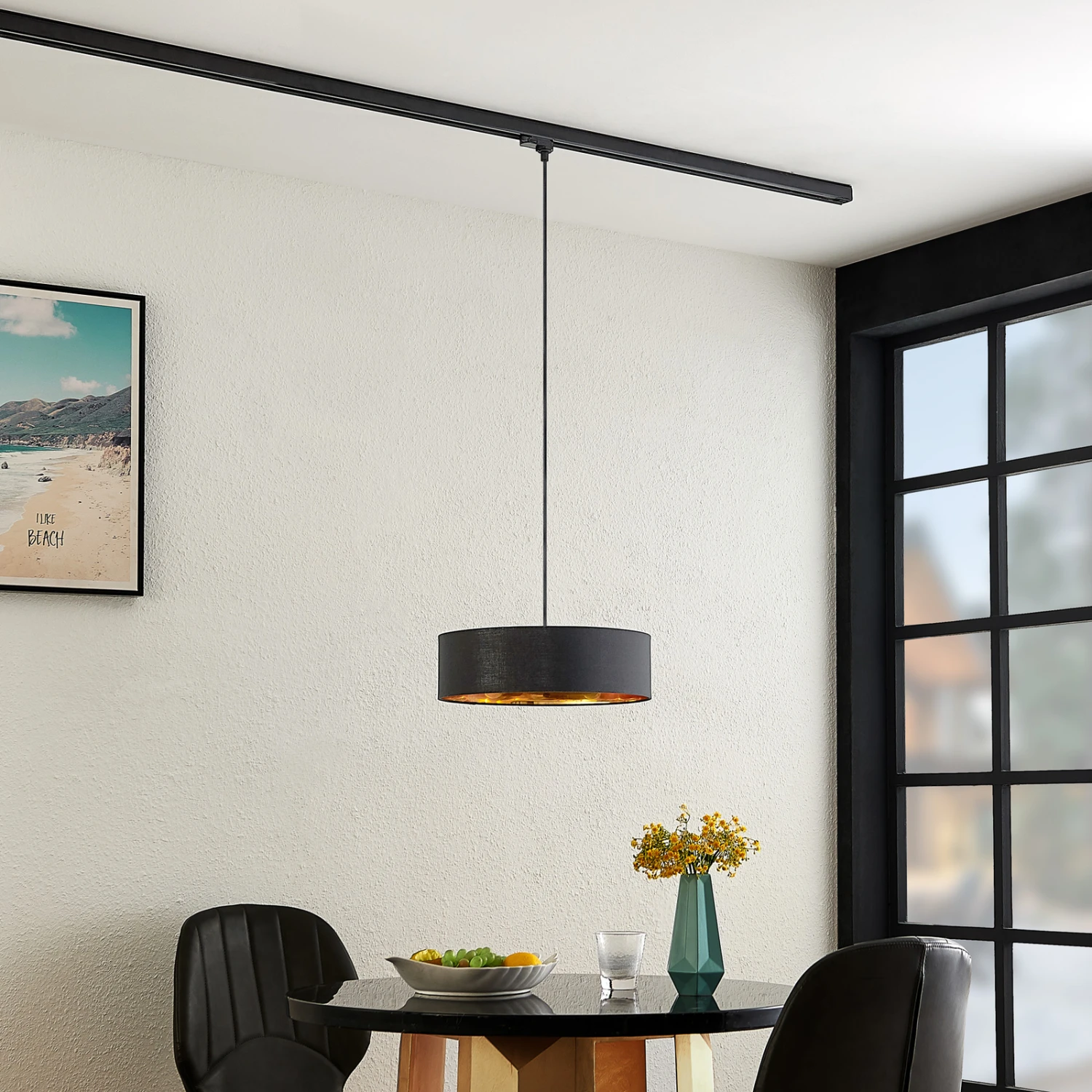 Heleni vereint ein schlichtes Design mit markanten Farben. Der Leuchtenschirm der Hängelampe ist aus Textil hergestellt und präsentiert sich in einem Farbkontrast aus Sandschwarz und Gold. Das Innere des Schirmes kann mit drei Leuchtmitteln bestückt werden und das durch diese generierte Licht wird nach unten hin abgeblendet. Die Hängeleuchte Heleni lässt sich unkompliziert in ein 3-Phasen-Schienensystem integrieren und mit weiteren Lampen ihrer Serie kombinieren. Ihre lange Aufhängung macht sie perfekt für die Illumination eines Esstisches.