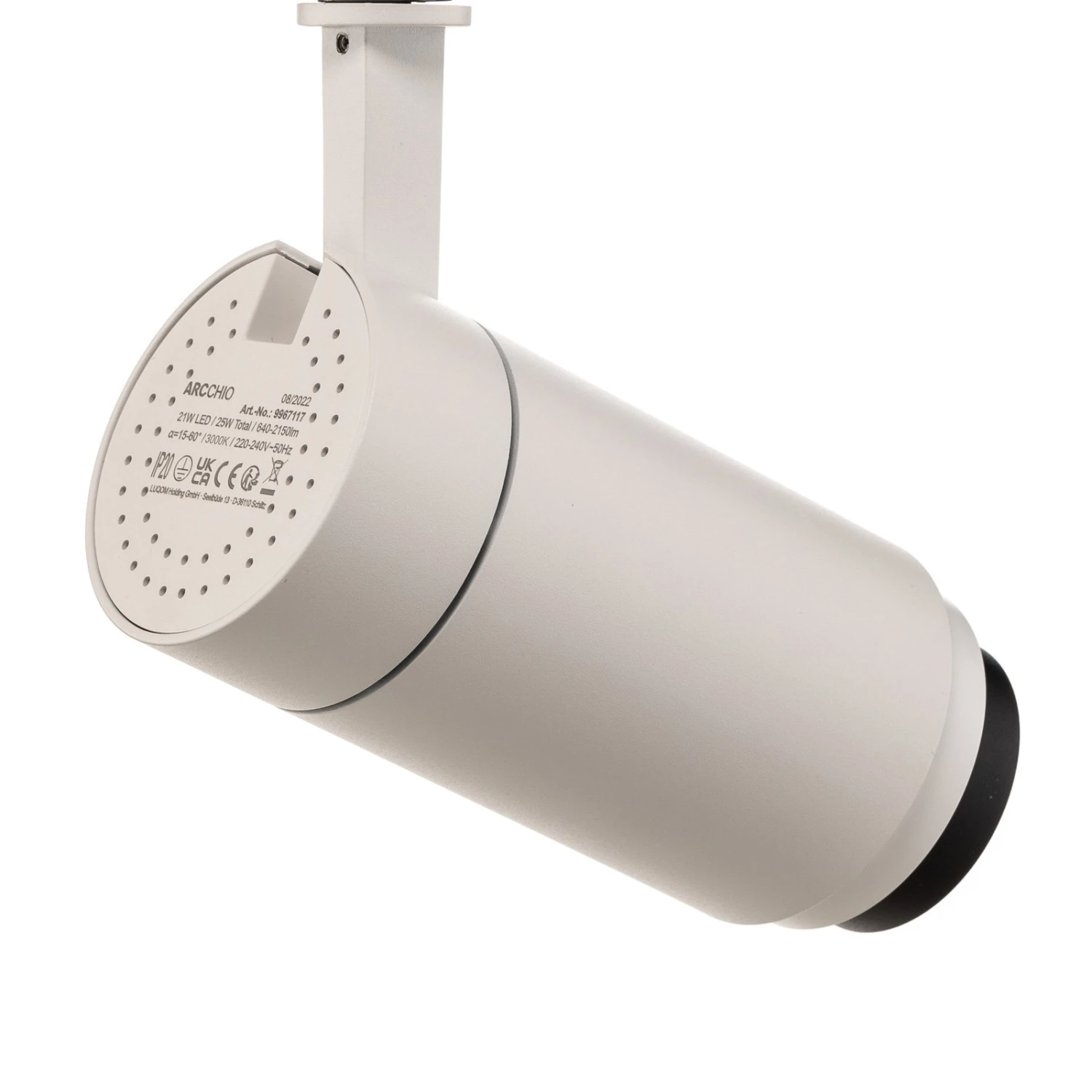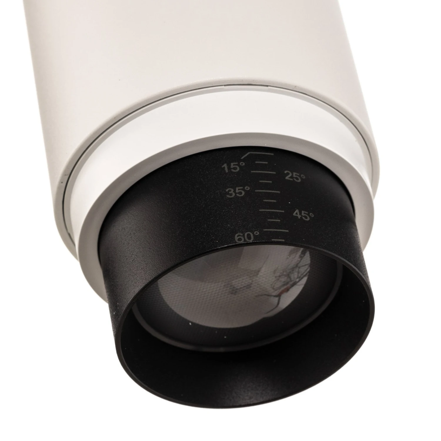 Der aus weißem Aluminium gefertigte Schienenstrahler Nanna besitzt einen individuell verstellbaren Leuchtenkopf, der sich nicht nur selbst drehen und schwenken lässt, sondern zudem im Abstrahlwinkel änderbar ist. Von schmalen 15° bis hin zu breiteren 60° kann die Linse bequem durch einfaches Drehen am Leuchtenkopf variiert werden. Für das korrekte Einstellen des Winkels befinden sich hier kleine Markierungen am Strahler.