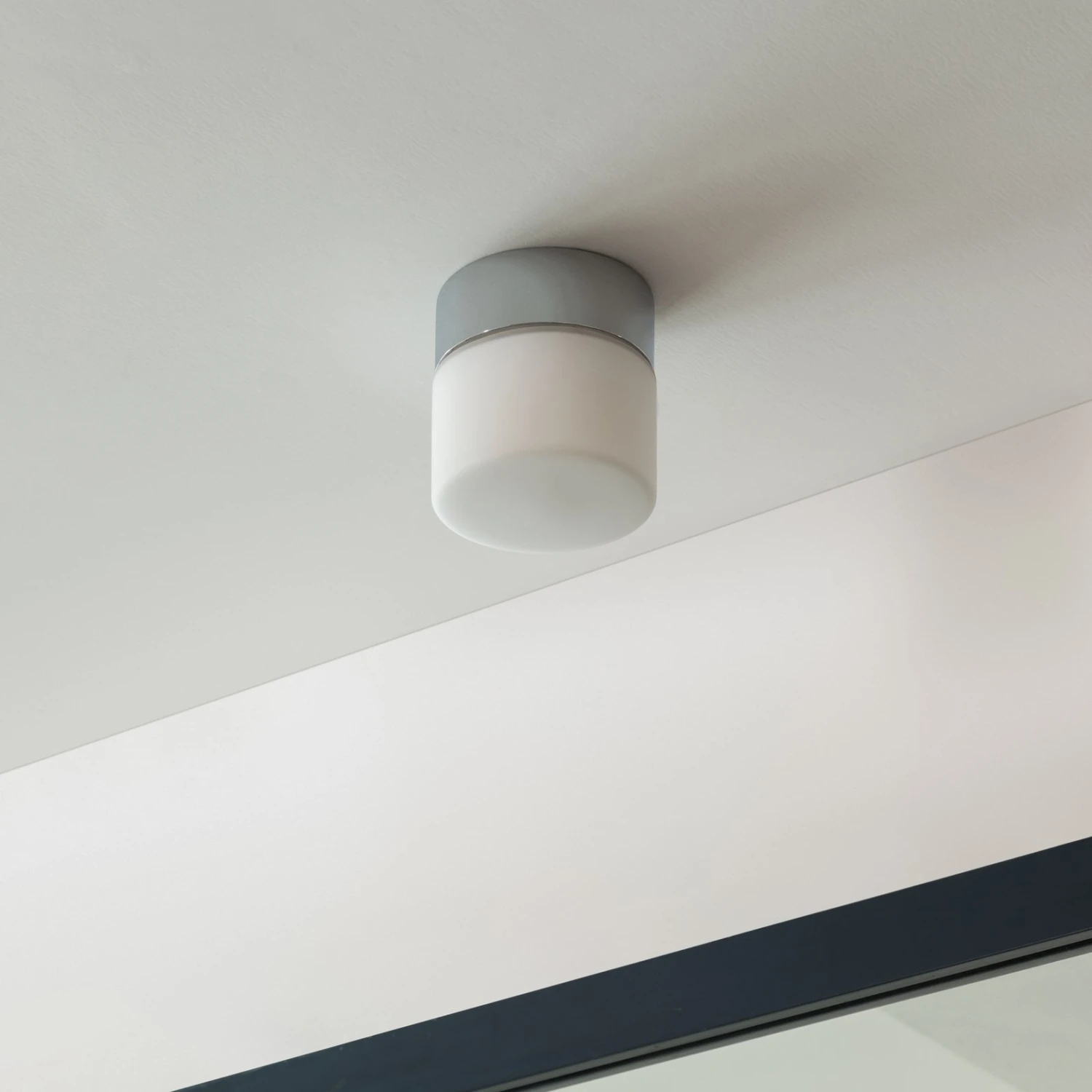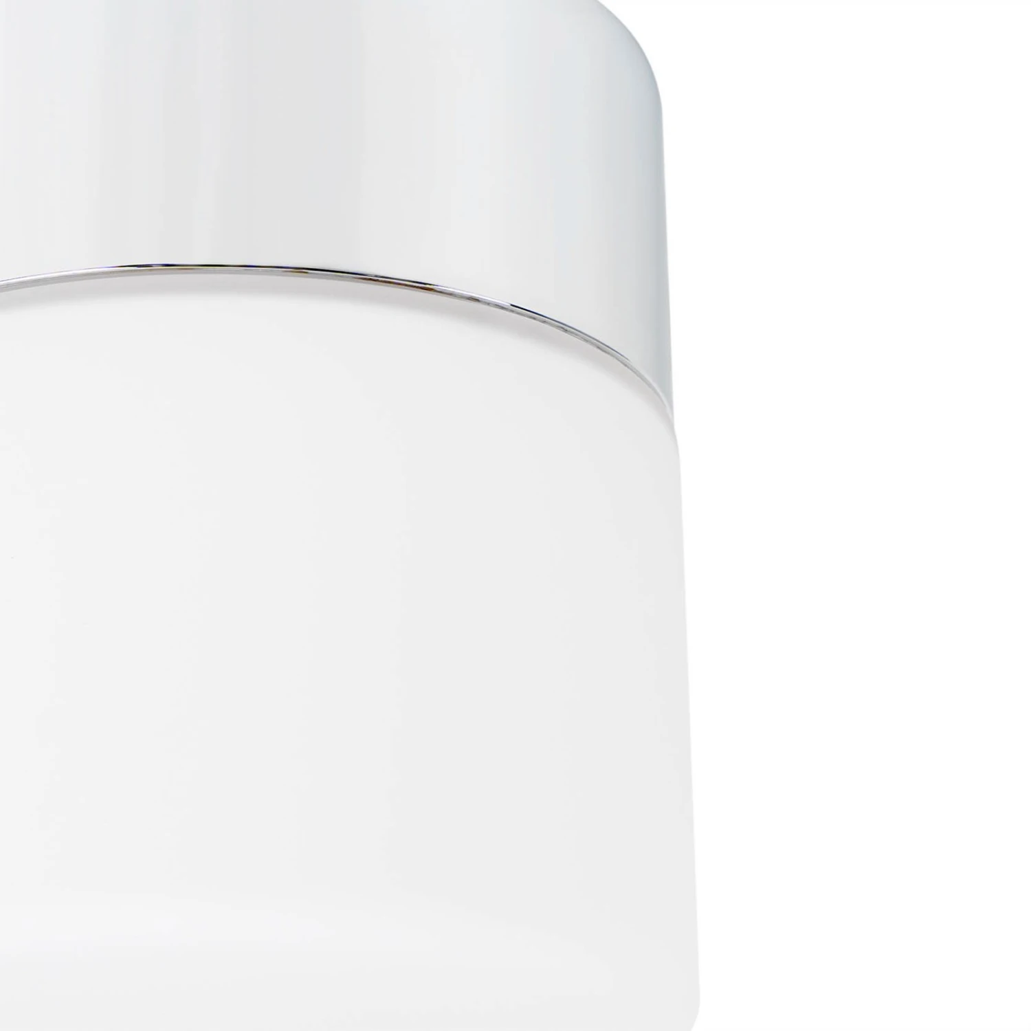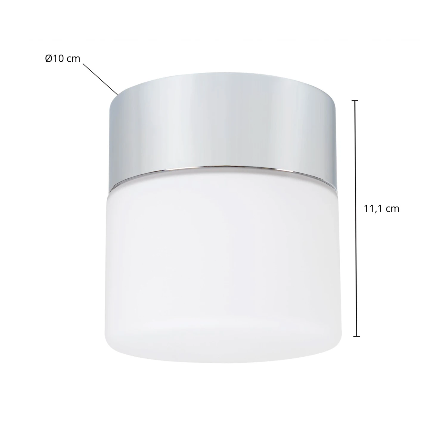 Kompakte LED-Bad-Deckenleuchte Timaris in runder Form, mit Chromhalterung und Glasschirm