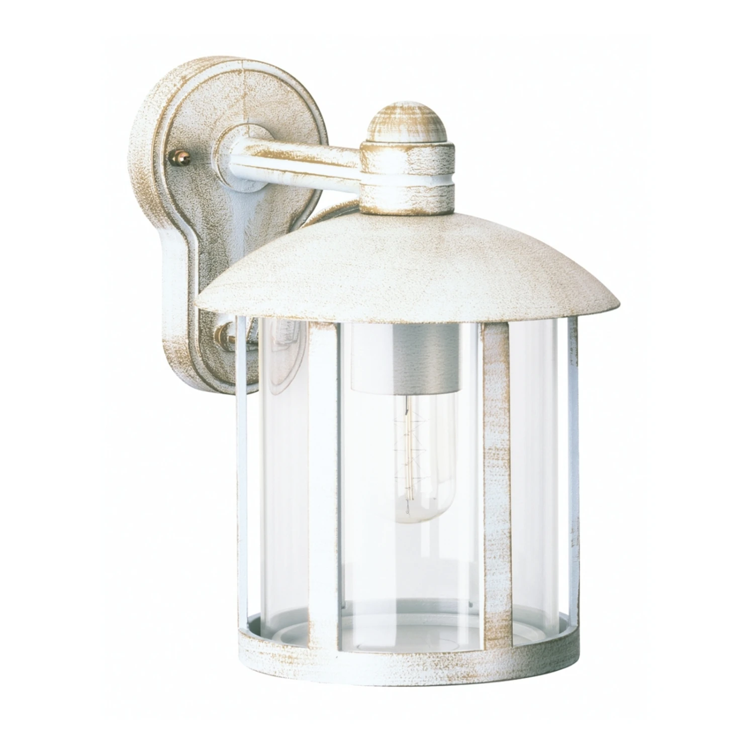 Die Außenwandleuchte Geras ahmt in der Formgebung eine traditionelle Wandlaterne nach. Dadurch verleiht sie der Hausfassade einen romantischen und stimmungvollen Akzent. Eine weitere charmante optische Qualität entsteht durch die farbliche Gestaltung der Aluminiumguss-Leuchte. Sie ist in freundlich weißer Farbe gehalten und mit zartem Gold-Dekor veredelt. Die Wandhalterung hat die Form eines Schlüssellochs. In horizontaler Richtung neigt sich der Leuchtenarm und hält den Leuchtenschirm an der oberen Abdeckung. Das Laternengehäuse ist mit transparenten Acrylscheiben ausgestattet. Sie sind für den dauerhaften Außeneinsatz angenehm stoßunempfindlich. Das Licht wird ungehindert abgestrahlt und hat daher eine helle Leuchtwirkung. Zusätzlicher optischer Reiz entsteht, wenn auf die E27-Fassung eine formschöne Lampe aufgeschraubt wird. Geras kann Hauseingänge und Terrassenbereiche mit nostalgisch-rustikalem Flair bereichern.
