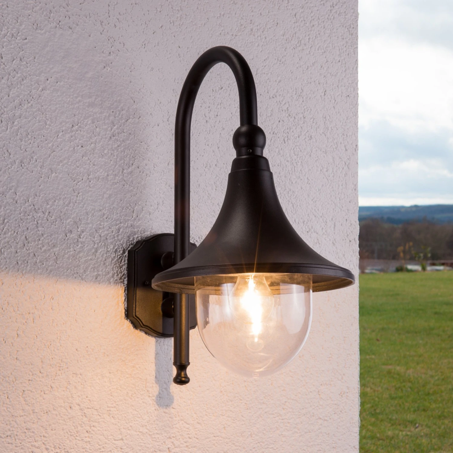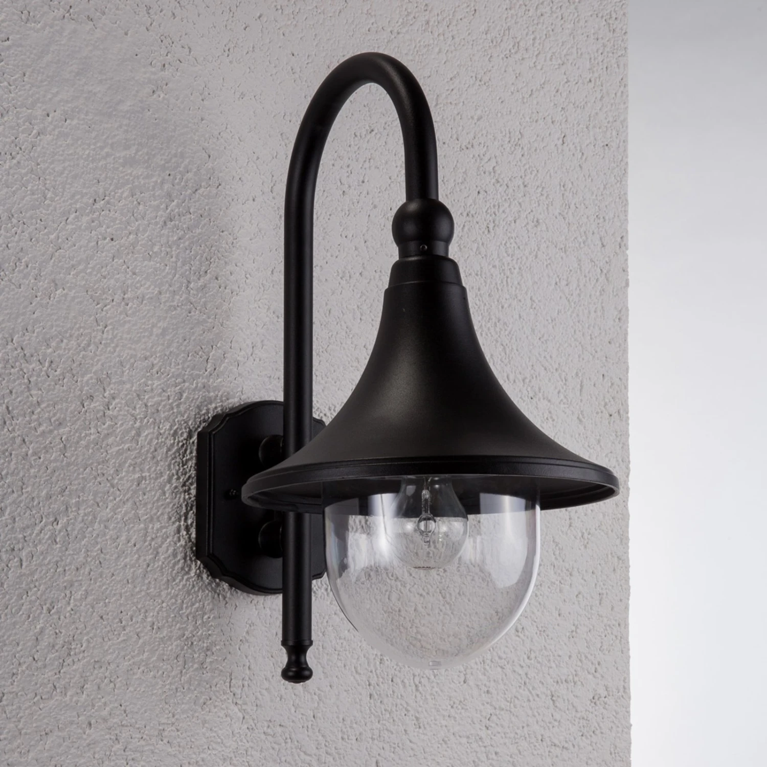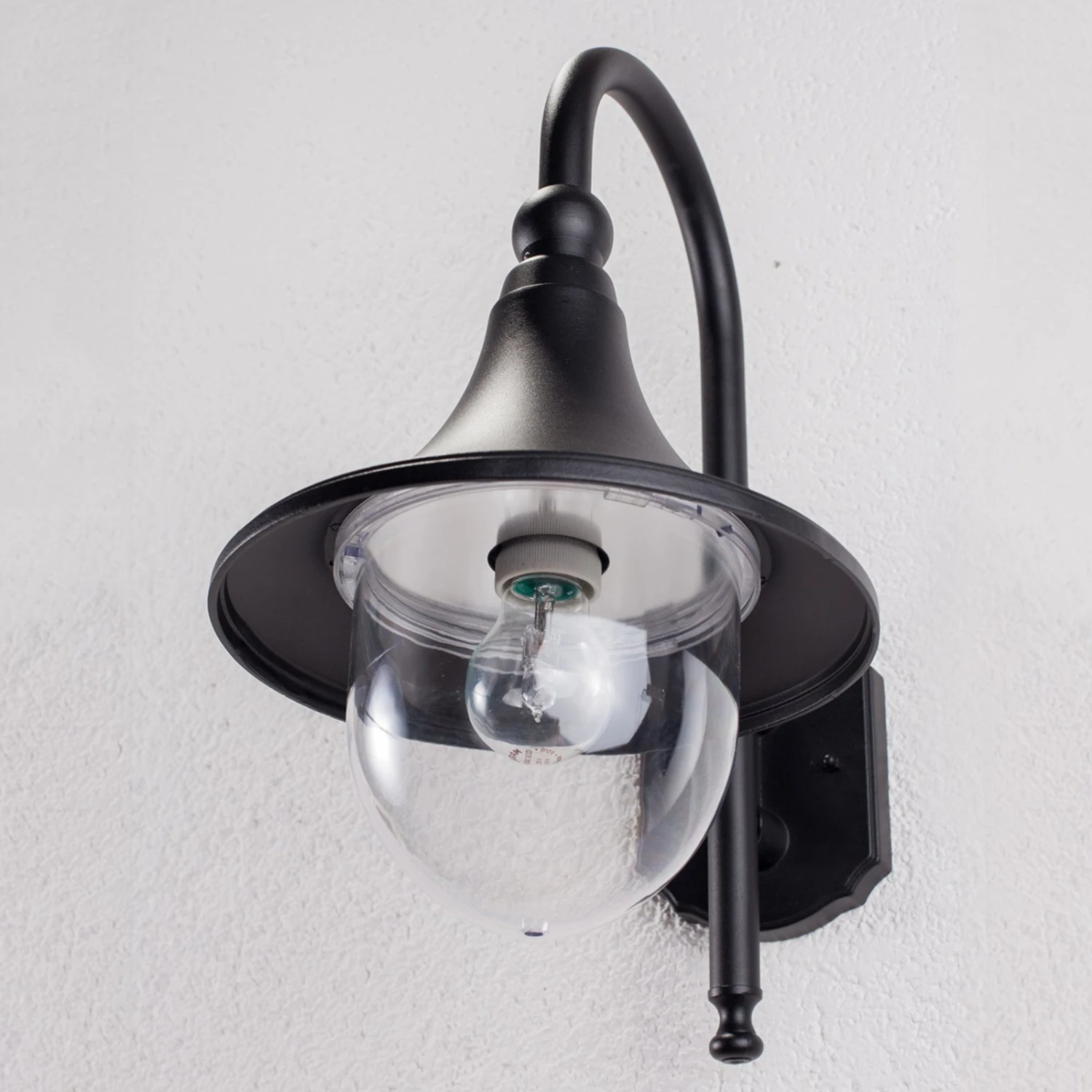 Die Leuchten der Serie Daphne kennzeichnet ein recht zeitloses Design in schlichtem Schwarz. Der Leuchtkopf geht in Form eines Bogens vom Gestell der Außenwandleuchte ab und der Schirm läuft nach unten hin glockenförmig auseinander. Das Leuchtmittel wird von einem klaren Diffusor aus Polycarbonat geschützt, was vor allem für die Robustheit der Leuchte spricht – ein Merkmal, das natürlich im Außenbereich nicht zu unterschätzen ist, denn es kann immer wieder verschiedene Einflüsse, vor allem des Wetters, geben, denen Schirm und Leuchte standhalten müssen. Ausgestattet mit einer E27-Schraubfassung, ist die Auswahl an verwendbaren Leuchtmitteln groß: Klassische Glüh- und Halogenlampen können eingesetzt werden, ebenso ist die Verwendung von energieeffizienteren LED-und Energiesparlampen möglich.
