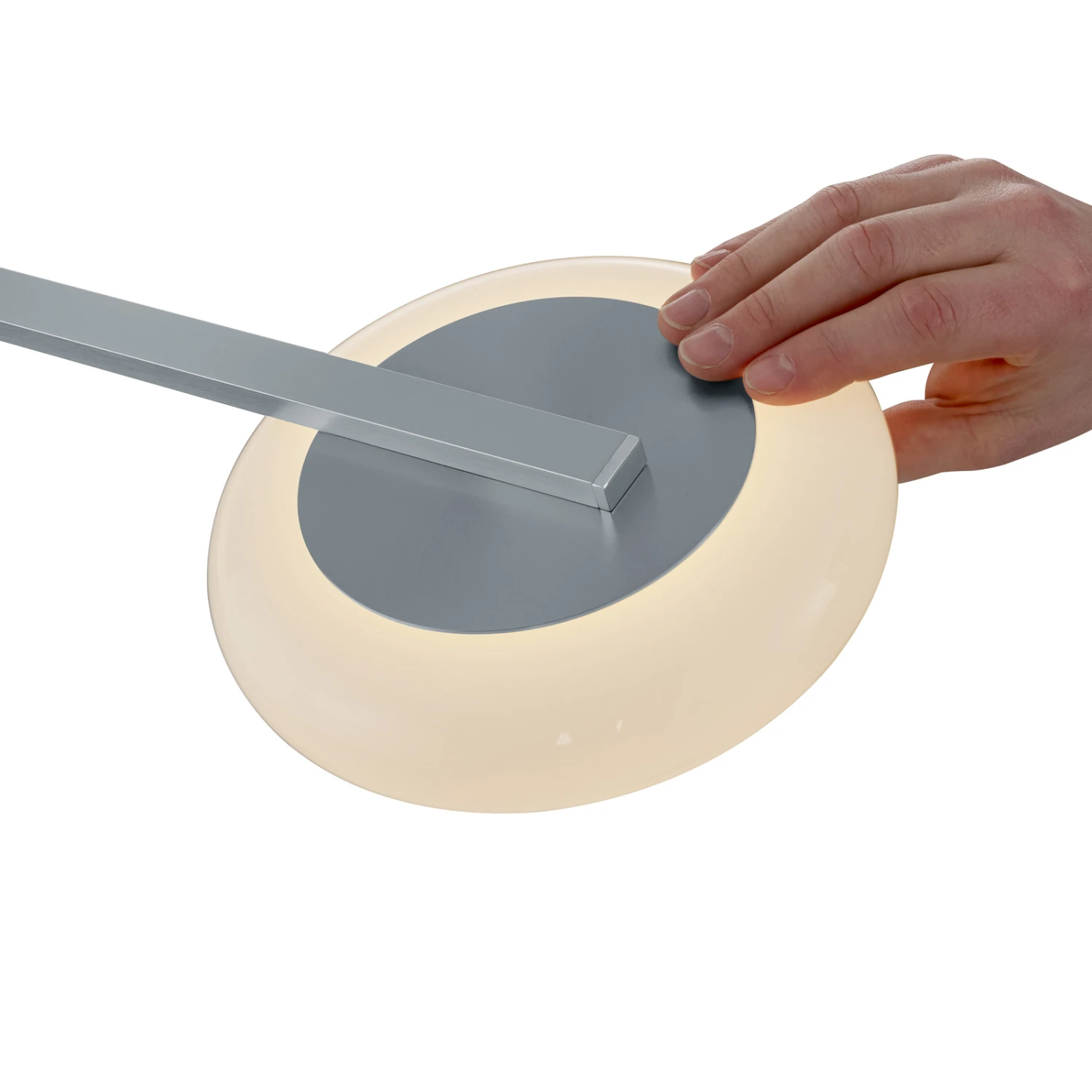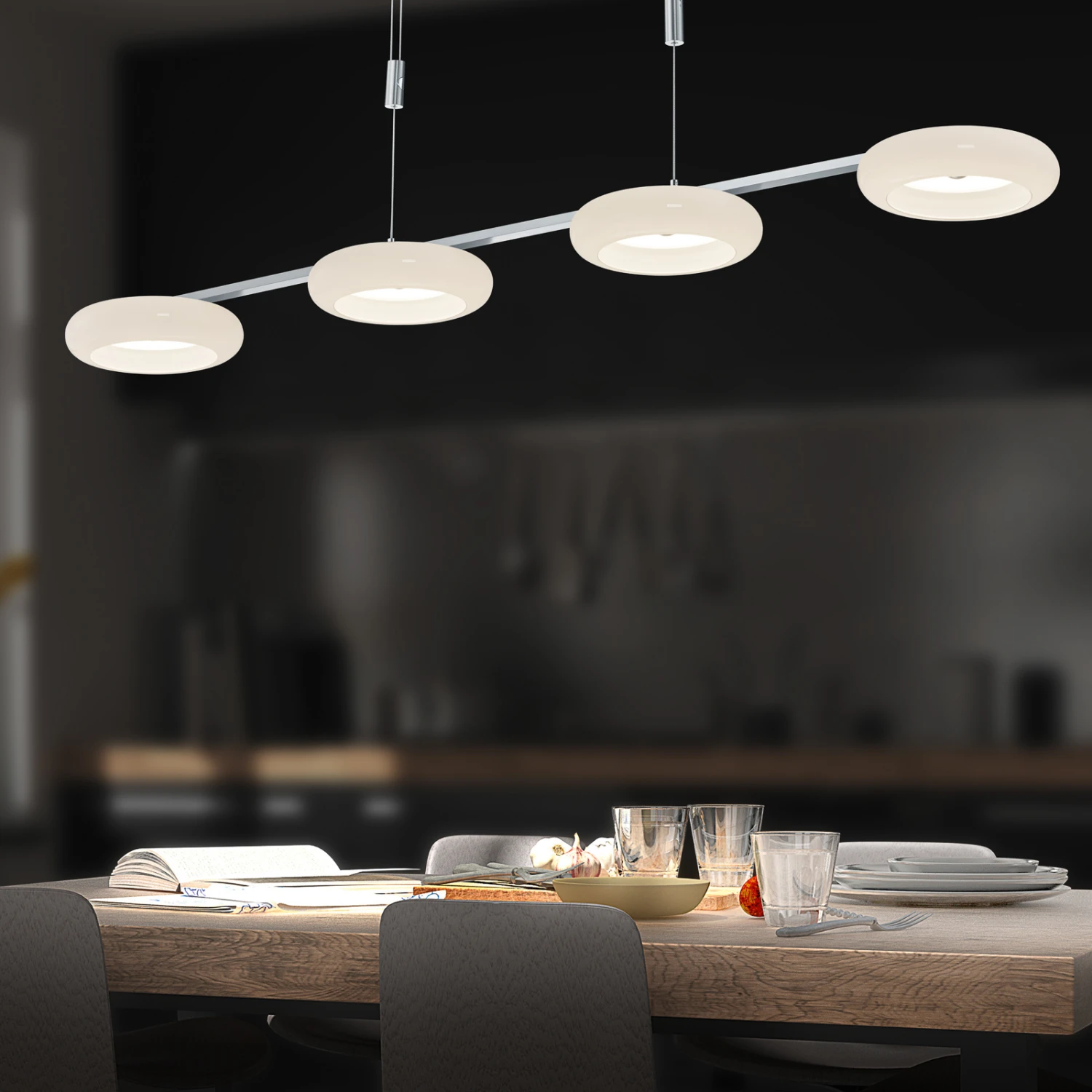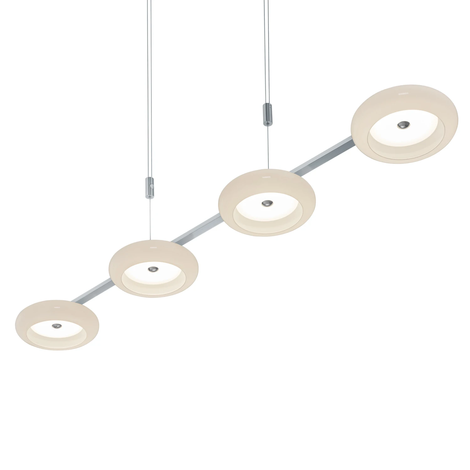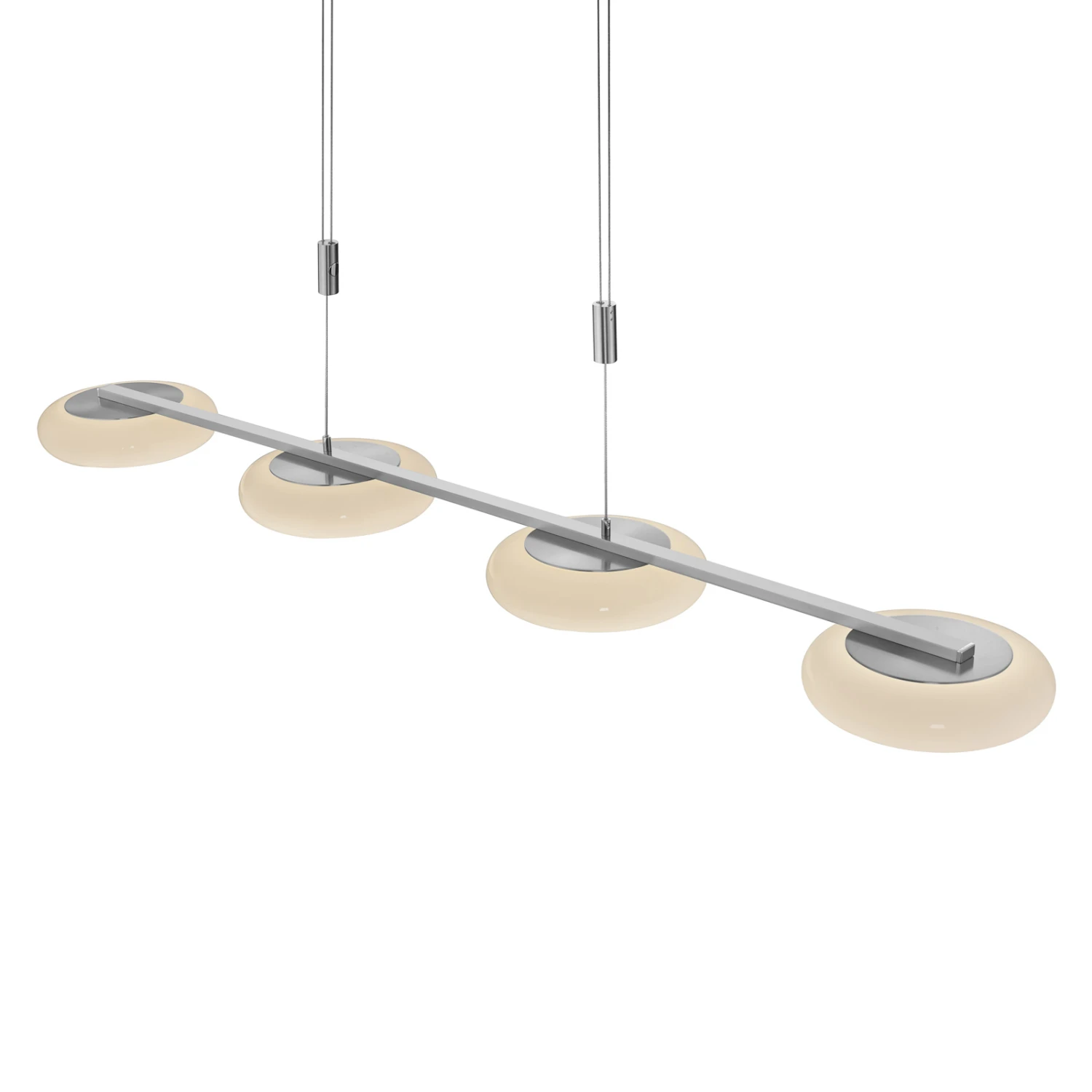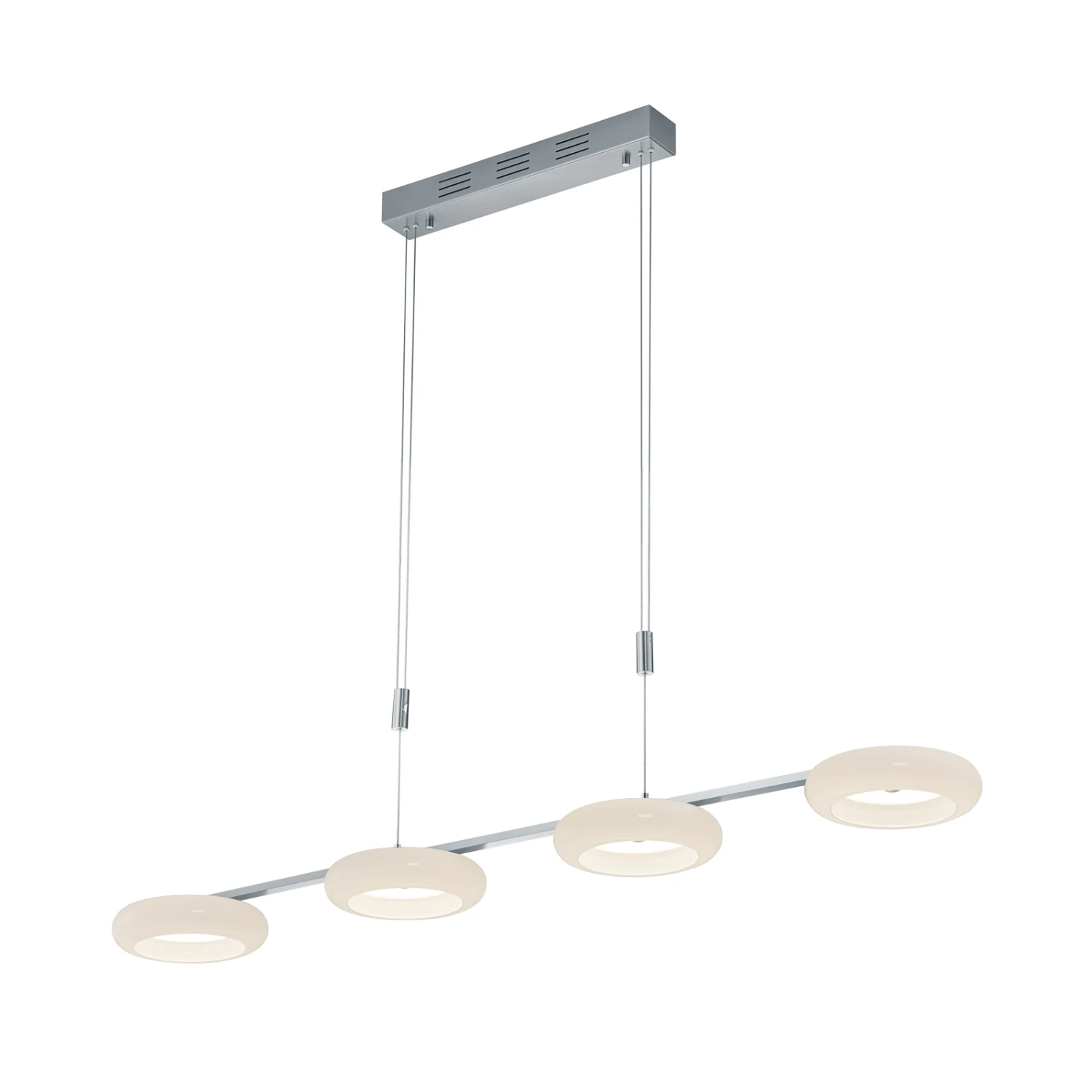 Mit der Kombination aus Glas und Metall, runden und geraden Formen sowie ausgereifter Bedienung ist die vierflammige Pendelleuchte Centa von BANKAMP ein durch und durch moderner Lichtspender. Die Glasschirme sind als Scheiben mit jeweils umlaufendem Ring gestaltet, die regelmäßig unter einem langen Metallbalken angeordnet sind. Letzterer ist farblich mit dem Baldachin und den zur Höhenjustierung dienenden Zugpendeln abgestimmt.