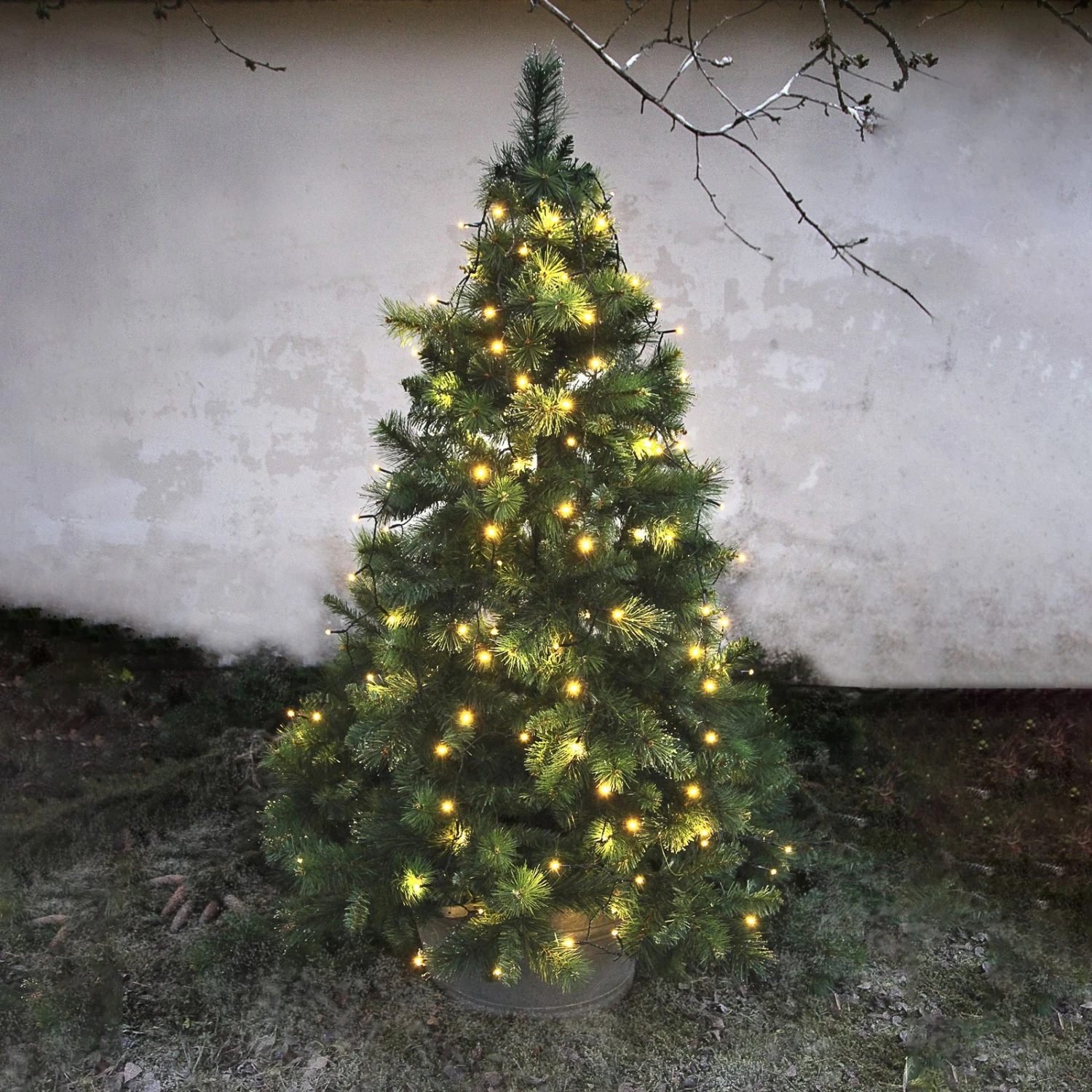 160-flammiger LED-Baumvorhang Treelight Dieser umfassend gearbeitete Baumvorhang mit warmweißer LED-Beleuchtung eignet sich für die Anbringung an Bäumen mit einer Höhe von 180 bis 200 cm Höhe. Die 160 LEDs verteilen sich auf acht Stränge, so dass eine perfekte Rundum-Illumination gewährleistet ist. Treelight ist mit Spritzwasserschutz (IP44) ausgestattet und deshalb für Außenbereiche wie Garten, Balkon oder Terrasse bestens geeignet. Fünf Meter Zuleitung mit Transformator sind in der Lieferung enthalten.