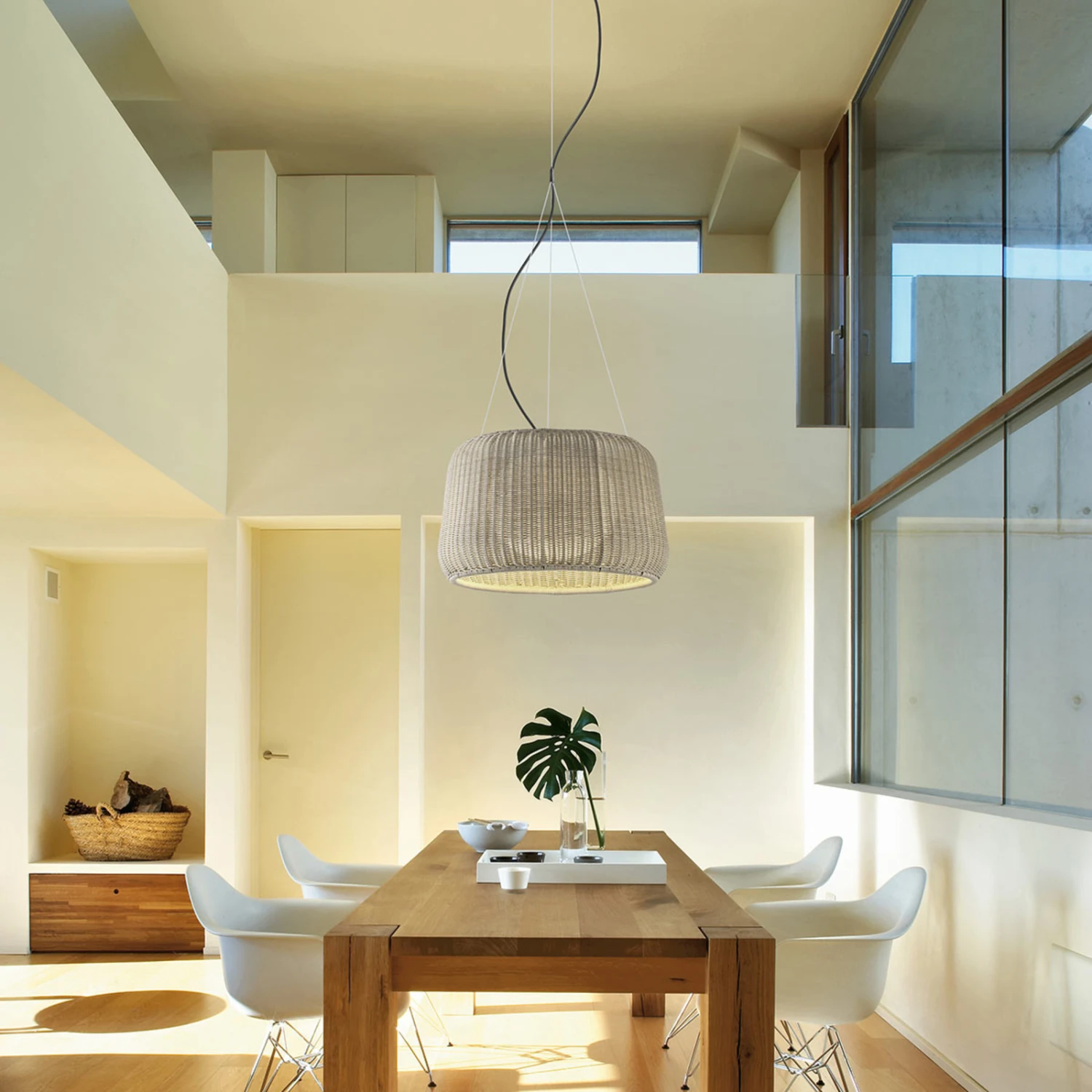 In mühevoller Handarbeit entstand der Schirm dieser prachtvollen Außenhängeleuchte, die mit ihrem synthetischen Korbgeflecht jeglichen Witterungen trotzt. Sie verleiht nicht nur privaten Außenanlagen Stil und Charme, sondern vor allem auch gewerblichen Bereichen, wie etwa Cafés, Restaurants o. Ä. Bereits ausgeschaltet sorgt sie durch ihre anspruchsvolle Gestalt für mediterranes Flair, das eingeschaltet durch die im Inneren verbaute Polyethylen-Ellipse wunderbar verstärkt wird. Denn diese beherbergt nicht nur das einzusetzende Leuchtmittel, sondern sorgt zudem für eine blendfreie sowie allseitige Lichtausstreuung.