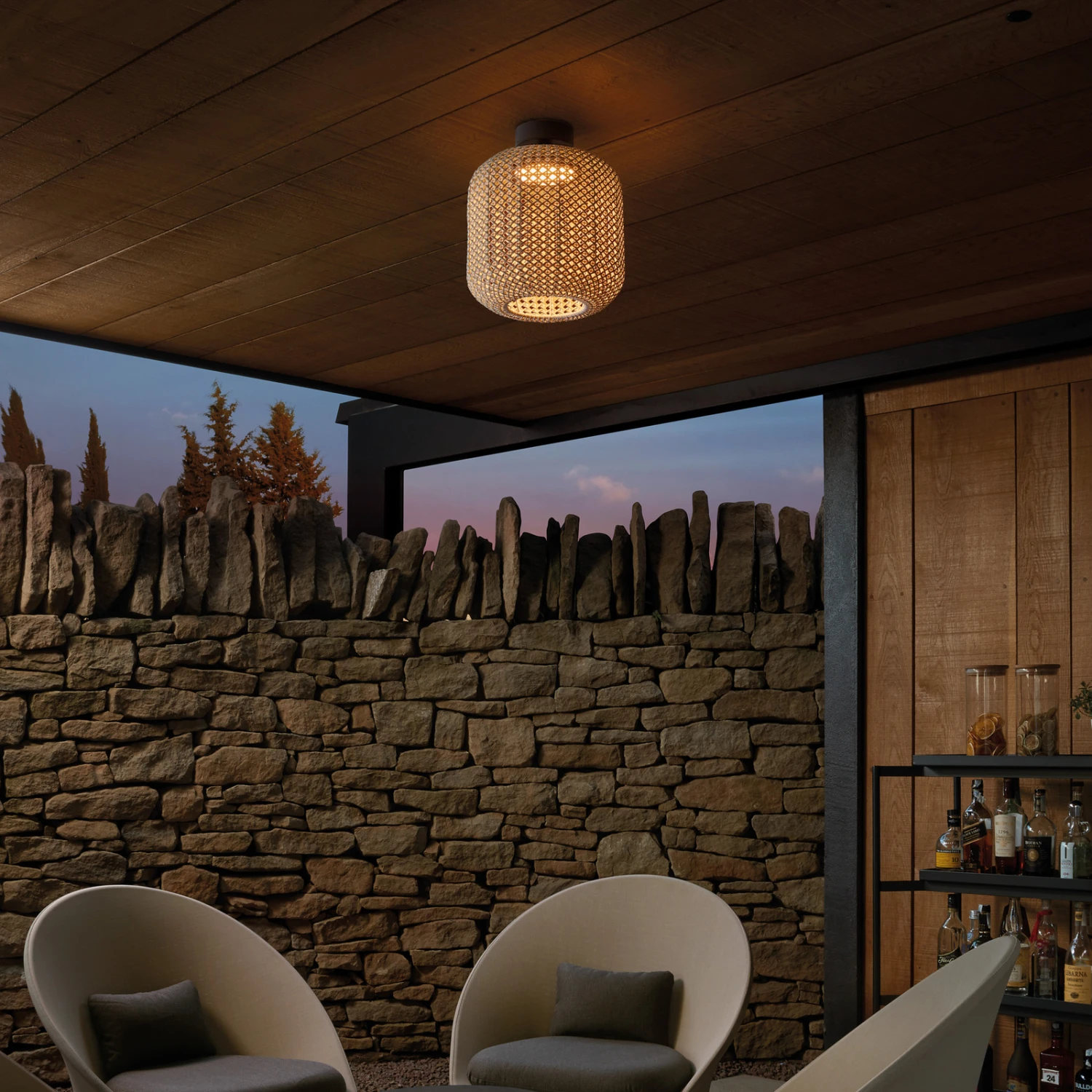 Die Deckenleuchte Nans hat einen Schirm aus einem Flechtgewebe, das aus synthetischen Fasern besteht. Die Schutzart IP54 schützt die Leuchte vor Feuchtigkeit und Staub, so dass sie problemlos im Außenbereich, also in Pavillons, auf der Terrasse oder dem Balkon einsetzbar ist.
