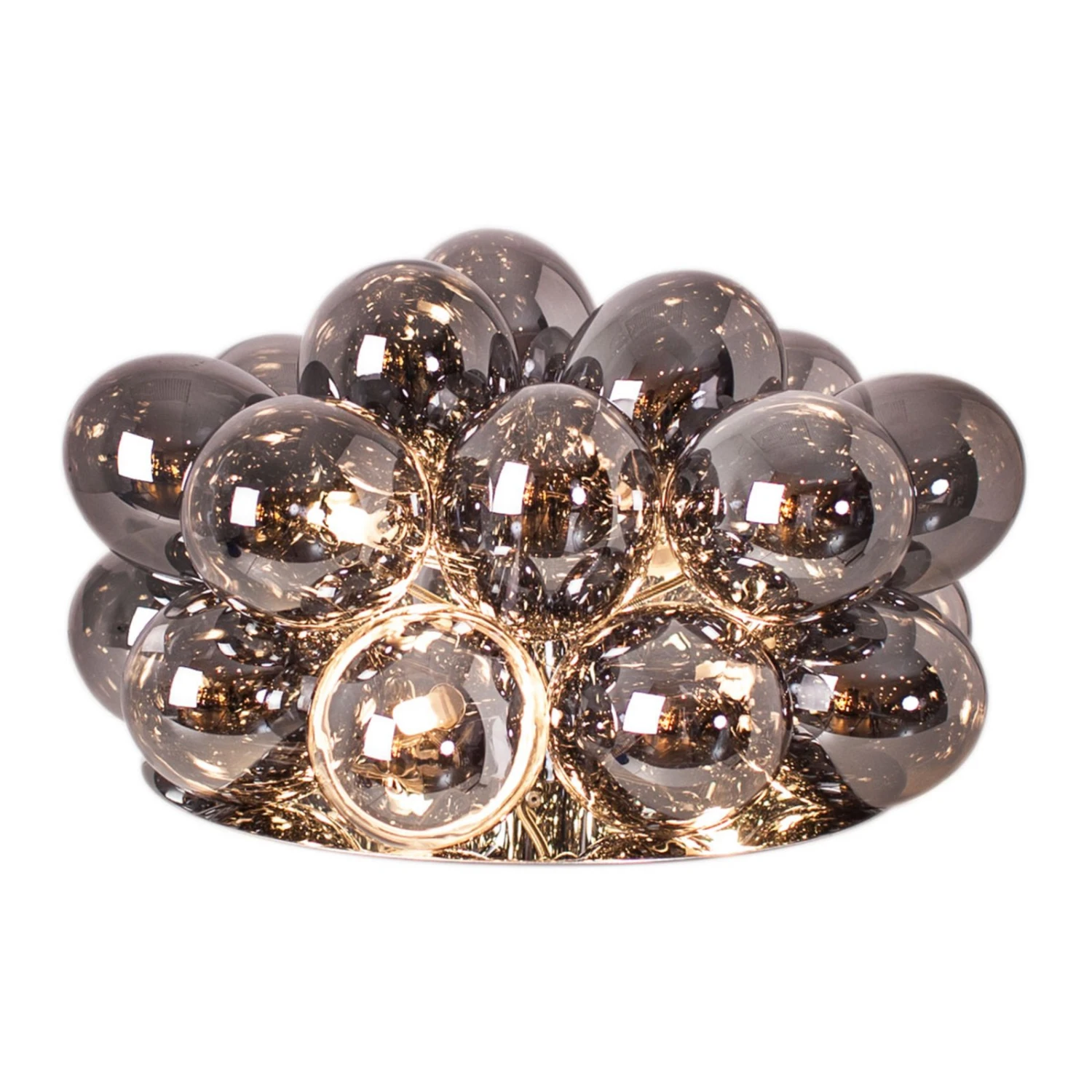 Die Tischleuchte Gross ist Blickfang in jedem Raum, denn sie besteht aus feinen Glaskugeln, die sorgfältig auf einem runden, tablettähnlichen Leuchtenfuß platziert sind. Die Glaskugeln sind in der Farbe Rauchgrau eingefärbt und lassen eine gemütliche Lichtstimmung entstehen. Beleuchtet werden die Kugeln von G9-Leuchtmitteln eigener Wahl.
