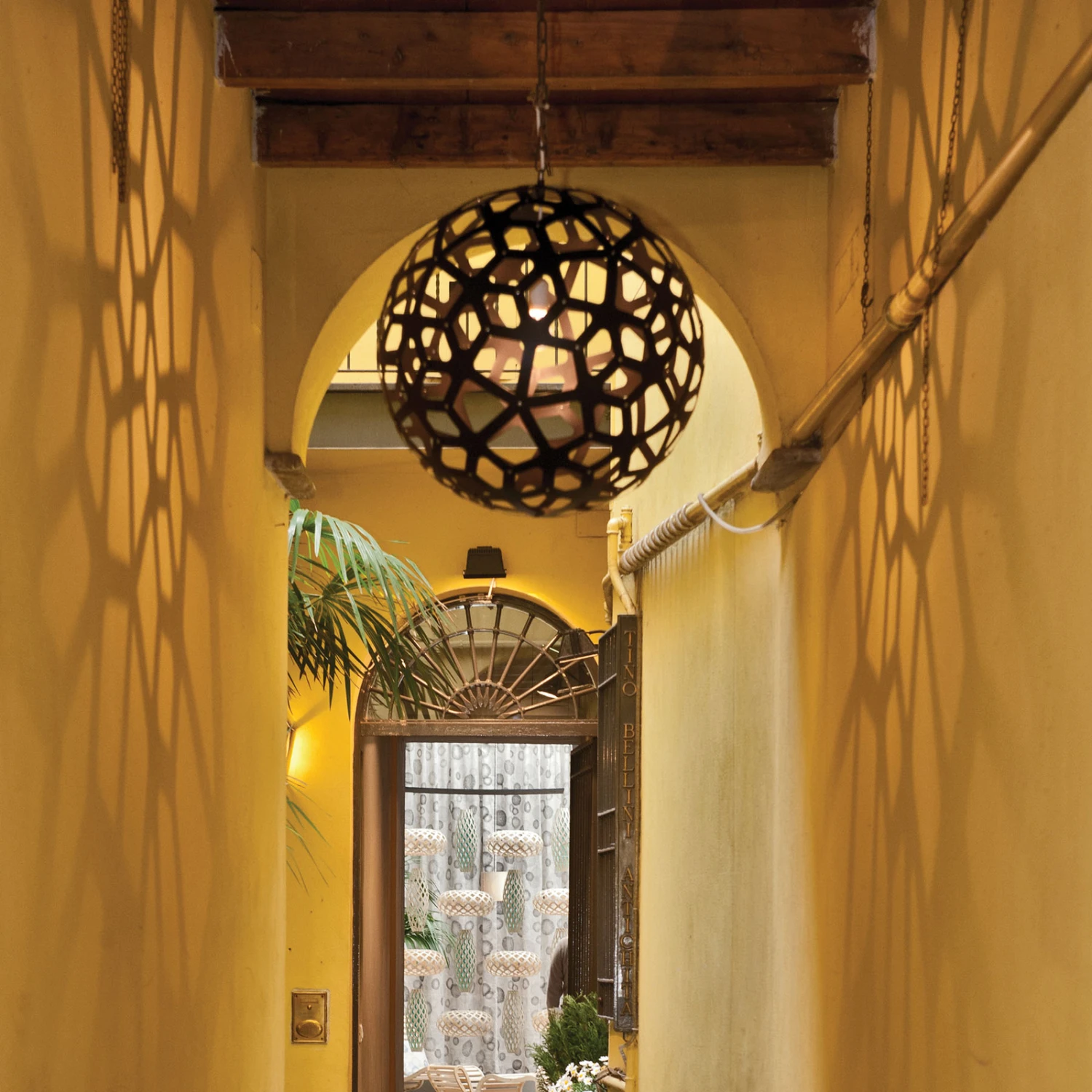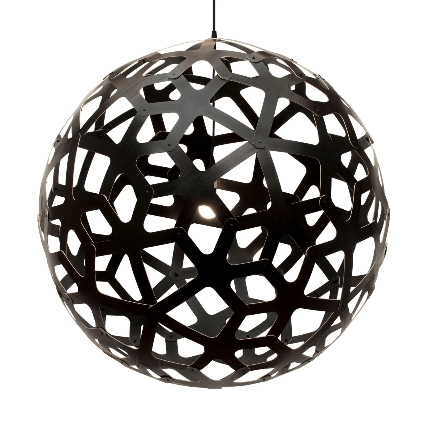 Die Hängeleuchte Coral eignet sich ausgezeichnet für die Grund- und Bereichsbeleuchtung. Da das eingesetzte Leuchtmittel durch die Auslassungen im Schirm sichtbar bleibt, empfiehlt es sich, z. B. mit einer Filamentlampe den dekorativen Reiz noch zu erhöhen. Passende Leuchtmittel können über das Zubehör erworben werden.