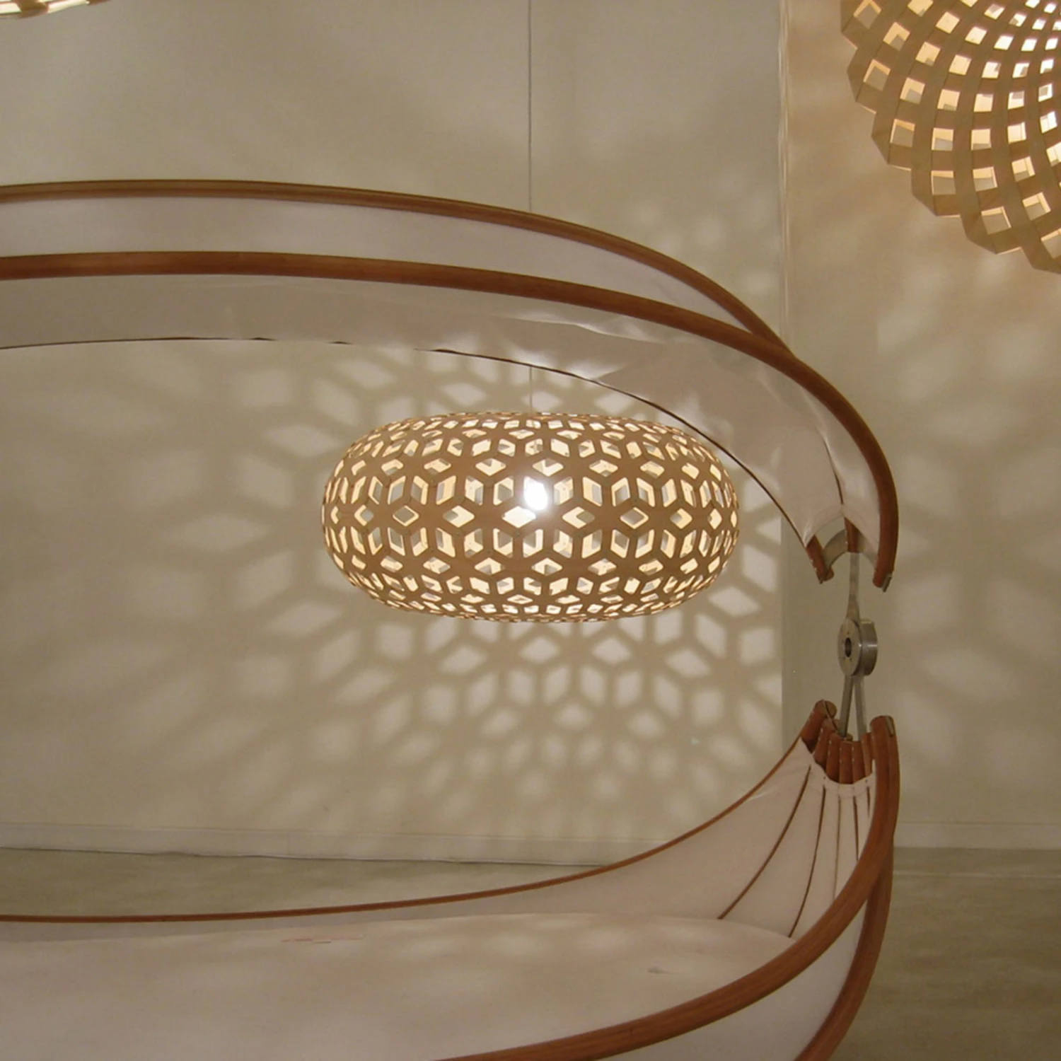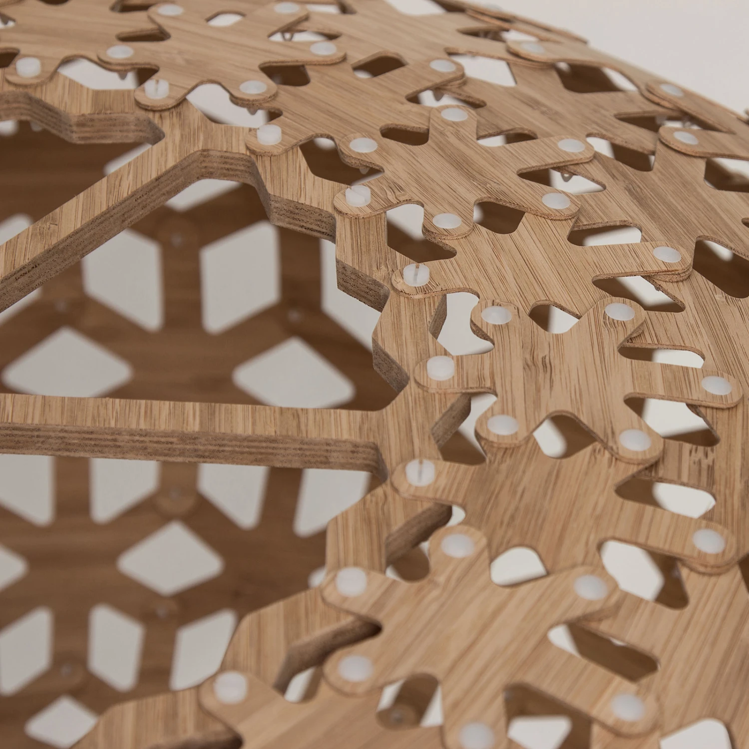 Dem aus England stammenden und heute in Neuseeland ansässigen Möbel- und Leuchtendesigner David Trubridge kam die Idee zu dieser fantastischen Hängeleuchte auf einer Reise in die Antarktis, wo er als Gastkünstler geladen war. Der Schirm ist aus sich wiederholenden geometrischen Mustern von der Form einer Schneeflocke gestaltet. Das Prinzip beim Leuchtenaufbau ist dasselbe wie bei Trubridges Designklassiker Coral. Auch bei Coral benutzte er dieses dünne Bambusfurnier, so entsteht die weiche Krümmung beim Zusammenbau des Schirms. David Trubridge legt nicht nur bei der Auswahl der Materialien für seine Kreationen großen Wert auf die Nachhaltigkeit, er will auch einen möglichst niedrigen CO2-Verbrauch bei der Versendung seiner Produkte gewährleisten. Deshalb wird auch die Hängeleuchte Snowflake in Einzelteilen geliefert. Eine präzise Anleitung für den leichten Zusammenbau liegt bei.