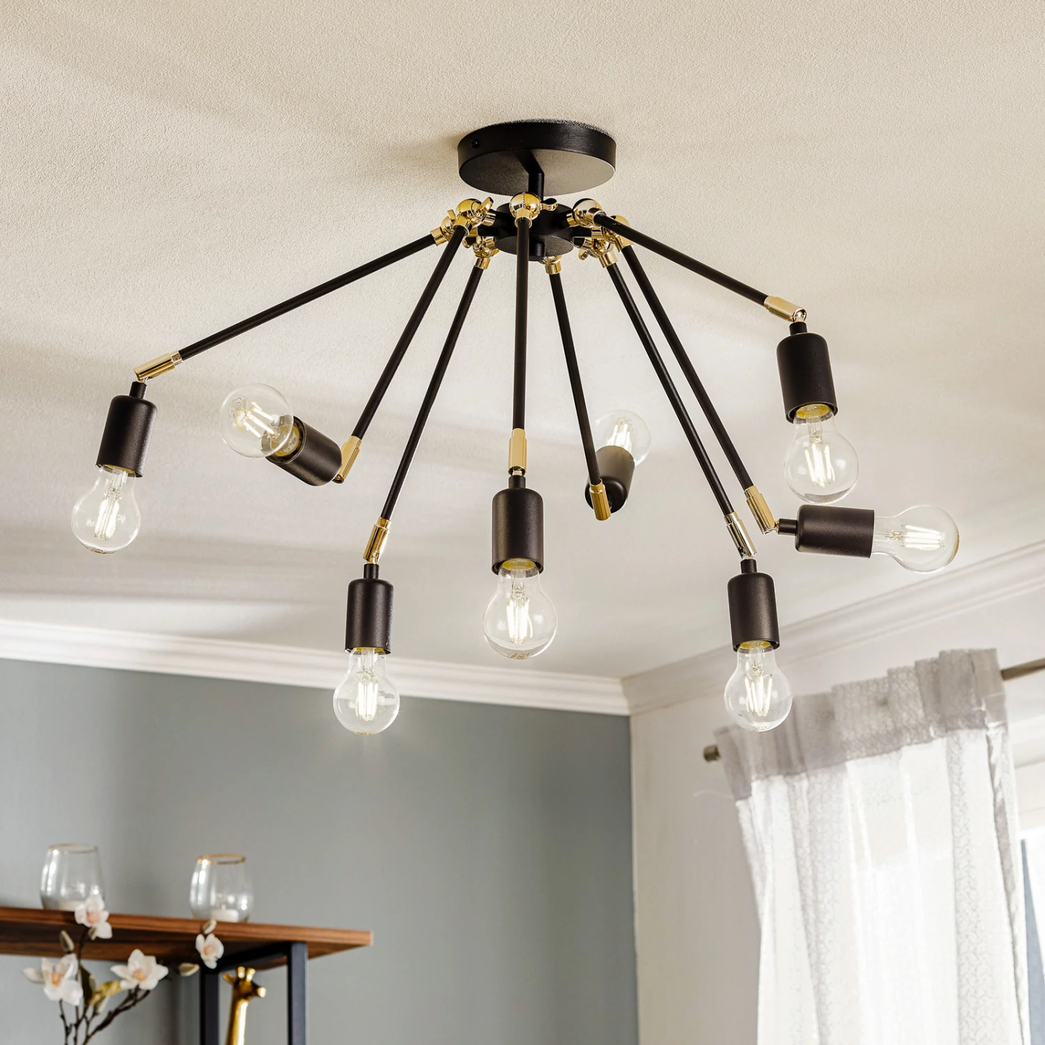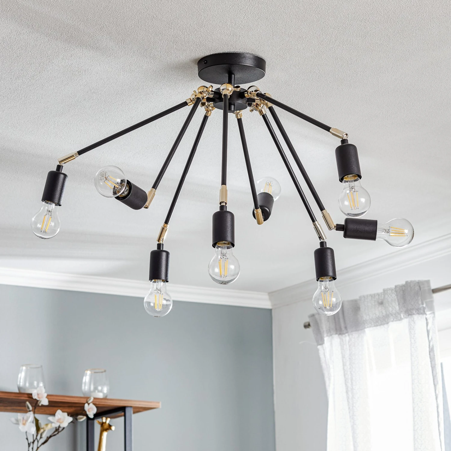 Dank ihres großen Durchmessers sowie der flexiblen Einstellmöglichkeit der Lichtausrichtung der acht Leuchten garantiert die Deckenlampe Stik eine umfassende Umgebungsbeleuchtung, auch in größeren Räumen. Durch das Schwenken der Fassungen bleibt kein Winkel des Raumes unbeleuchtet. Auch mit der Wahl der Leuchtmittel lässt sich die Optik weiter positiv beeinflussen. Besonders dekorativ wirken Globeleuchtmittel in Kohlefadenoptik, wie sie über das Zubehör separat erhältlich sind. Die Leuchtmittel gehören nicht zum Lieferumfang der Leuchte.