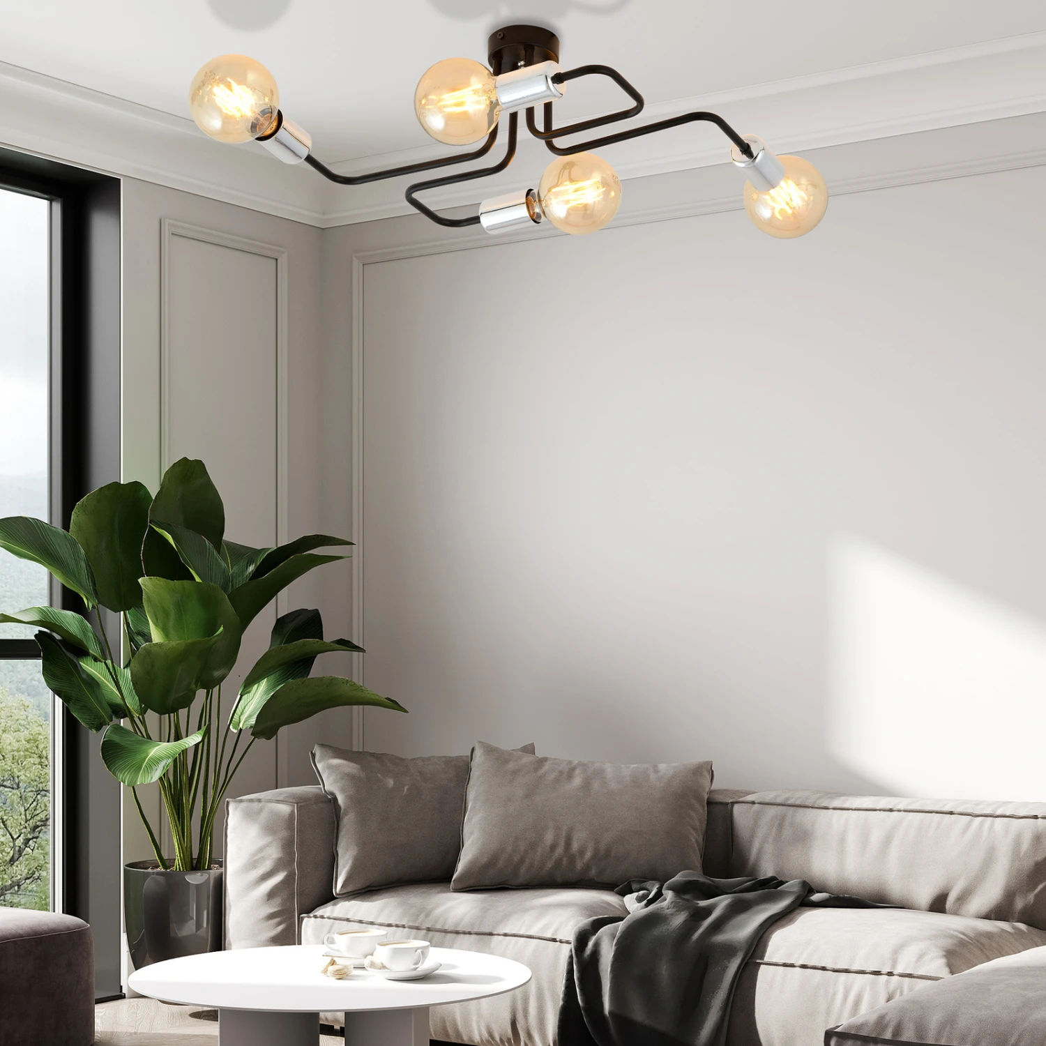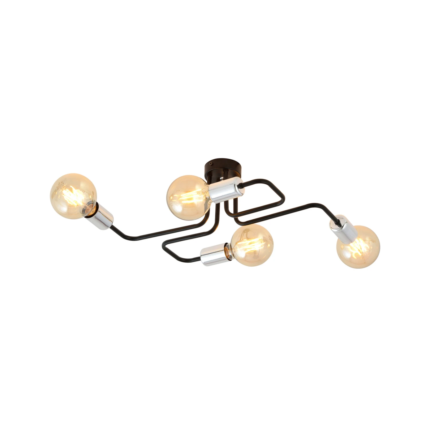 Mit dieser Deckenleuchte lassen sich Wohnräume und Flure mit einer nach allen Seiten reichenden, stimmungsvollen Umgebungsausleuchtung ausstatten. Vier Metallarme in Schwarz gehen von dem runden Baldachin aus in alle Richtungen. Die Arme sind jeweils mit einer in einem Metallton lackierten Fassung bestückt, was der Optik einen luxuriösen Touch verleiht. Die schönste Wirkung, was Optik und Lichtstimmung betrifft, erzielt Veken 4, wenn als Leuchtmittel Globelampen verwendet werden.