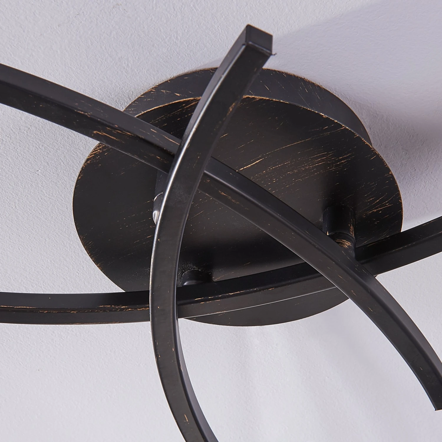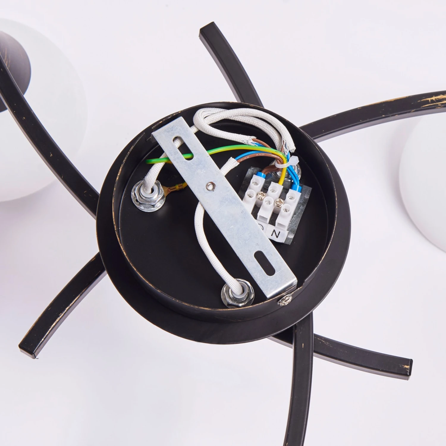 Della besteht zu einen aus den weißen Schirmen mit Alabastertönung, zum anderen aus einem interessant geformten Gestell, das sich aus drei bogenförmigen Armen zusammensetzt. Diese Leuchtenarme sind wie auch die Deckenhalterung schwarz lackiert und haben ein goldfarbenes Bürstenfinish, was nicht nur elegant aussieht, sondern die Deckenlampe auch etwas rustikaler erscheinen lässt.