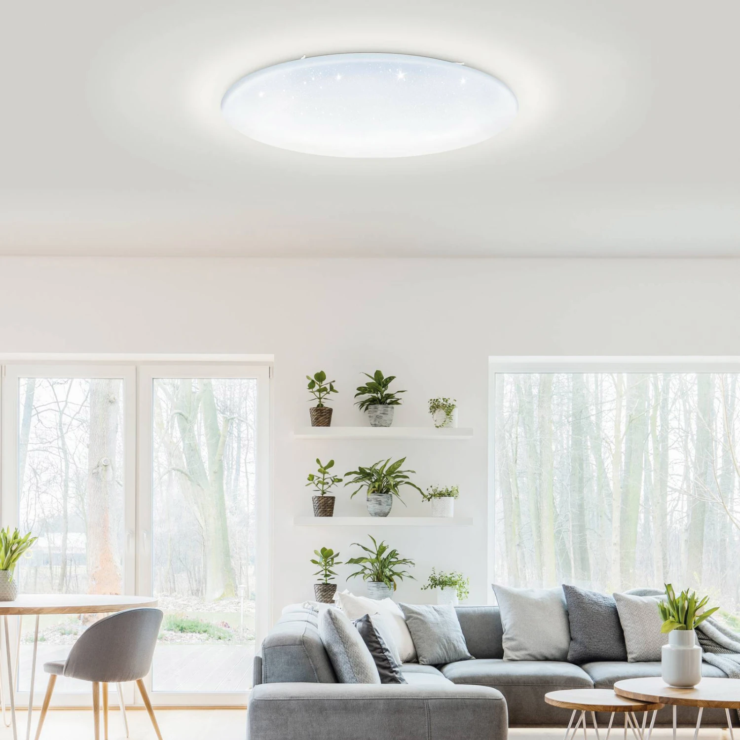Die LED-Deckenleuchte Totari-C besteht aus einem Kunststoffdiffusor in Weiß, der mit einem glanzvollen Kristalleffekt versehen ist. Ihre runde, flache Form integriert sie fließend an jeder Decke und ermöglicht auch die Anbringung in niedrigen Räumen. Ob als Schlafzimmerbeleuchtung oder auch im Flur – durch ihre vielfältigen Einstellungsmöglichkeiten kann Totari nahezu überall zum Einsatz kommen. Mithilfe der mitgelieferten Fernbedienung oder über das Smartphone via AwoX App kann die Leuchte gesteuert werden. Die Einstellbarkeit der Helligkeit, sowie der Lichtfarbe machen die Deckenlampe zu einem flexiblen Beleuchtungselement. Auch die Integration in Gruppen, Zeitplänen oder Szenen ist dank der App möglich. So kann einfach und bequem das eigene Zuhause zu einem smarten Erlebnis gestaltet werden. Die moderne Steuerungsmöglichkeit erleichtert den Alltag und lässt das Lichtkonzept perfekt auf eigene Bedürfnisse abstimmen.