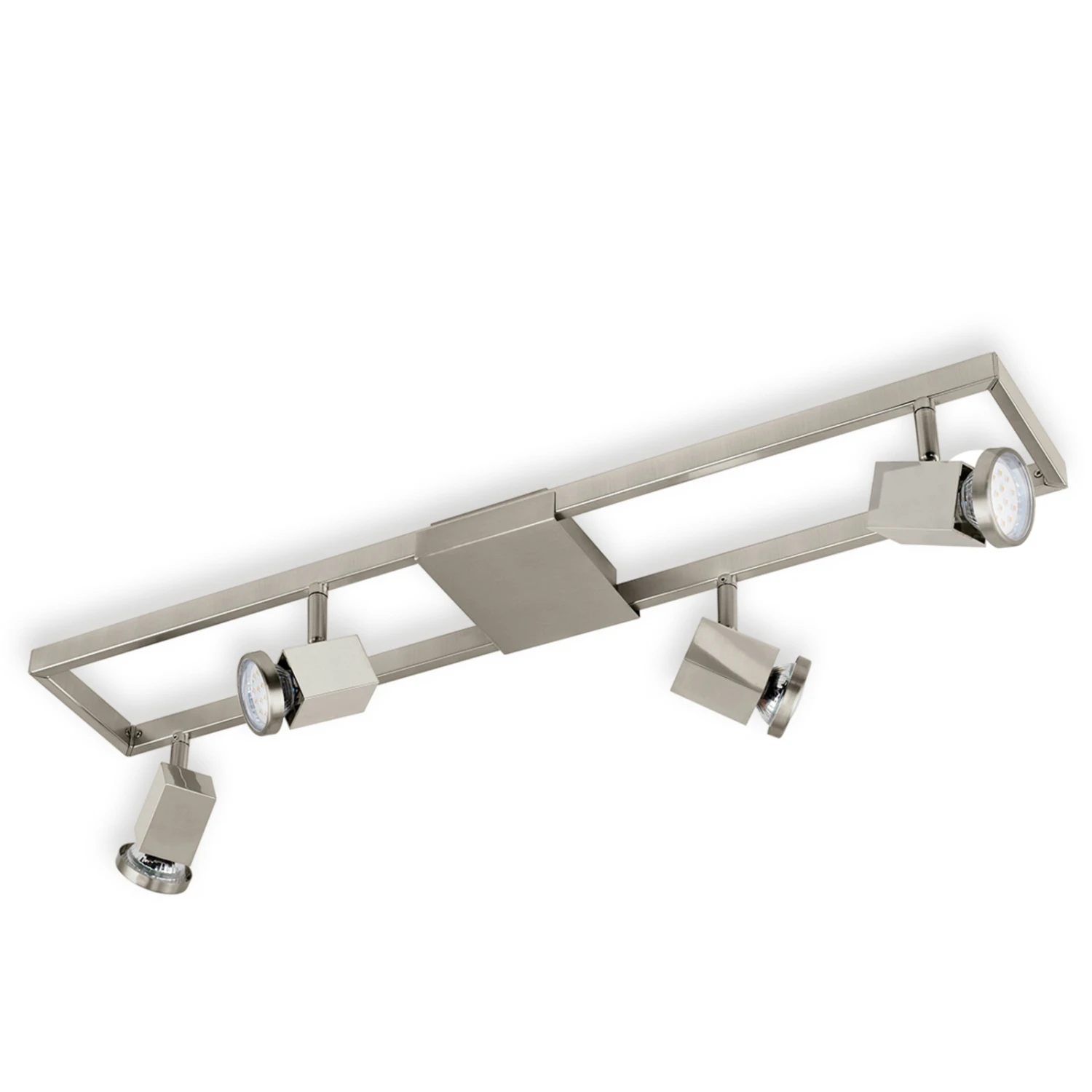 Kantig und sehr modern präsentiert sich der vierflammige LED-Deckenstrahler Zeraco. Auf jeder Seite des rahmenförmig gearbeiteten Gestells lassen sich zwei Spots gezielt ausrichten. Der Deckenstrahler wird mit austauschbaren LED-Leuchtmitteln (Fassung GU10) geliefert, die in der Lichtfarbe Warmweiß leuchten. Wohnräume, Flure etc. lassen sich mit dem Deckenstrahler Zeraco auf energiesparende Weise erhellen.