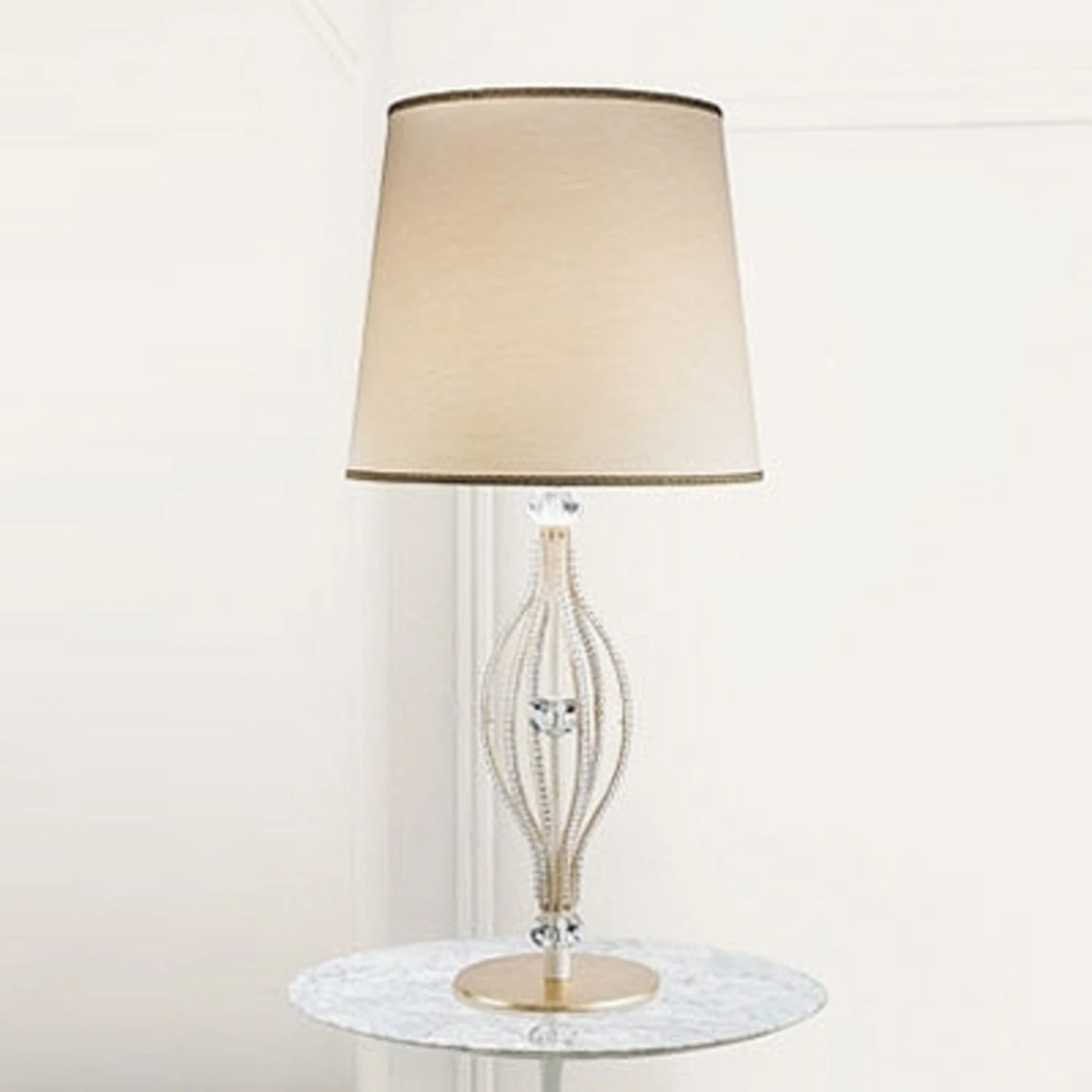 Durch den Lampenschirm aus elfenbeinfarbenem Shantung-Gewebe entsteht eine schöne Lichtwirkung im Raum und sehr edel wirken auch die zahlreichen Perlen aus transparentem Glas, die das bauchige Gestänge zieren.