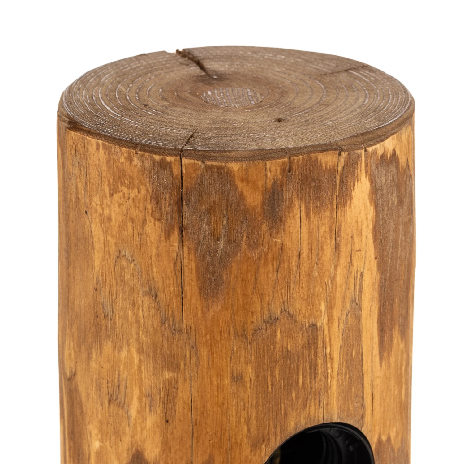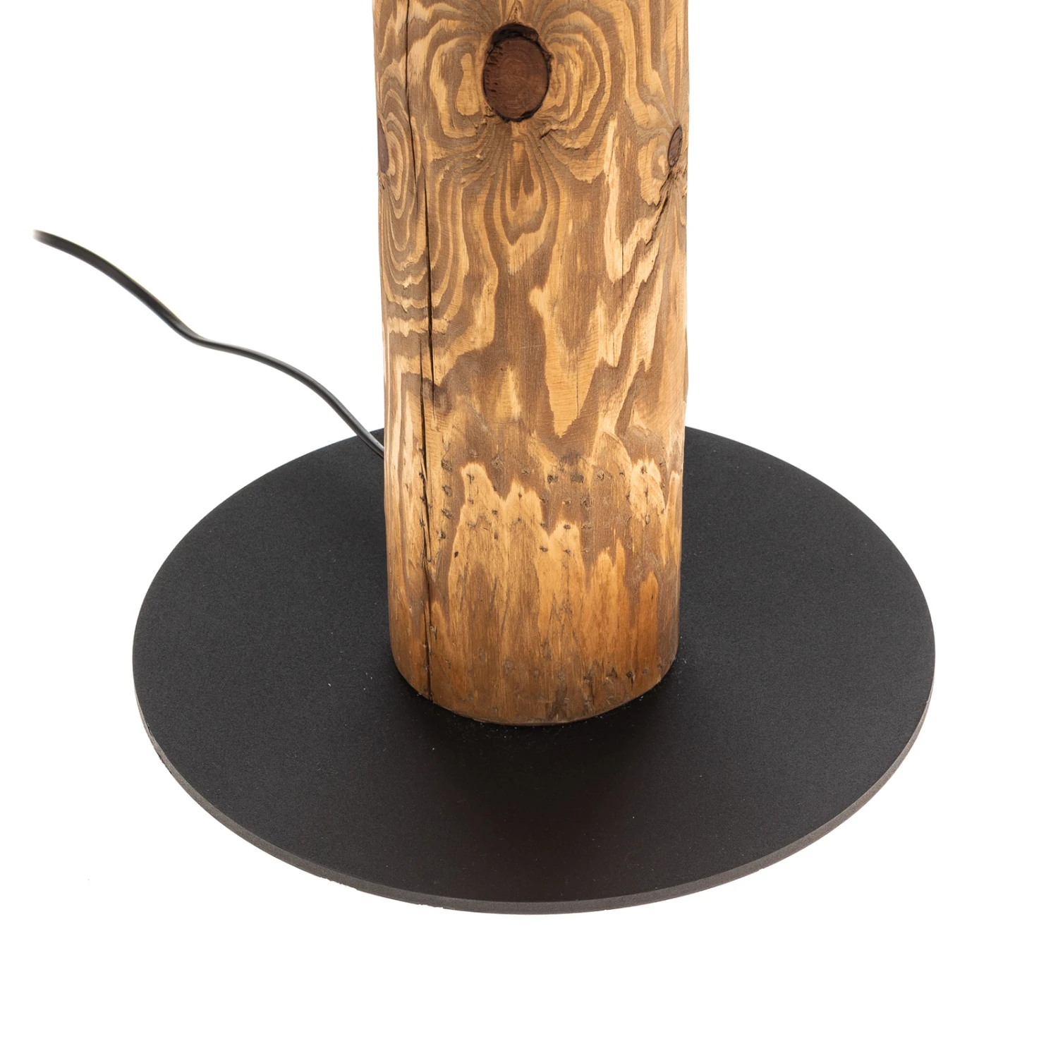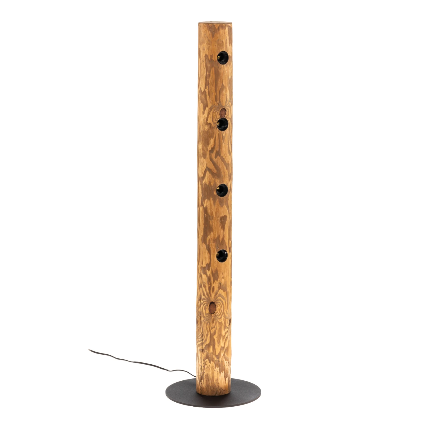 Die Stehleuchte Beam überzeugt mit ihrer Kombination aus schlicht-moderner Formgebung und natürlicher Ausstrahlung. Den Korpus bildet ein hoher, zylindrischer Balken aus geschältem und hell gebeiztem Kiefernholz, der auf einem flachen, runden Standfuß aus schwarz lackiertem Metall angebracht ist. Vier Lampenfassungen sind zu einer Seite am Balken integriert und können ideal mit dekorativen Filamentlampen bestückt werden.