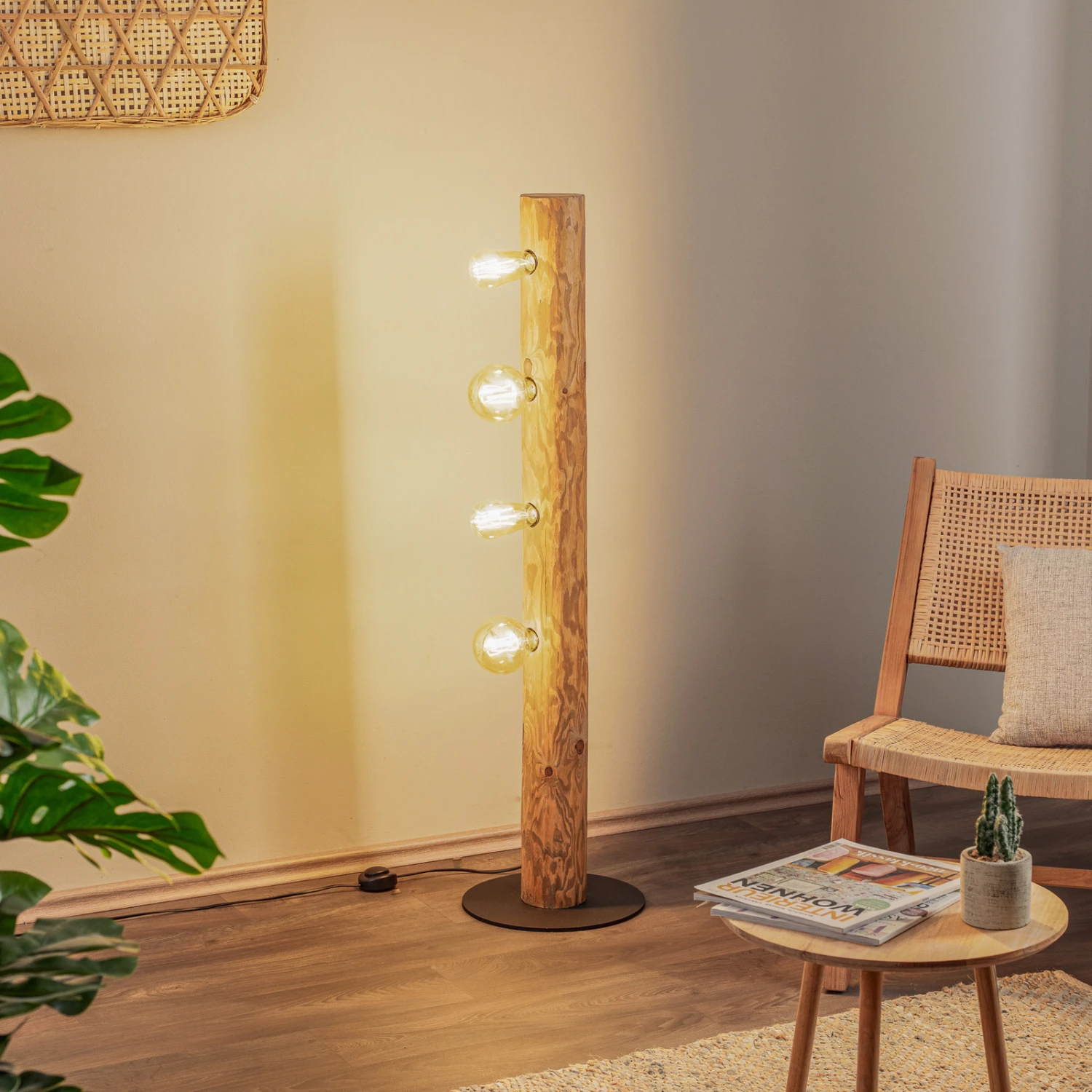 Stehleuchte Beam – Balken aus hellem Kiefernholz mit vier seitlichen Fassungen