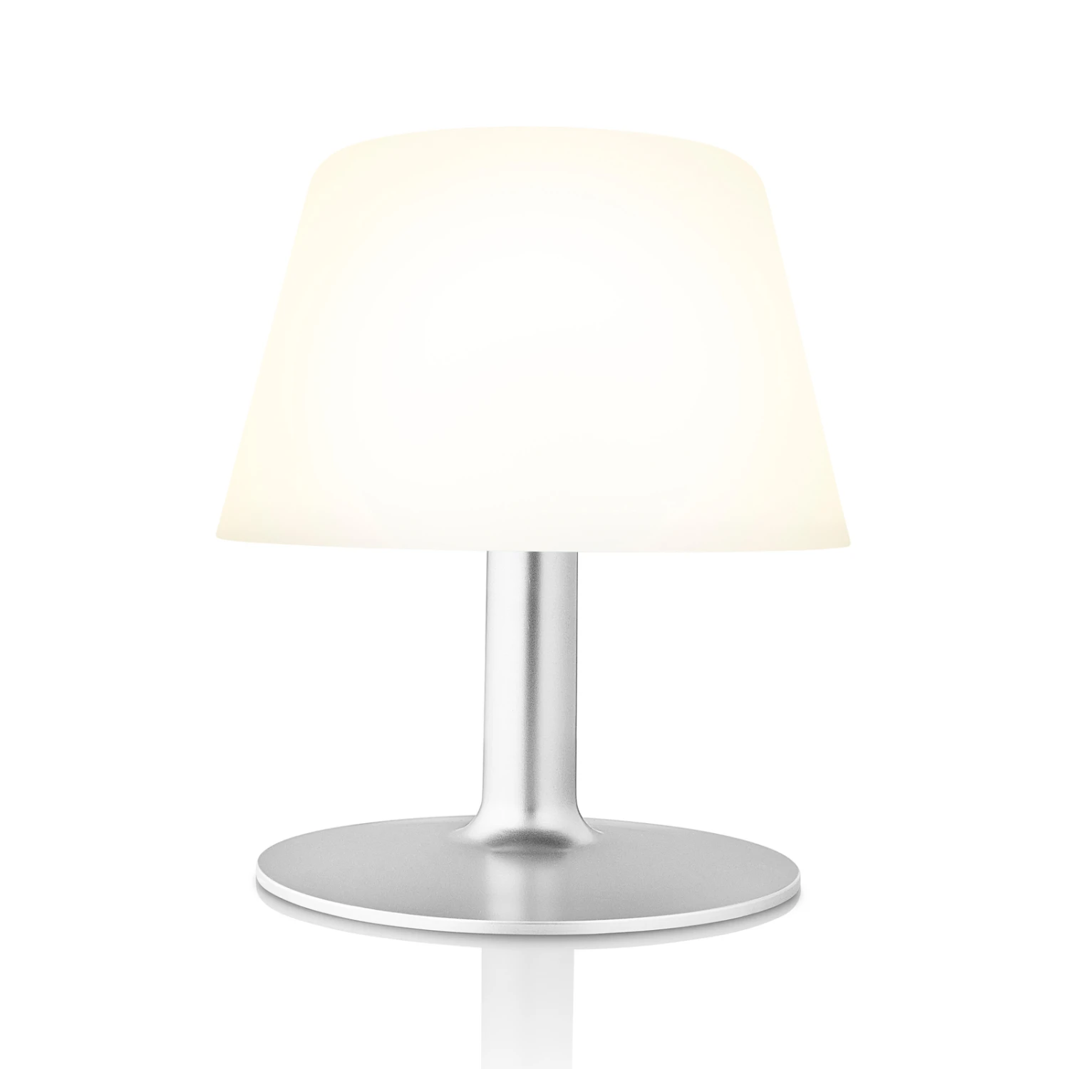 Aus einem Fuß aus silbern lackiertem Stahl und einem Schirm aus opalweißem Kunststoff setzt sich die LED-Solar-Tischleuchte SunLight zusammen. Sie ist sowohl staubdicht als auch gegen Strahlwasser geschützt und wird so zur dekorativen Lichtquelle auf der Terrasse oder dem Balkon. Da ein Solarpanel und Akkus integriert sind, lässt sie sich ohne zusätzliche Stromquelle nutzen.