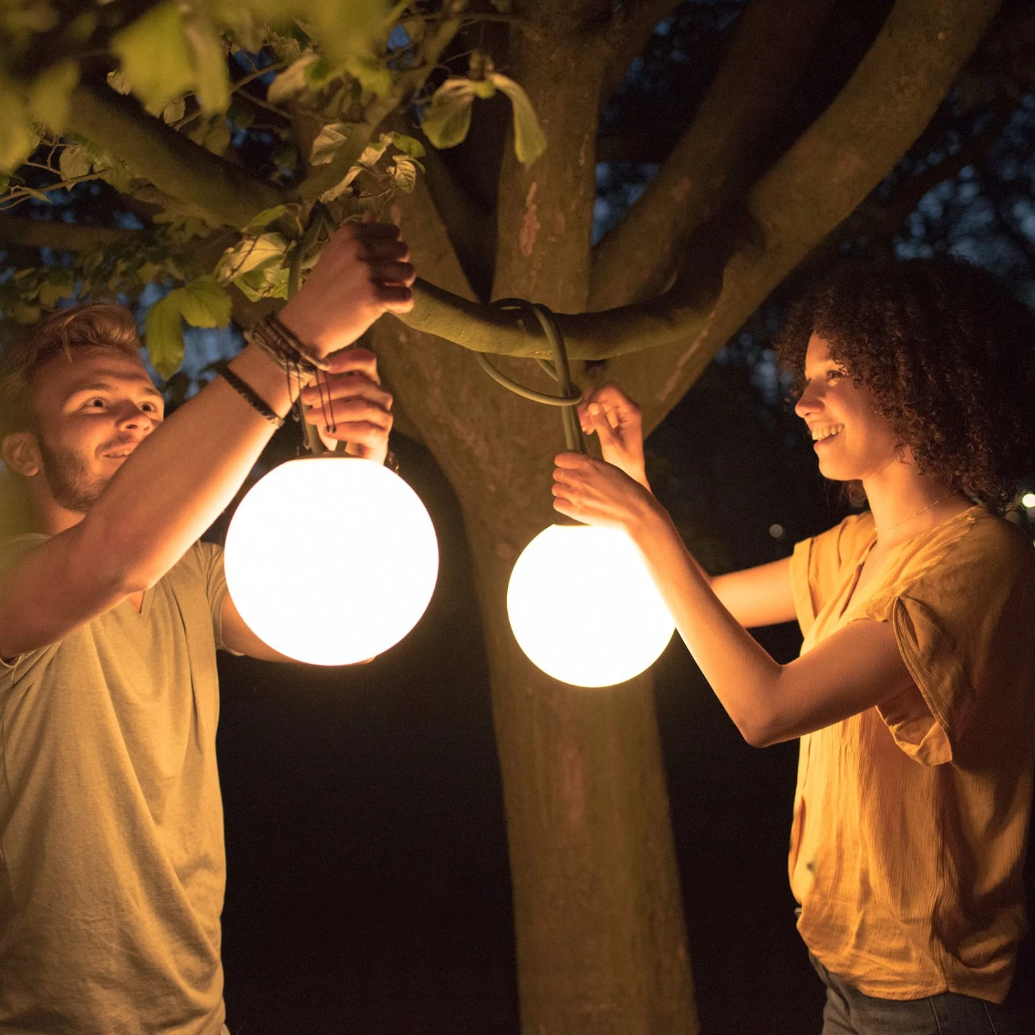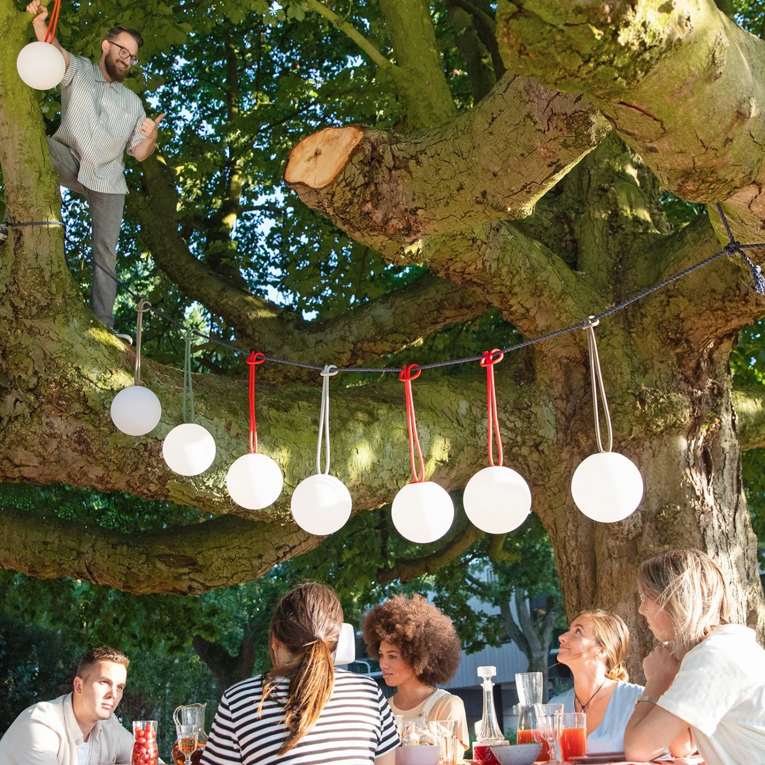 Der runde Diffusor mit opaler Außenfläche zaubert ein sanftes und gleichmäßiges Licht in alle Richtungen. Dank der Schutzkart IP55 ist sie vor Staub und Strahlwasser bestens geschützt, was sie zur idealen Lichtquelle für den Außenbereich macht – gleichwohl kann sie aber auch in Innenräumen für ein stimmungsvolle Beleuchtung sorgen. Die Außenseite wurde komplett aus Kunststoff hergestellt, während die Innenseite mit einer Aluminium-Sockelplatte und einem LED-Gehäuse versehen wurde. Die farbige Schlaufe besteht aus Silikonkautschuk. Die durchdachte und einfache Formgebung der LED-Kugelleuchte stammt von der Designerin Nathalie Schellekens, die im Jahr 2006 das Designstudio Studio ONS gründete.