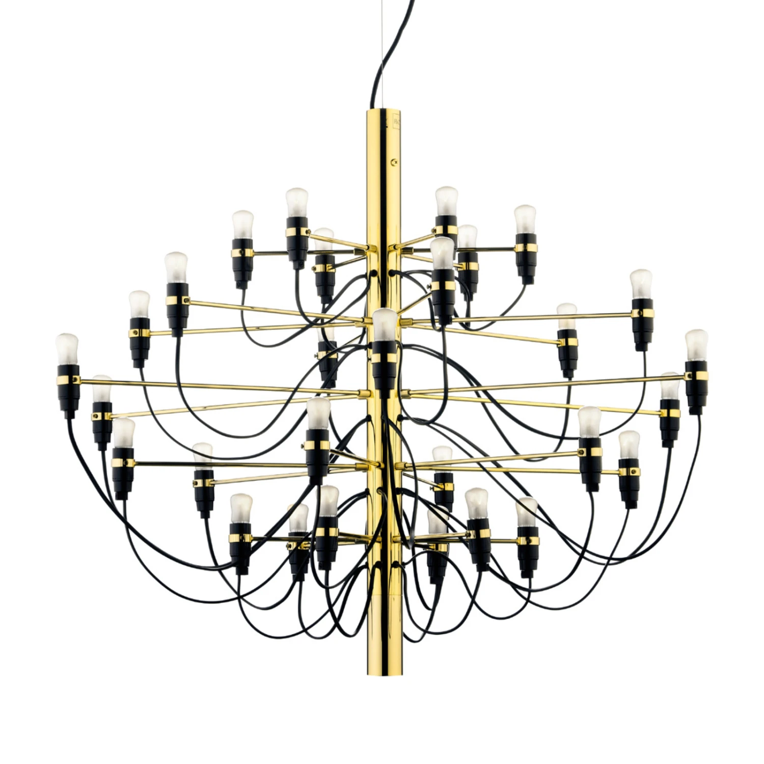 Die Form des klassischen Kronleuchters wurde bei dieser Leuchte von Gino Sarfatti in aktueller Gestaltung interpretiert. Das hochwertige Beleuchtungs- und Einrichtungsojekt des italienischen Herstellers FLOS setzt sich aus einer zentralen Zylinder-Struktur aus Edelstahl und schlanken Armen aus Messing zusammen. Letztere tragen an den Enden insgesamt 30 nach oben gerichtete E14-Fassungen, die mit je einer matten LED-Lampe bestückt sind. Als elegante zentrale Lichtquelle des Raums oder über einem Tisch kommt der Kronleuchter 2097/30 gerade in modernen Einrichtungskonzepten ideal zur Geltung.