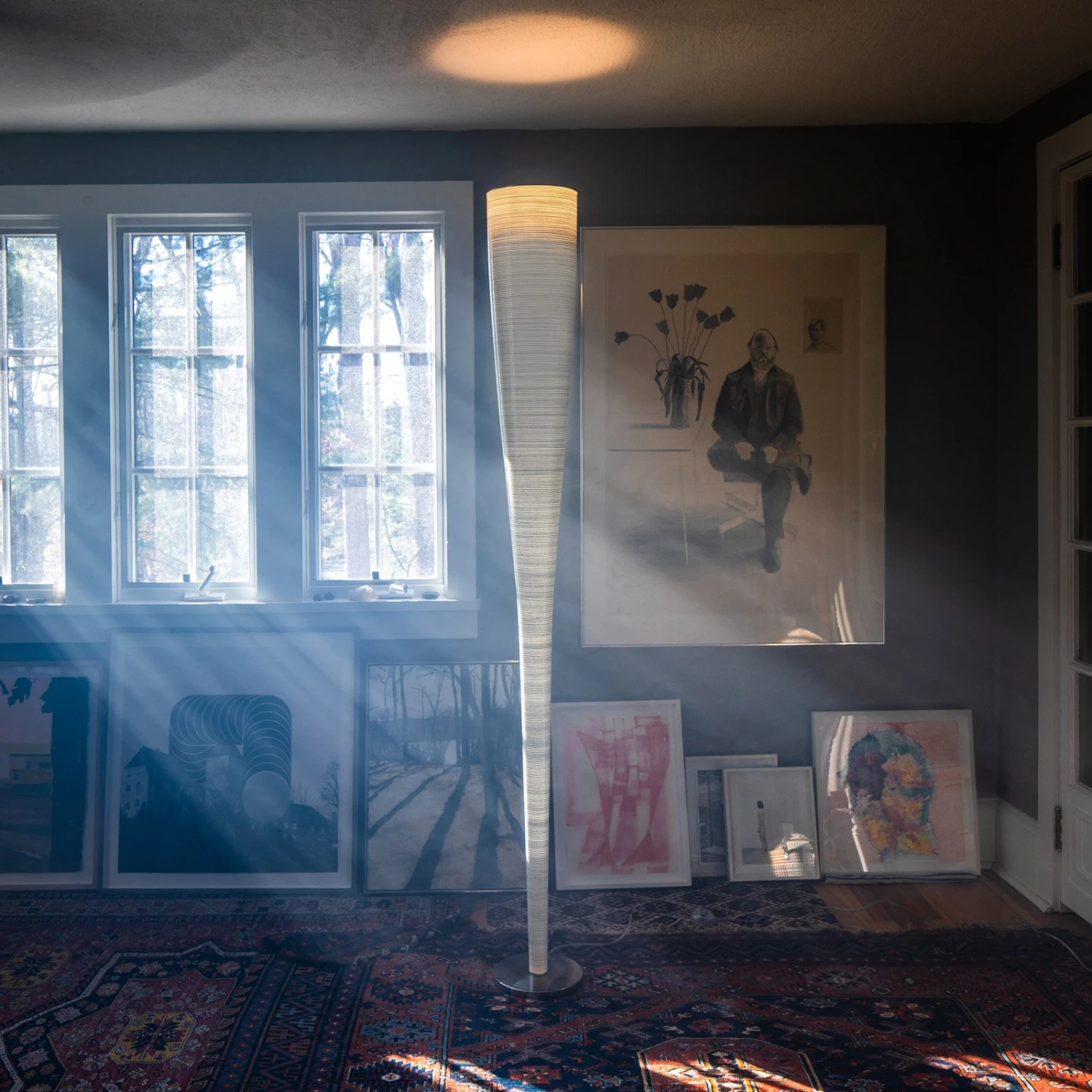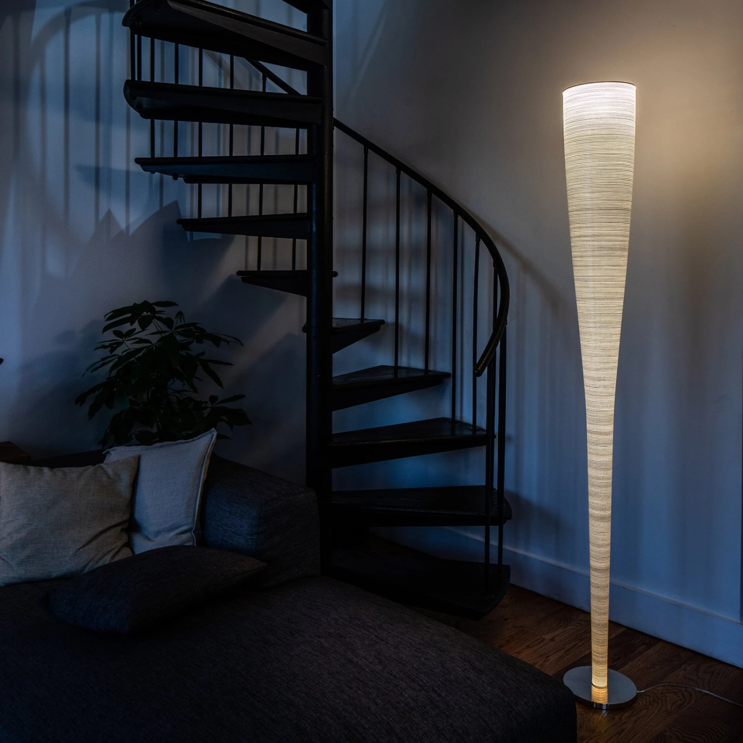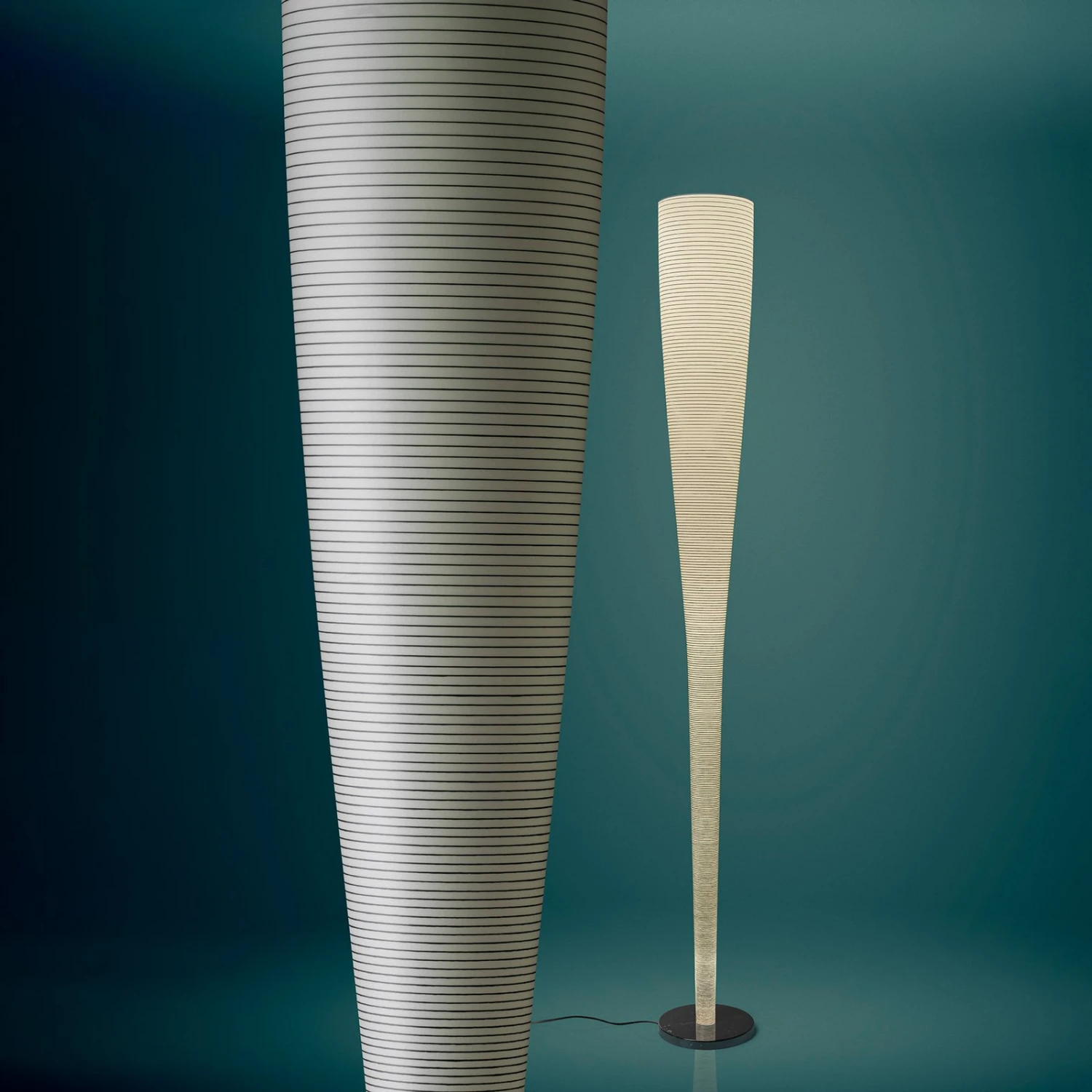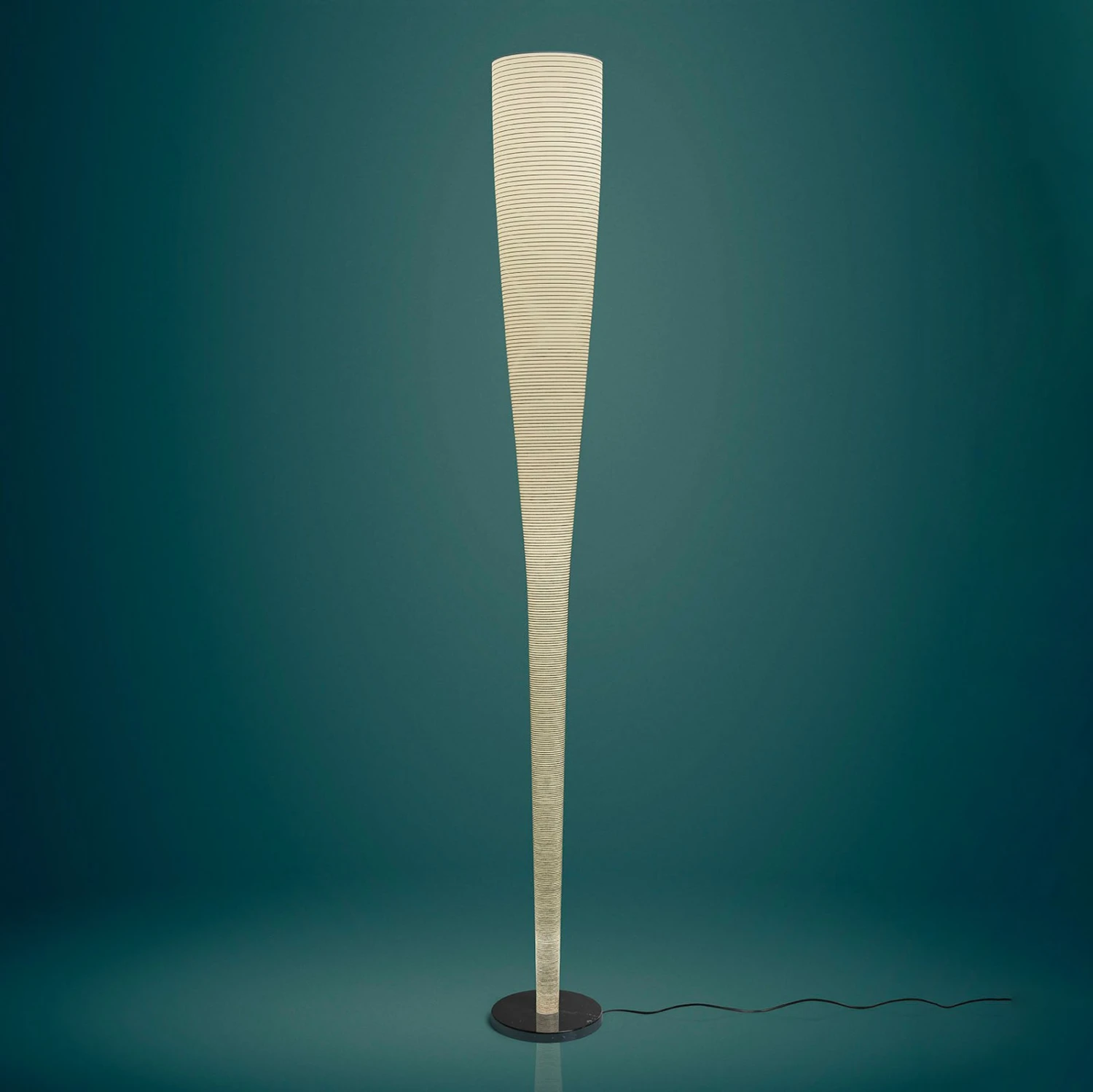 In der Form eines schmalen Kegels gestaltete Marc Sadler die LED-Stehleuchte Mite Anniversario für das italienische Leuchtenlabel Foscarini. Auf einem Fuß aus schwarzem Marquiña-Marmor, einem tiefschwarzen Naturstein mit unregelmäßigen Maserungen, ragt der als schlanker, nach oben geöffneter Kegel geformte Schirm empor. Dieser besteht aus Glasgewebe und einem Draht aus Kohlefaser, der sich spiralförmig nach unten windet und sich zum Sockel hin verdichtet.
