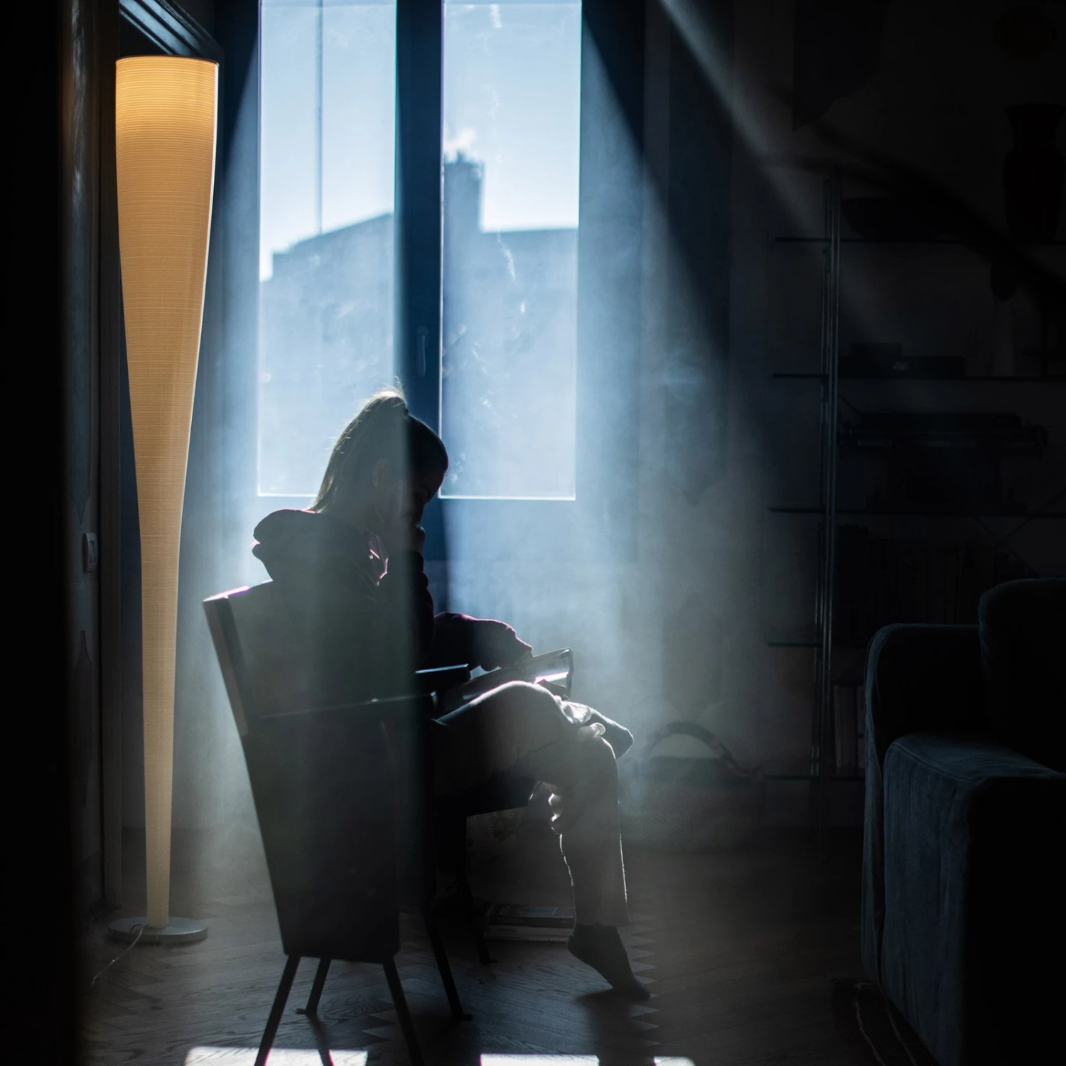 Mite Anniversario – kegelförmige LED-Stehleuchte aus Glasgewebe, Carbonfaser und Marmor