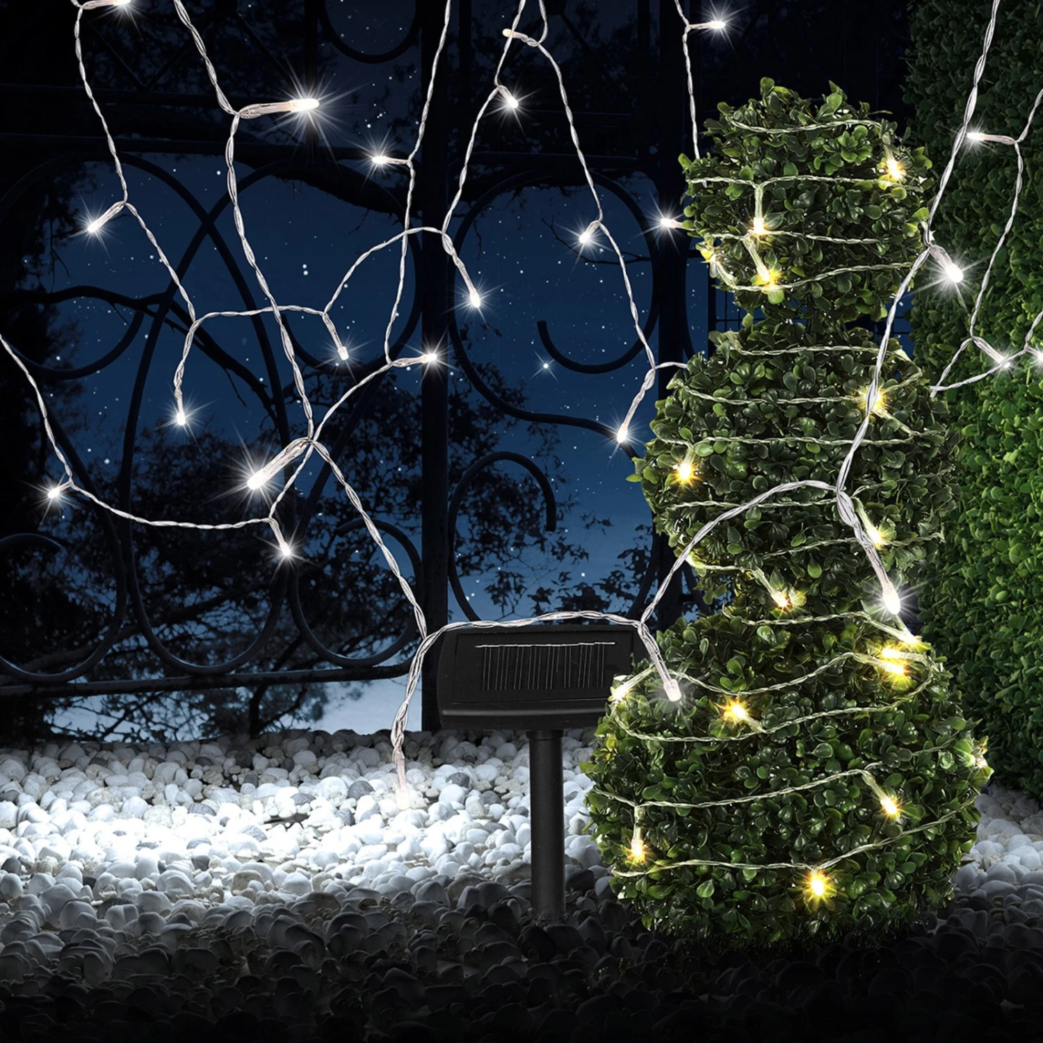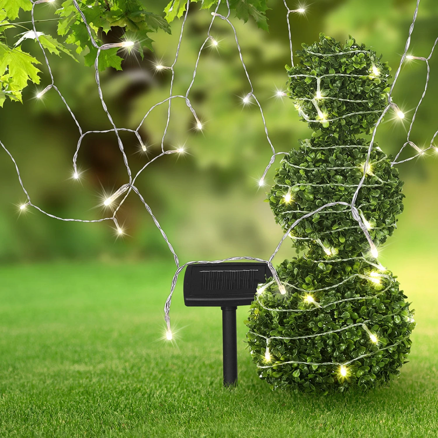 Die Solar-Lichterkette Ece bietet sich hervorragend als Beleuchtung auf dem Balkon, auf der Terrasse oder am Baum an. Aufgrund der Schutzart IP 44 eignet sie sich bestens, um draußen zum Einsatz zu kommen, denn sie ist widerstandsfähig und wird vor Staub sowie vor Spritzwasser geschützt. Auch im Punkt Energieverbrauch kann sie aufgrund moderner Technologie punkten. Dank des Solar-Panels leuchtet sie zum Nulltarif mit der Sonnenenergie – bei voller Aufladung bis zu 8 Stunden lang. Die Länge vom Solarpanel bis zur ersten Leuchte beträgt 3 Meter, so dass die Lichterkette flexibel einsetzbar ist. Durch das transparente Kabel fällt die Lichterkette Ece kaum auf, wenn sie an Pflanzen etc. dekoriert wird.