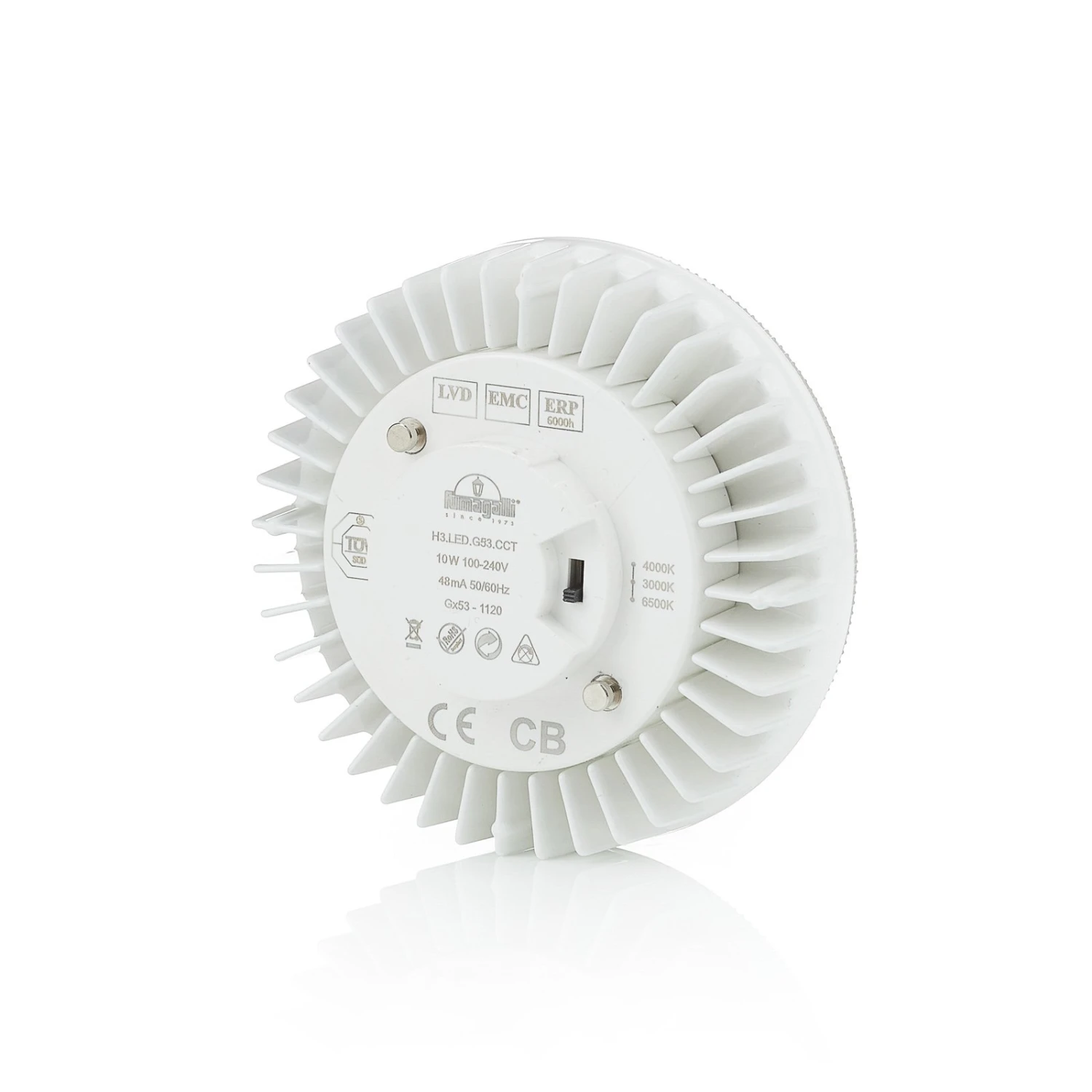Mit dieser leuchtstarken GX53 LED-Lampe kann die Raumbeleuchtung entsprechend der Gegebenheiten angepasst werden. Hierzu ist an der Rückseite ein Mini-Schalter integriert, über welchen die Farbtemperatur auf 3.000 K, 4.000 K oder 6.500 K eingestellt werden kann.