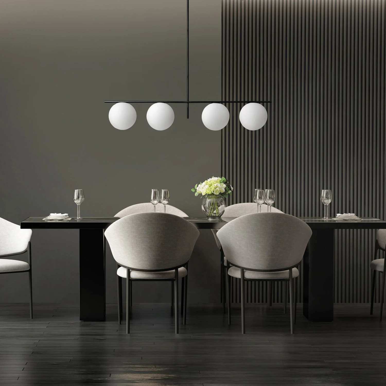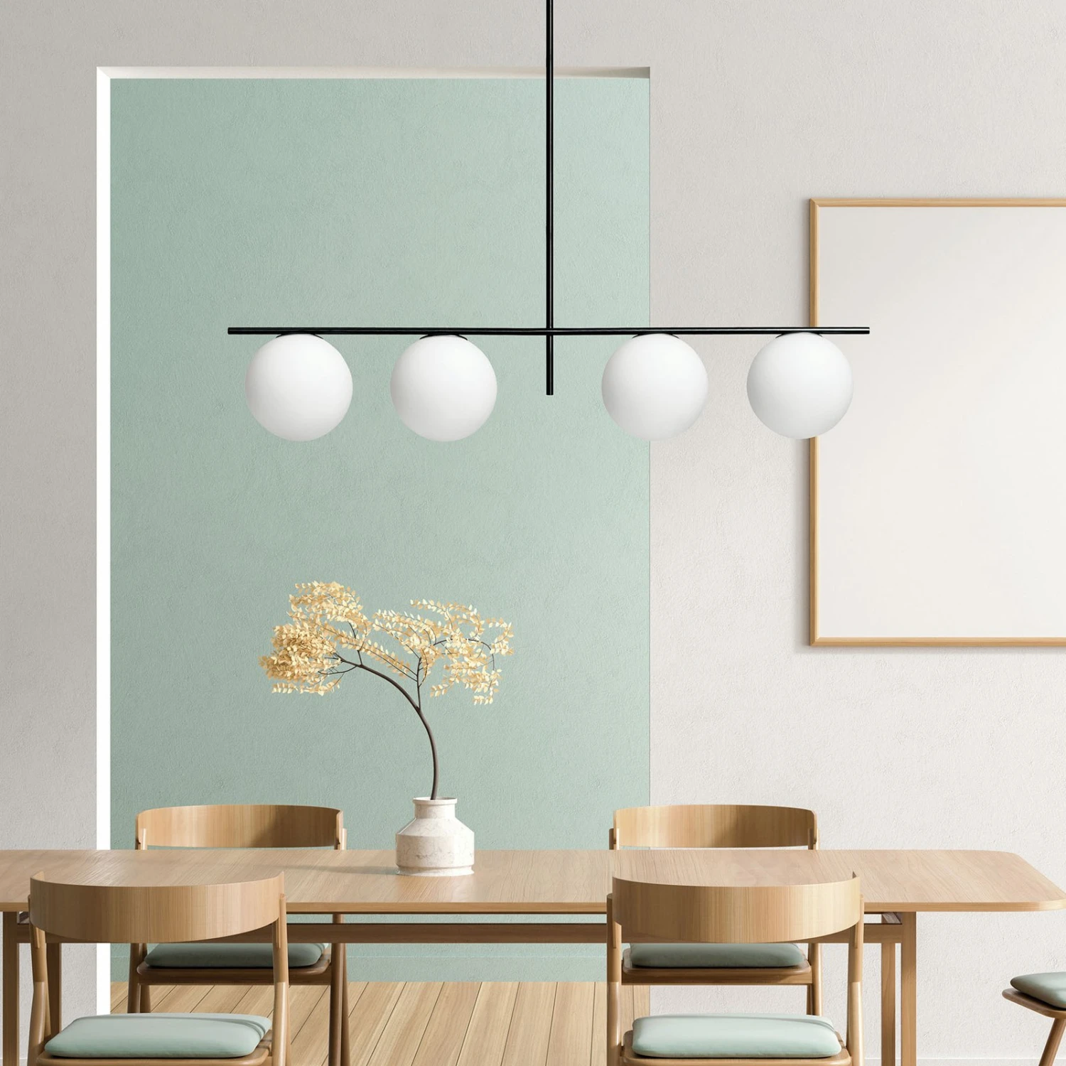 Die Form der Hängeleuchte Jugen eignet sich für den Einsatz in einem Esszimmer über dem Tisch. Die Abhängung der Leuchte kann man in zwei Größen bei Montage verstellen, da die Leuchte zwei unterschiedlich lange Rohre besitzt, die man einfach zusammensetzen kann. Das Gestell ist schwarz lackiert, starr gearbeitet und mit vier Kugelschirmen bestückt, die nach unten gerichtet sind. Die Schirme sind aus weißem Glas und stellen einen Kontrast zu der schwarzen Stange dar. Die Farbgestaltung und das Design der Pendelleuchte ist zeitlos und sorgt für ein schönes Ambiente.