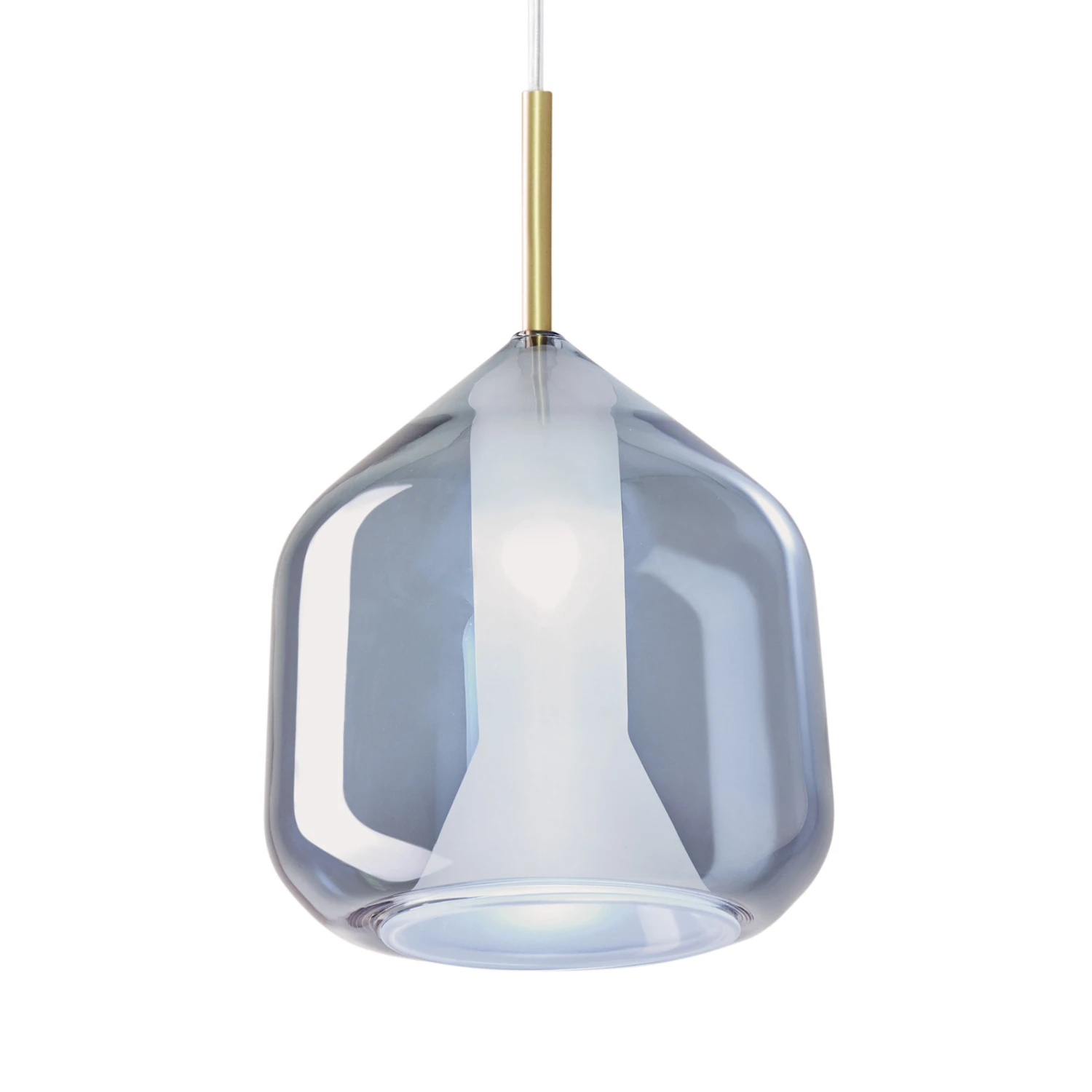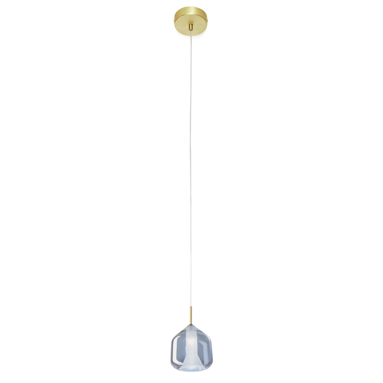 Die Hängeleuchte X-Ray besteht aus einem Schirm aus Glas, einem Kabel als Aufhängung und einem Deckenbaldachin als Abschluss. Als weiteres Detail ist der Übergang vom Kabel zum Schirm mit einem goldenen Detail ummantelt.