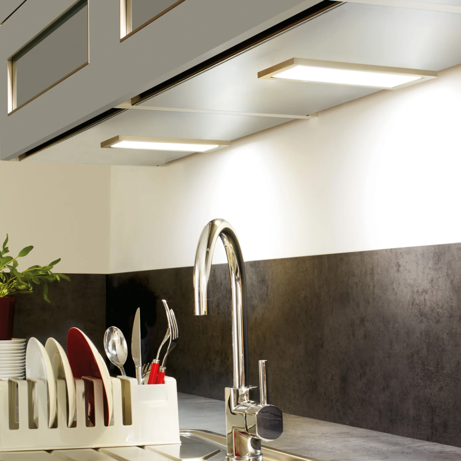 Unter einem Hängeschrank in der Küche montiert, sorgt diese mit nur 0,85 cm sehr flache LED-Unterbauleuchte Sky für Licht auf der darunter liegenden Arbeitsfläche. Langlebige LEDs mit einer durchschnittlichen Lebensdauer von ca. 30.000 Stunden spenden warmweiße Beleuchtung ohne UV-Anteil im Licht. Die Leuchte wird mit einer 2,5 m langen Anschlussleitung mit LED 24-Stecker geliefert. Zum Betrieb ist ein Transformator erforderlich (siehe Zubehör). Die Montage der Leuchte erfolgt mittels einer Montagezunge. Diese wird an dem Möbelstück befestigt und die Leuchte kann dann einfach aufgeschoben werden.
