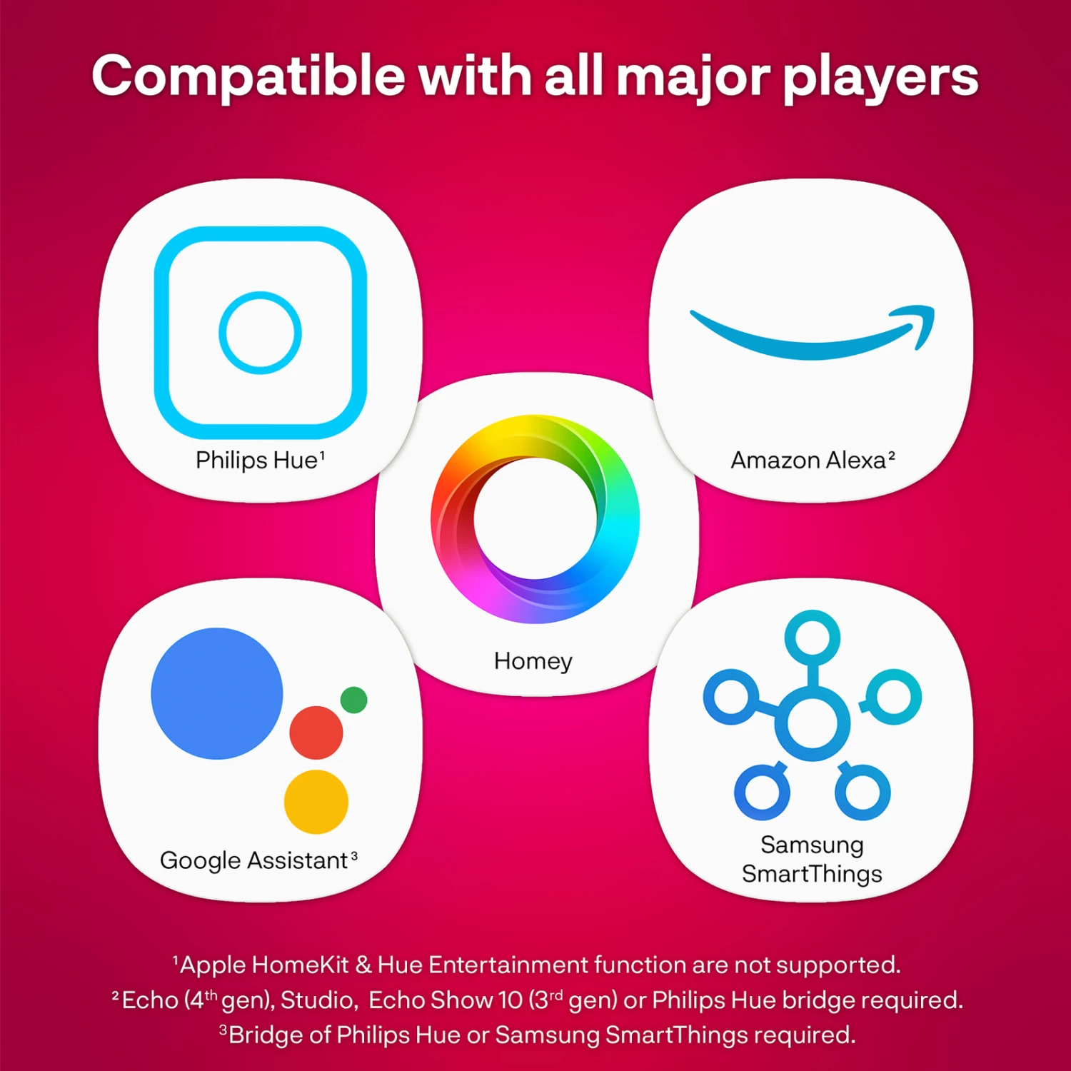 Per Sprache steuerbar mit Amazon Alexa, Google Assistant oder Samsung Smart Things in Kombination mit einer Hue Bridge. Direkt verbindbar (ohne Bridge) mit dem Amazon Echo Plus oder der Echo Show 2nd Generation.