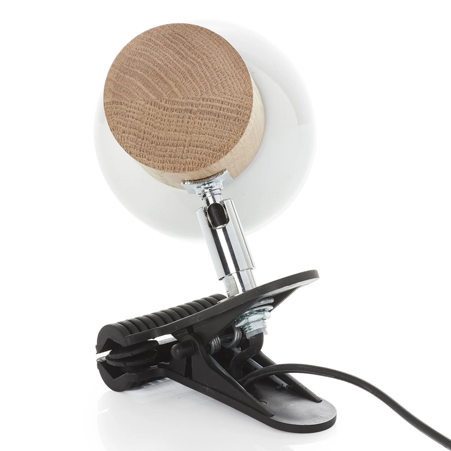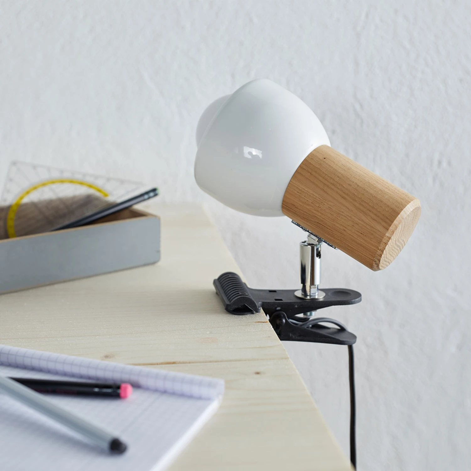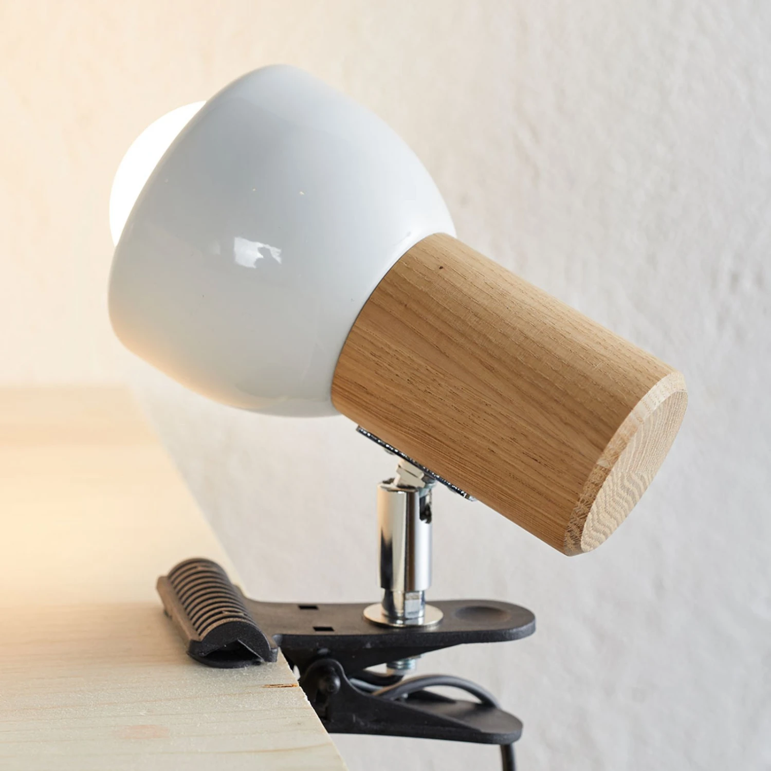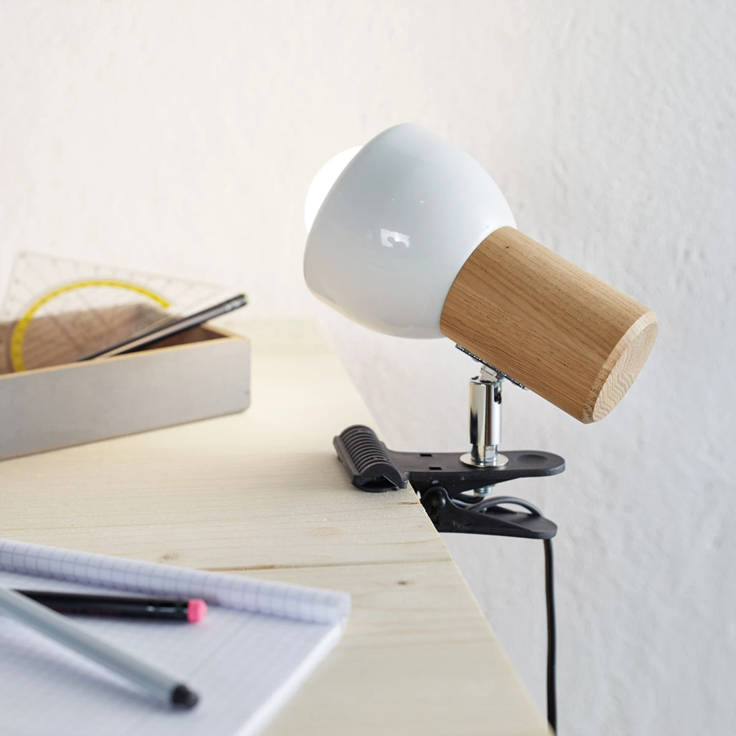 Die kleine Klemmleuchte Clampspots überzeugt durch Design und Funktionalität. Die moderne Optik mit einem Körper aus hellem Eichenholz und einem Schirm aus weißen Metall macht die kleine Leuchte zu einer idealen Beleuchtung, die dank des trendigen Aussehens in viele moderne Einrichtungen passt. Dabei kann sie ganz und gar flexibel eingesetzt werden – alles was es dazu braucht, ist eine Möglichkeit, die Leuchte festzuklemmen und schon spendet die Leuchte Clampspots genügend Helligkeit, ob zum Lesen oder Arbeiten.