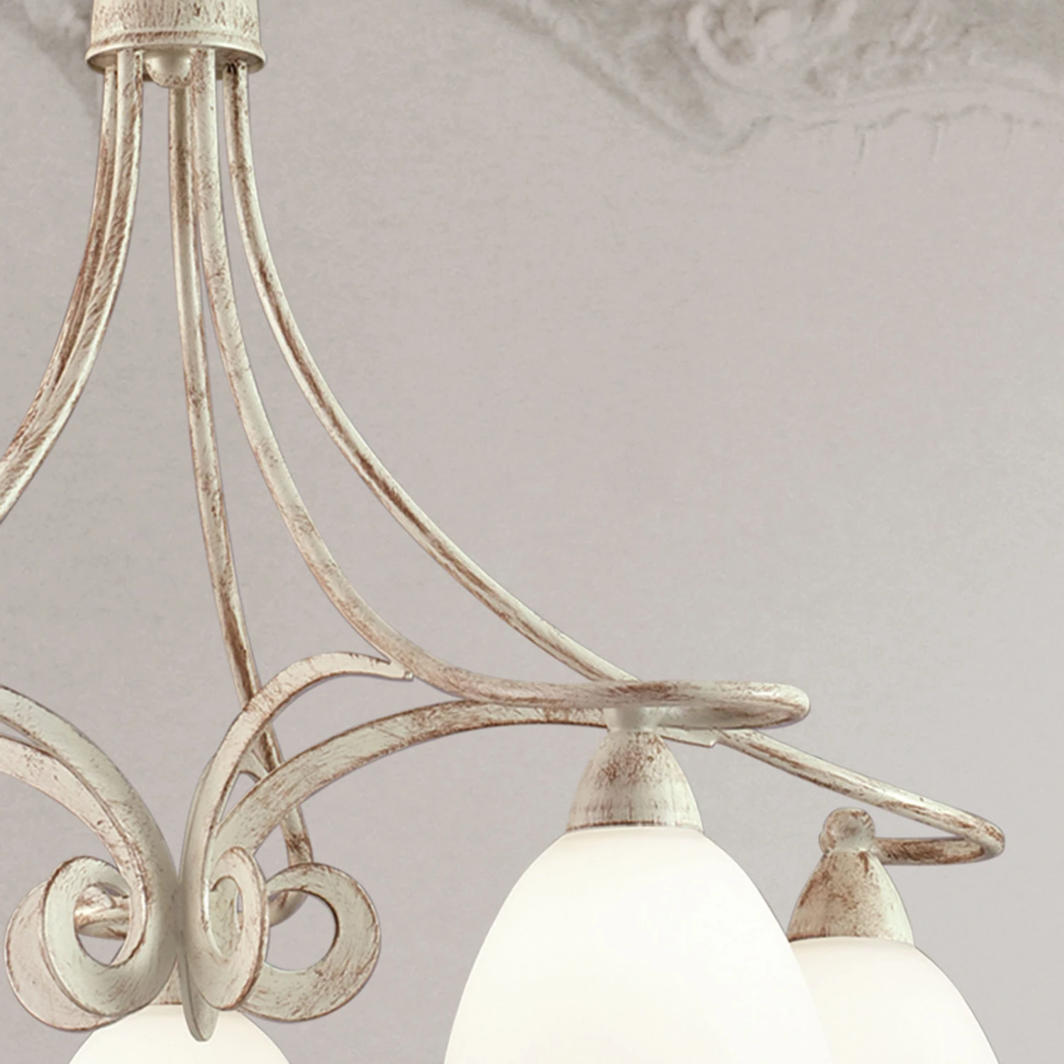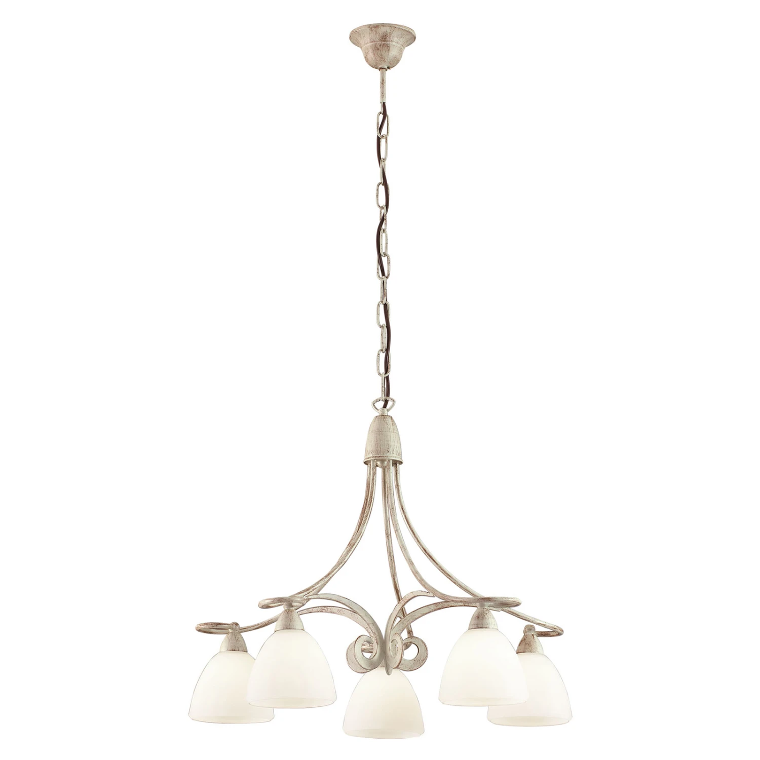 Der Kronleuchter sticht durch sein elegantes Gestell sofort ins Auge. Die geschwungenen Linien und dezenten Schnörkel verbinden die fünf Lampenschirme miteinander, die in einem Kreis angebracht sind. Das Eisengestell ist mit einem aufregenden und natürlichen Farbton überzogen. Die Elfenbein-Optik harmoniert mit den weiß satinierten Glasschirmen, die die Leuchtmittel umgeben. Die Schirme sind nach unten geöffnet und machen eine direkte Lichtabgabe möglich. Mittig im Raum angebracht, sorgt dieser Kronleuchter für eine angenehme und großflächige Ausleuchtung und vereint moderne Züge mit Komponenten aus dem Landhausstil.
