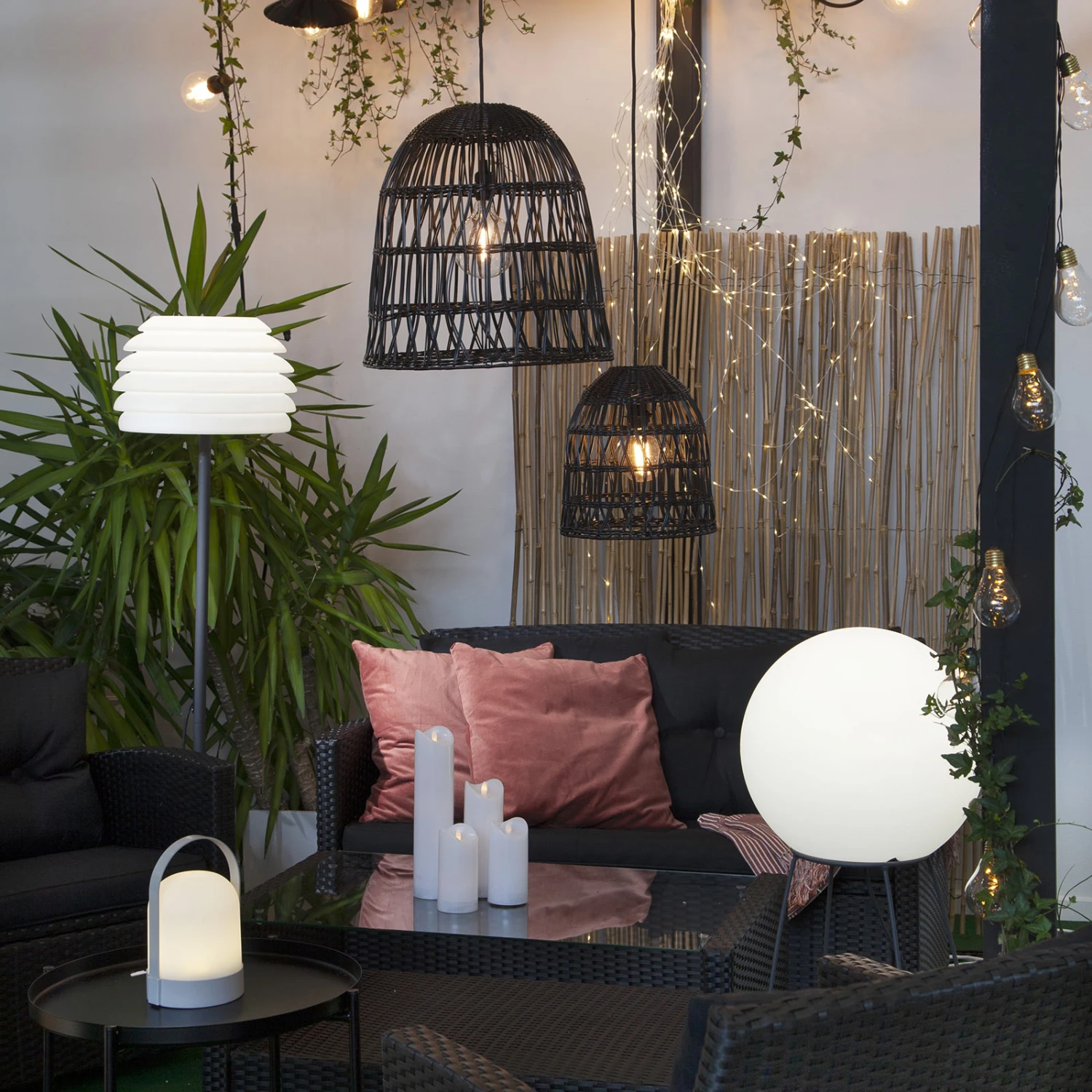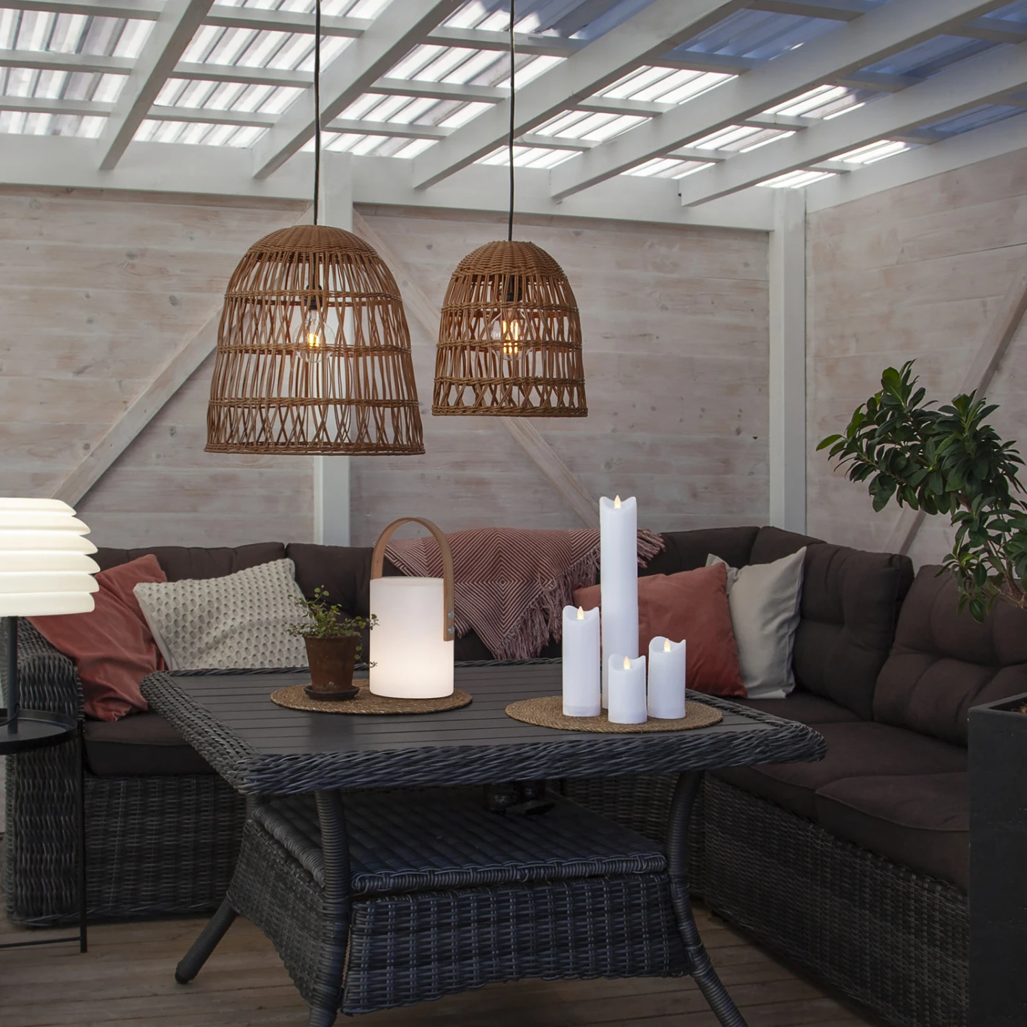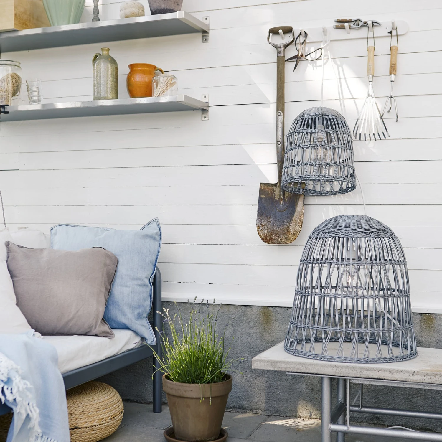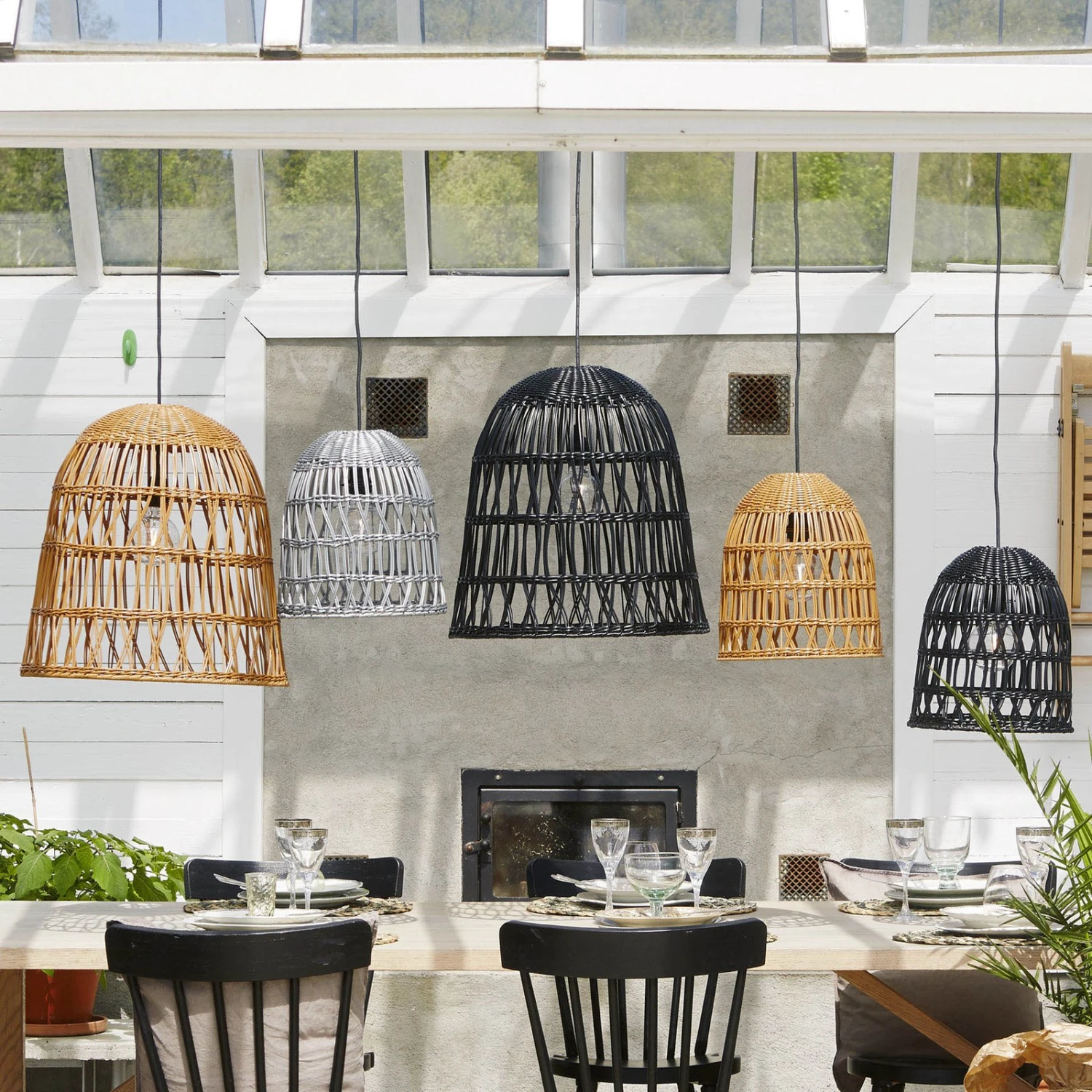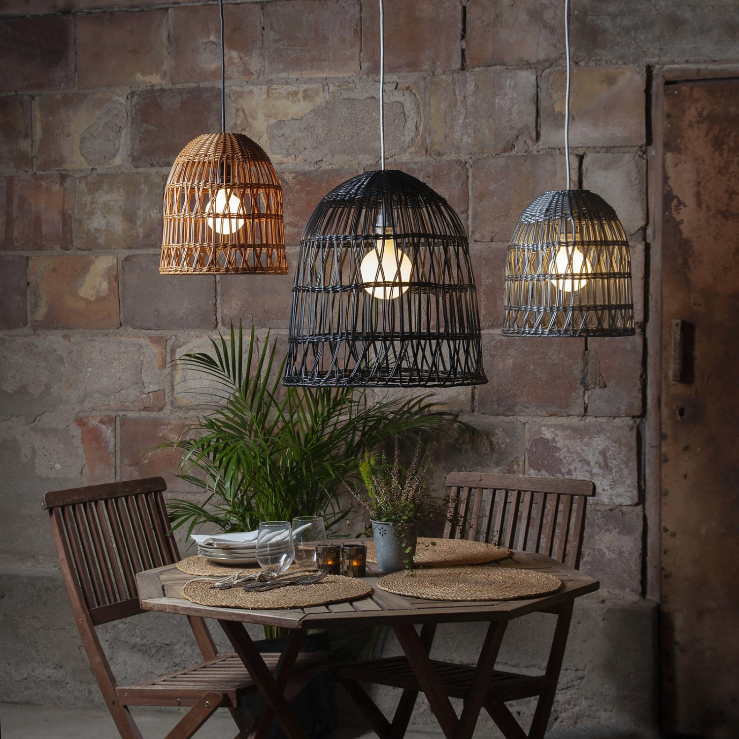 Der Lampenschirm Knute ist ein korbförmiges Geflecht aus Poly-Rattan und für den Einsatz im Innen- und Außenbereich geeignet. In Kombination mit einem Kabel mit Fassung und einem schönen Filament-Leuchtmittel (beides nicht enthalten) ergibt sich hier eine sehr flexibel kombinierbare Hängeleuchte, die sowohl die Terrasse als auch Wohnräume aufwerten kann. Das Material ist witterungsbeständig und erzeugt zudem bei eingeschaltetem Licht ein interessantes Schattenmuster.