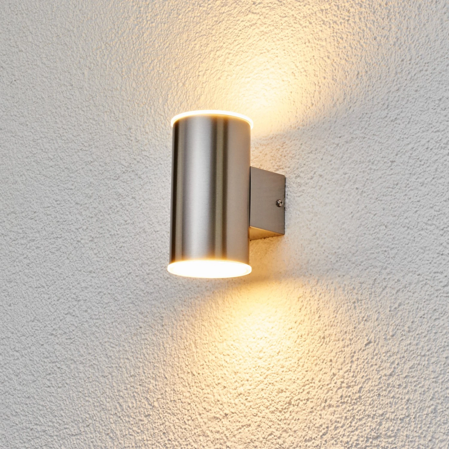 Ein Edelstahl-Zylinder stellt den Schirm dieser Außenwandleuchte dar, die mit einem zeitlosen Auftritt glänzt. Morena gibt ihr Licht sowohl nach oben als auch nach unten ab, wodurch zum einen eher indirekte Lichtverhältnisse entstehen und was zum anderen oft schon von Weitem als sehr eindrucksvoll und stimmig wahrzunehmen ist. Bei den integrierten LEDs handelt es sich um ein Markenprodukt aus dem Hause Epistar und sie leuchten in warmweißer Lichtfarbe.