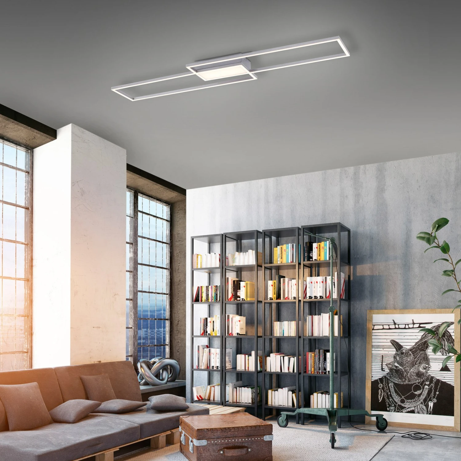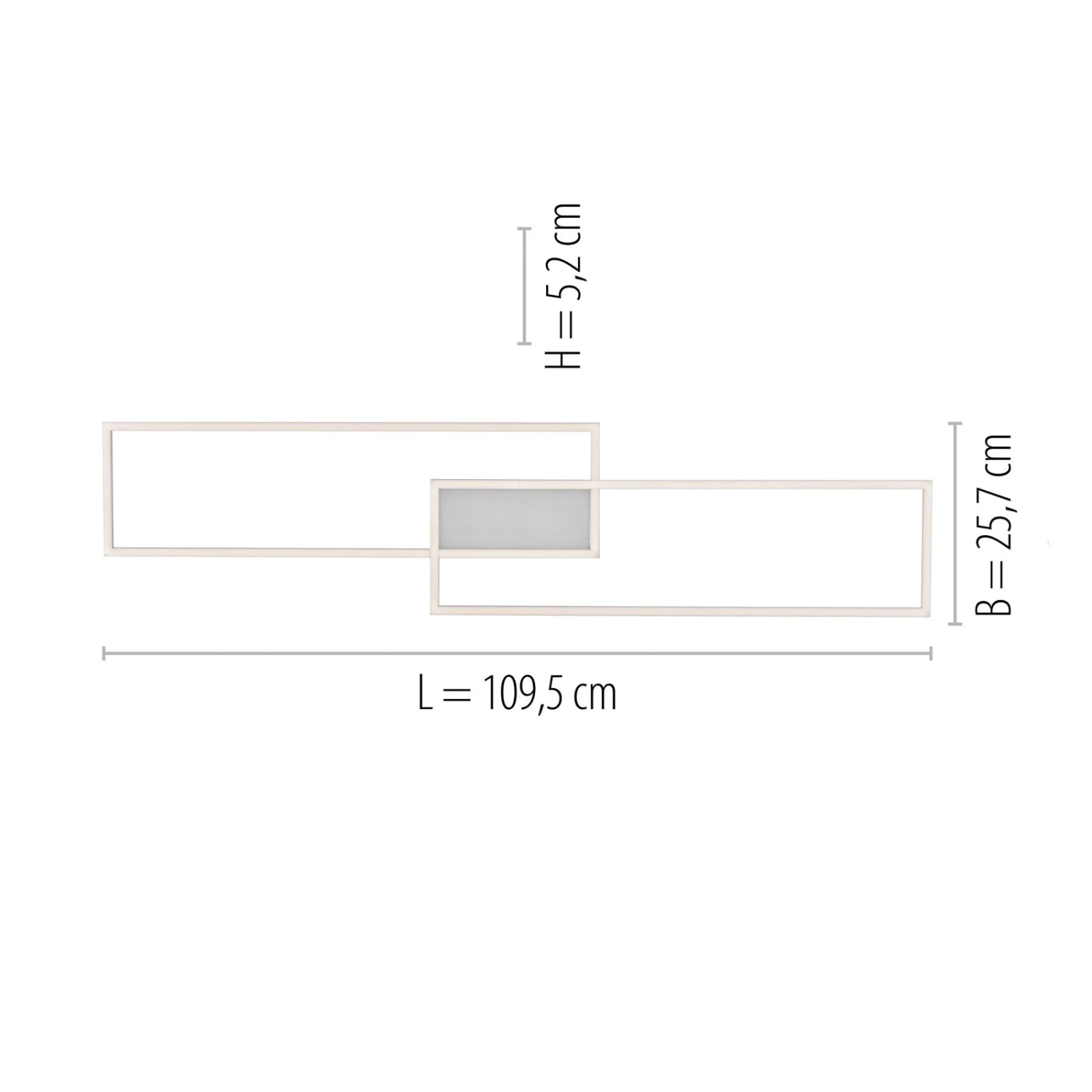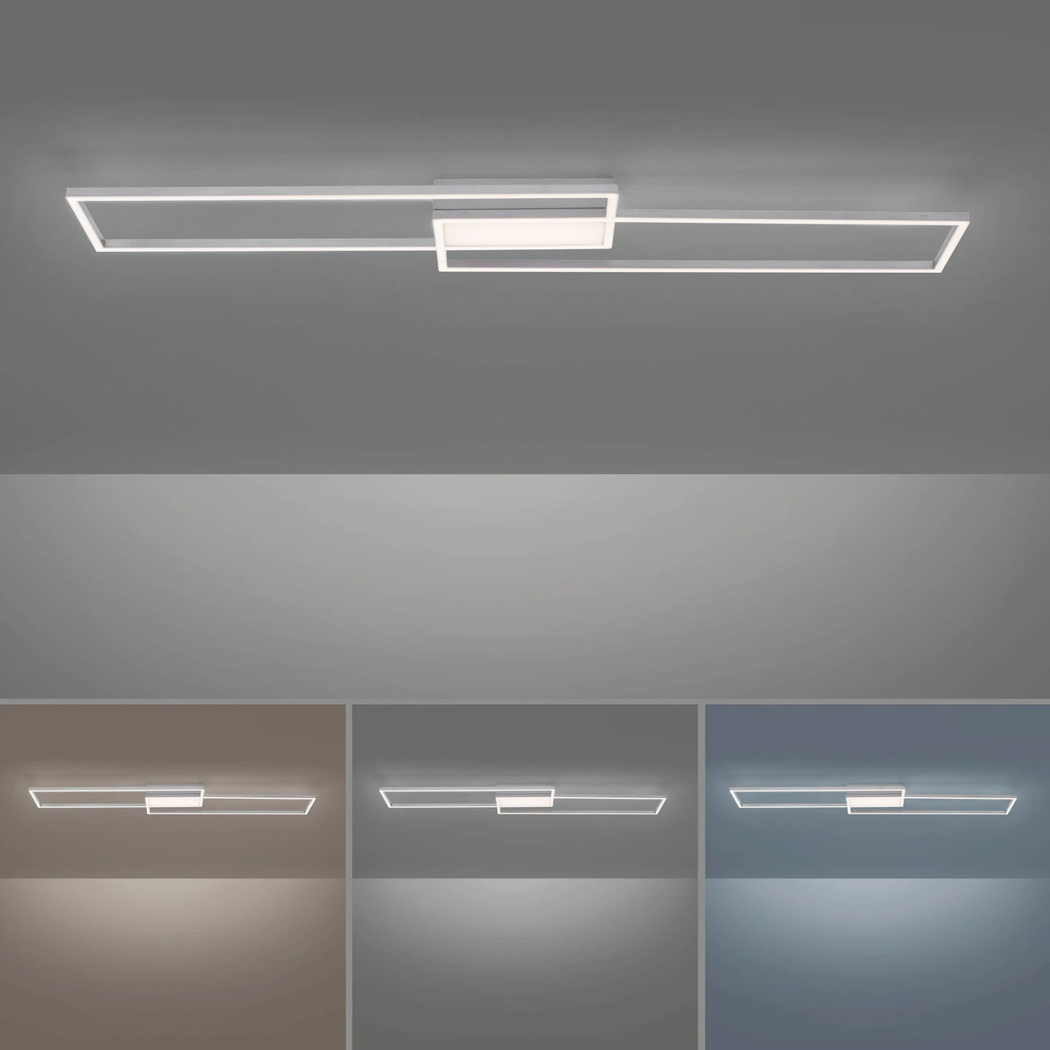 Die LED-Deckenleuchte Asmin bietet vielseitiges Licht mit modernem Design. Sie besteht aus zwei länglichen Rechtecken, die versetzt zueinander angeordnet und mit energieeffizienten LEDs bestückt sind. Diese können mit der mitgelieferten Fernbedienung gesteuert und gedimmt werden. Die Lichtfarbe lässt sich von Warmweiß bis Universalweiß verstellen. Dazu können die einzelnen Areale der Leuchte separat geschaltet werden, ob alle Lichter oder nur der innere oder nur der äußere Bereich. Dank der integrierten Memoryfunktion wird die zuletzt gewählte Einstellung gespeichert und beim nächsten Einschalten wieder abgerufen.
