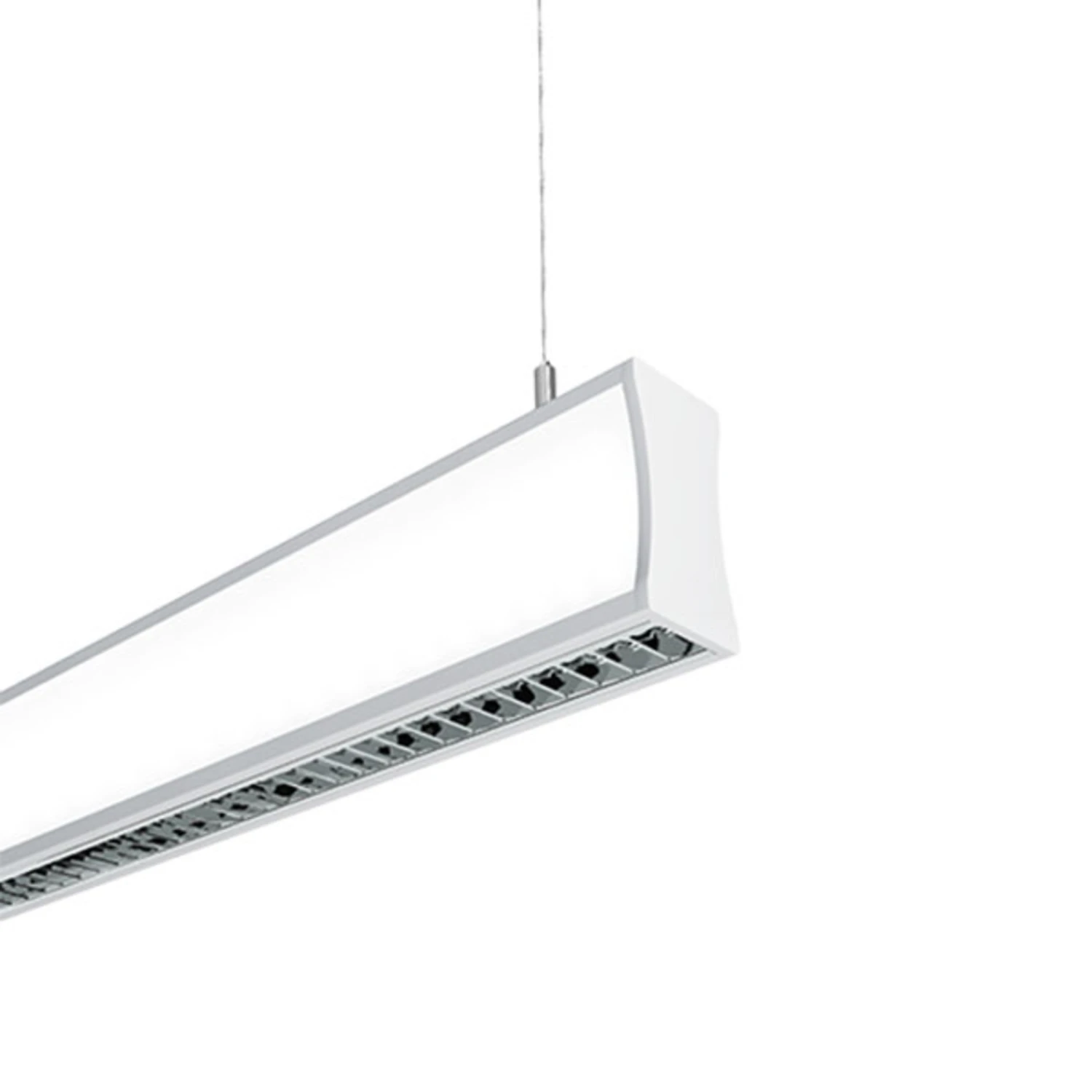 Die konkav geformte LED-Pendelleuchte WHY3 ist mit einem Doppel-Parabolraster ausgestattet, der an den Seiten mit opalen Optiken kombiniert ist. Die seitlichen Optiken werden von einem separaten Stromkreis gespeist. Die Hängeleuchte verfügt über 4 Lichtverteilungsmodi – direkt strahlend, indirekt strahlend und jeweils seitwärts strahlend. Durch das nach unten gerichtete Raster entsteht eine sehr niedrige Blendung, die gleichzeitig den Arbeitskomfort deutlich erhöht.
