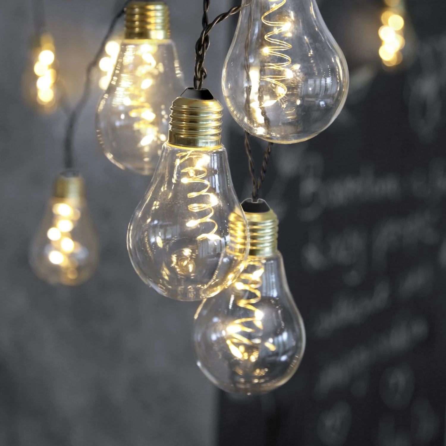 Die LED-Lichterkette Glow setzt sich aus zehn Lampen zusammen, die aus Glas bestehen und in er klassischen Glühbirnenform gestaltet sind. Der goldfarbene Sockel der Lampen verlieht ihnen eine dekorative Vintage-Optik und ist direkt am schwarzen Kabel befestigt. Im Inneren der Lampen wurde eine kleine Dew-Drop-Spirale mit mehreren LEDs verbaut, die an ein Filament-Leuchtmittel erinnern. Das warme Licht sorgt für eine einladende und gemütliche Atmosphäre in Wohnbereich, auf der Terrasse, im Garten oder auf dem Balkon. Die Lichterkette verfügt über Schutzart IP44 und kann damit im Innenbereich sowie im überdachten Außenbereich genutzt werden.