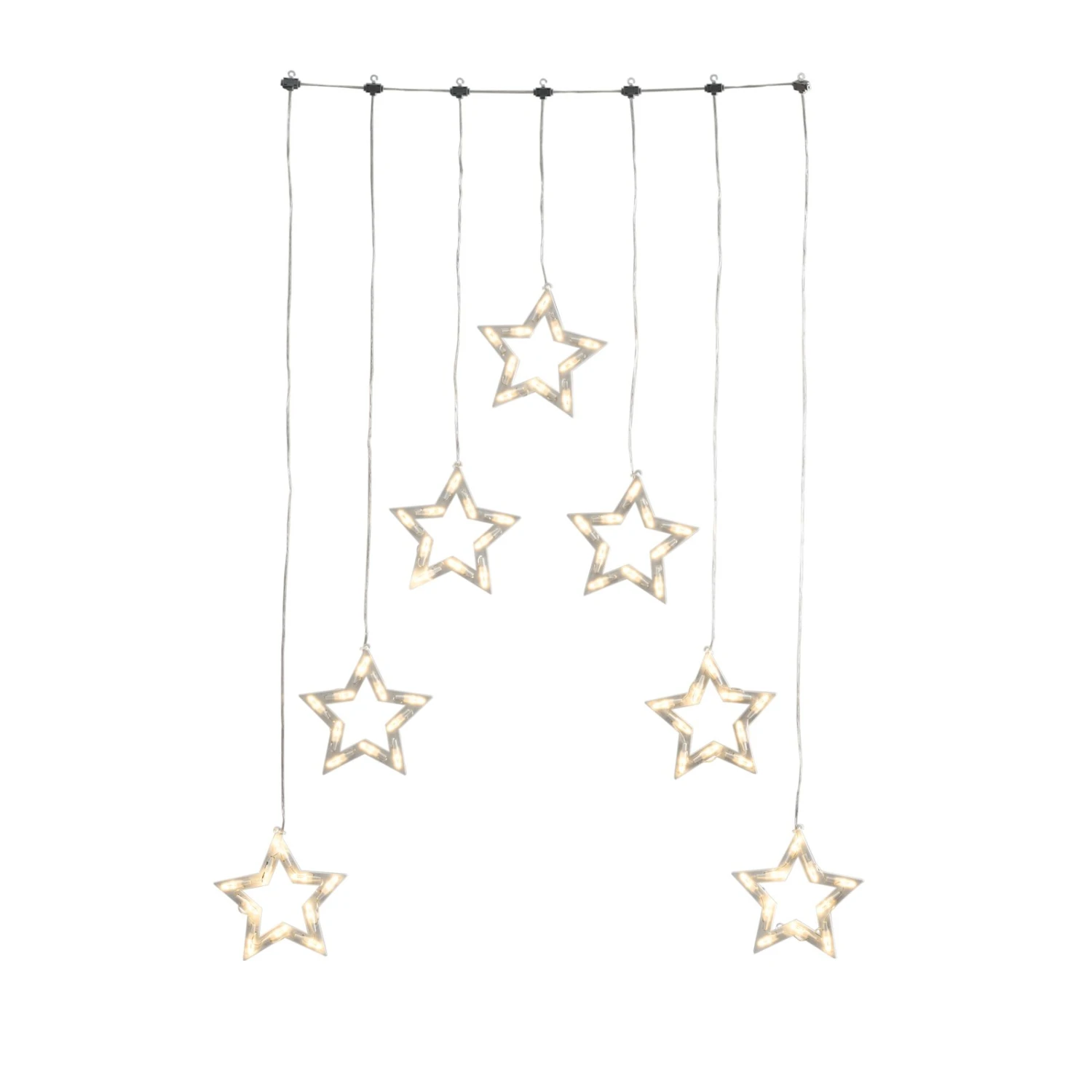 Die sieben transparenten Sterne dieses schönen Lichtervorhangs für den Außenbereich leuchten in stimmungsvollem, warmweißem Licht in der dunklen Nacht und stimmen auf die Weihnachtszeit ein. Im Lieferumfang ist ein Außentrafo enthalten.