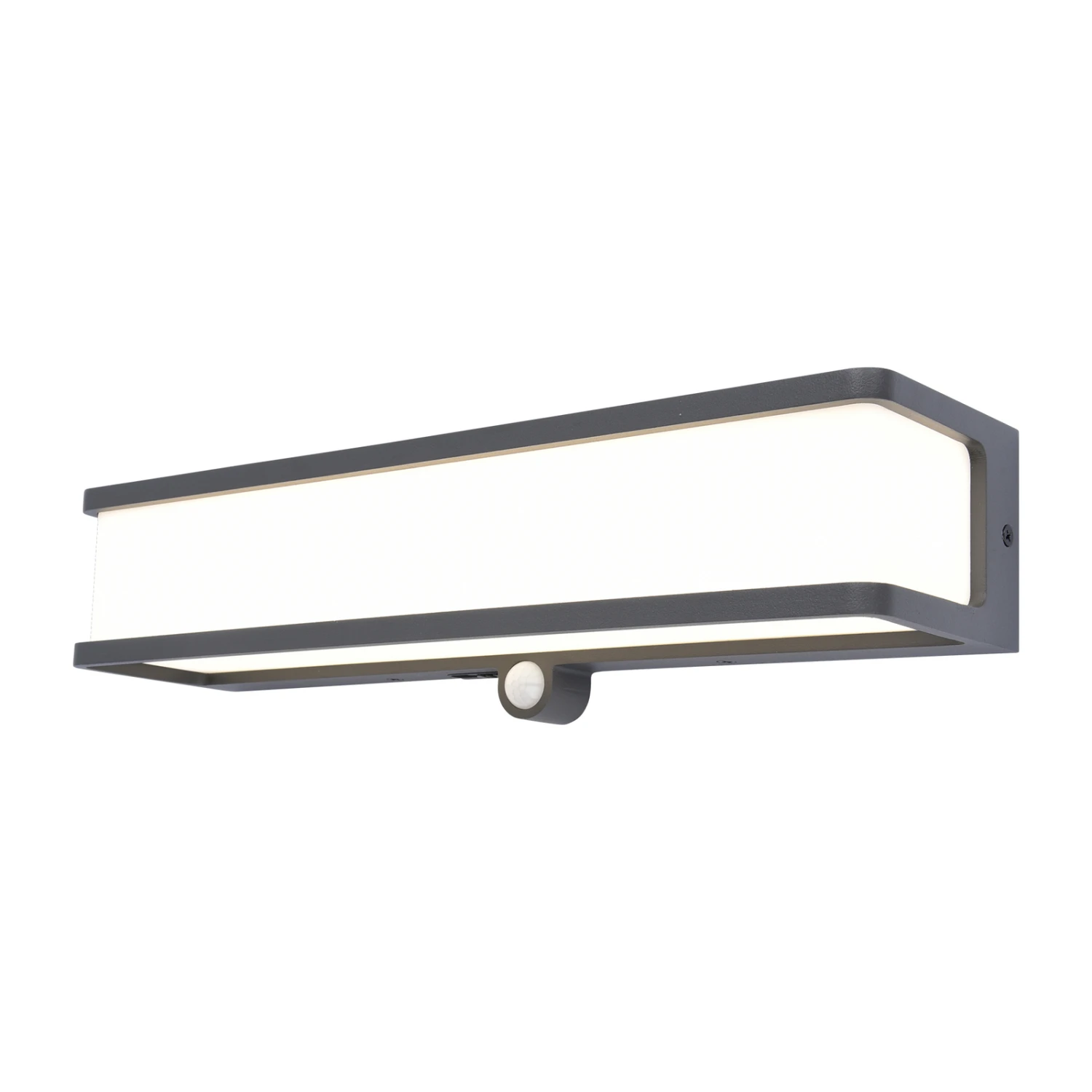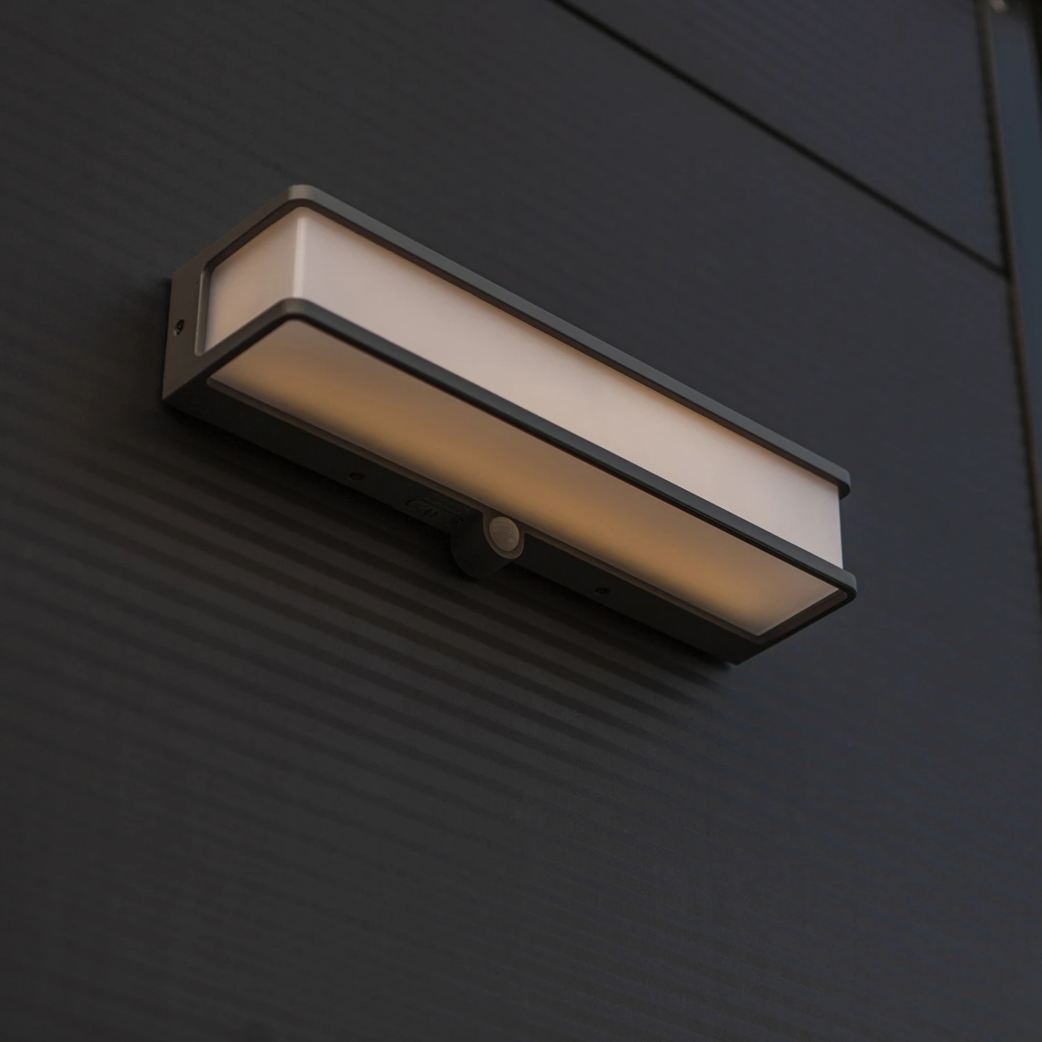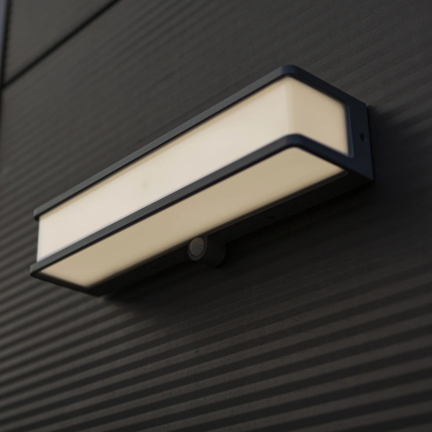 Die LED-Solar-Wandleuchte Doblo in rechteckiger Form besteht aus einem Aluminiumrahmen in Anthrazit, in dem ein Diffusor aus Kunststoff sitzt. Oben auf der Leuchte wurde das Solarpanel verbaut, das den in der Leuchte verbauten Akku am Tag mit Energie versorgt. Ein integrierter Dämmerungssensor sowie ein Bewegungssensor gewährleisten ein automatisches Einschalten, wobei verschiedene Einstellungen vorgenommen werden können: