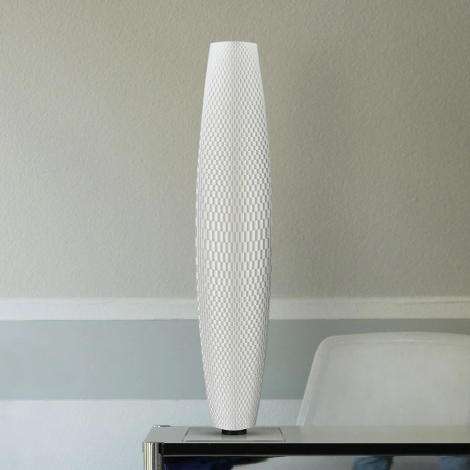 Ihre Besonderheit ist die Herstellungsart: Der Lampenschirm der innovativen Stehleuchte Flechtwerk Pur wird komplett durch einen 3D-Drucker gefertigt. Als Druckmaterial wird ein hochwertiges Biomaterial verwendet, welches frei von toxischen Stoffen oder Erdöl und somit absolut zeitgemäß, ökologisch und nachhaltig ist. Der Grundbestandteil ist Lignin, der als sogenanntes Flüssigholz bezeichnet und als Holzbestandteil auch zu 100 % biologisch abbaubar ist. Im Inneren des innovativen Schirmes versteckt sich ein LED-Leuchtstab, der mit einer warmweißen Lichtfarbe ganz sanft die Leuchte sowie die Umgebung erhellt. Mit der mitgelieferten Fernbedienung lässt sich die Stehleuchte Flechtwerk Pur schalten und dimmen. Ein Acryl-Standfuß rundet das Design ab.