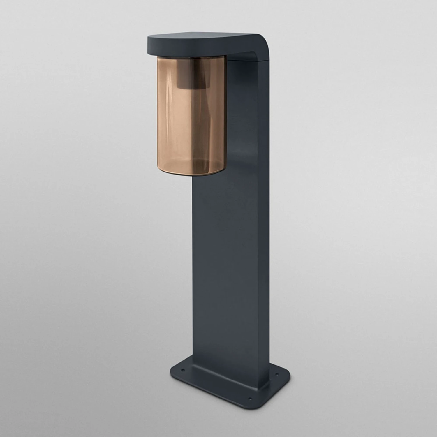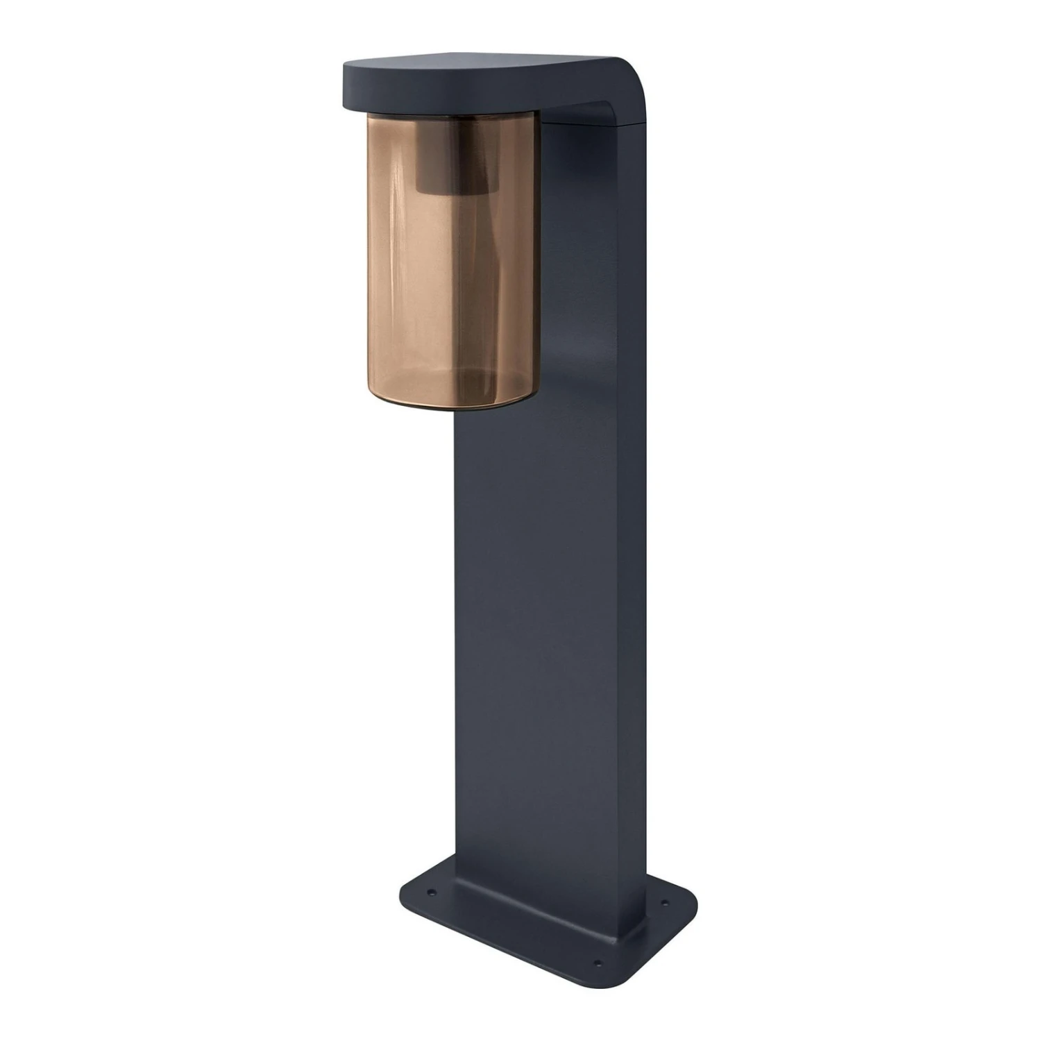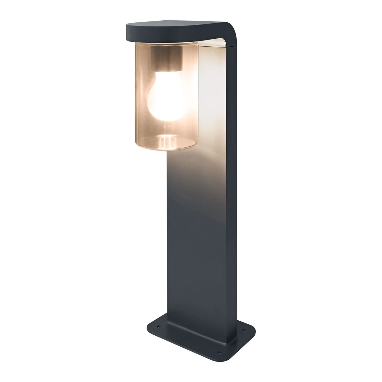 Im oberen Bereich wurde das aus Aluminium mit dunkelgrauem Finish (RAL 7016) gestaltete Gestell der Sockelleuchte Endura Classic Cascade im rechten Winkel nach vorne abgewinkelt. Hier sitzt der zylinderförmige Glasschirm der Sockelleuchte, der frei am Gestell nach unten hängt, so dass das Licht rundum durch das Glas abstrahlen kann. Eine besonders schöne Optik wird erzielt, wenn man in die E27-Fassung eine dekorative Filamentlampe einsetzt. Das Leuchtmittel wird nicht mitgeliefert, Befestigungsmaterial ist im Lieferumfang enthalten.