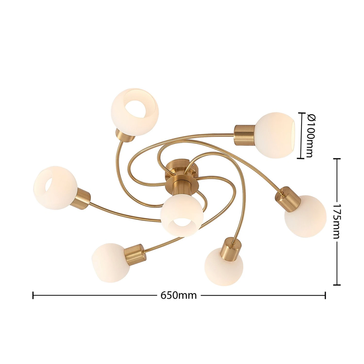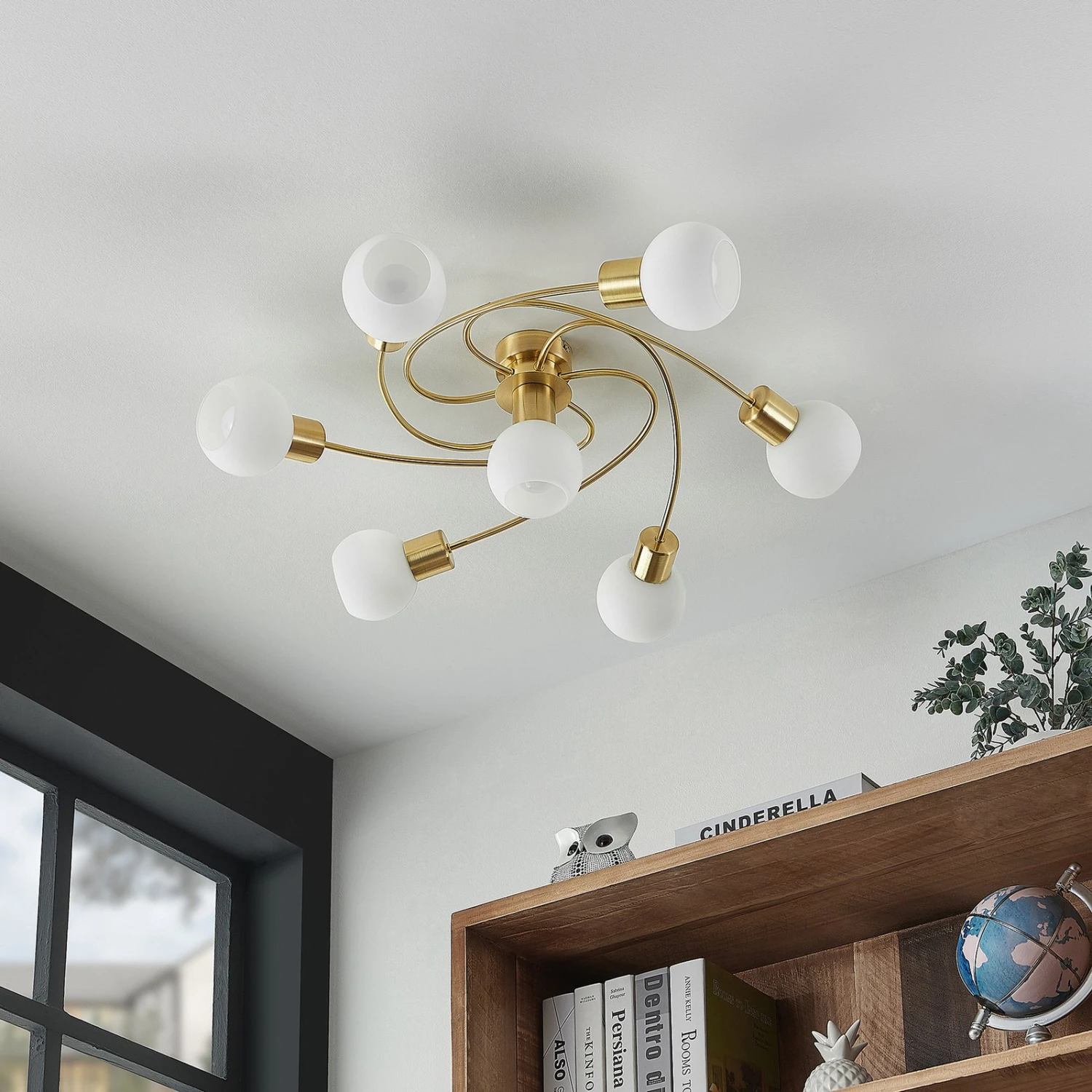 Ciala ist eine moderne Lichtquelle, die mit ihrem schön geschwungenen Gestell aus messingfarbenen Eisen sofort ins Auge fällt. Zeitgleich drängt sie sich dank der opalweißen Leuchtenschirme nicht zu sehr in den Vordergrund, sodass sie das Mobiliar nicht in den Schatten stellt. Die siebenflammige Deckenleuchte Ciala kann auch größere Räume gut ausleuchten und macht sich sehr schön an der Wohnzimmerdecke.