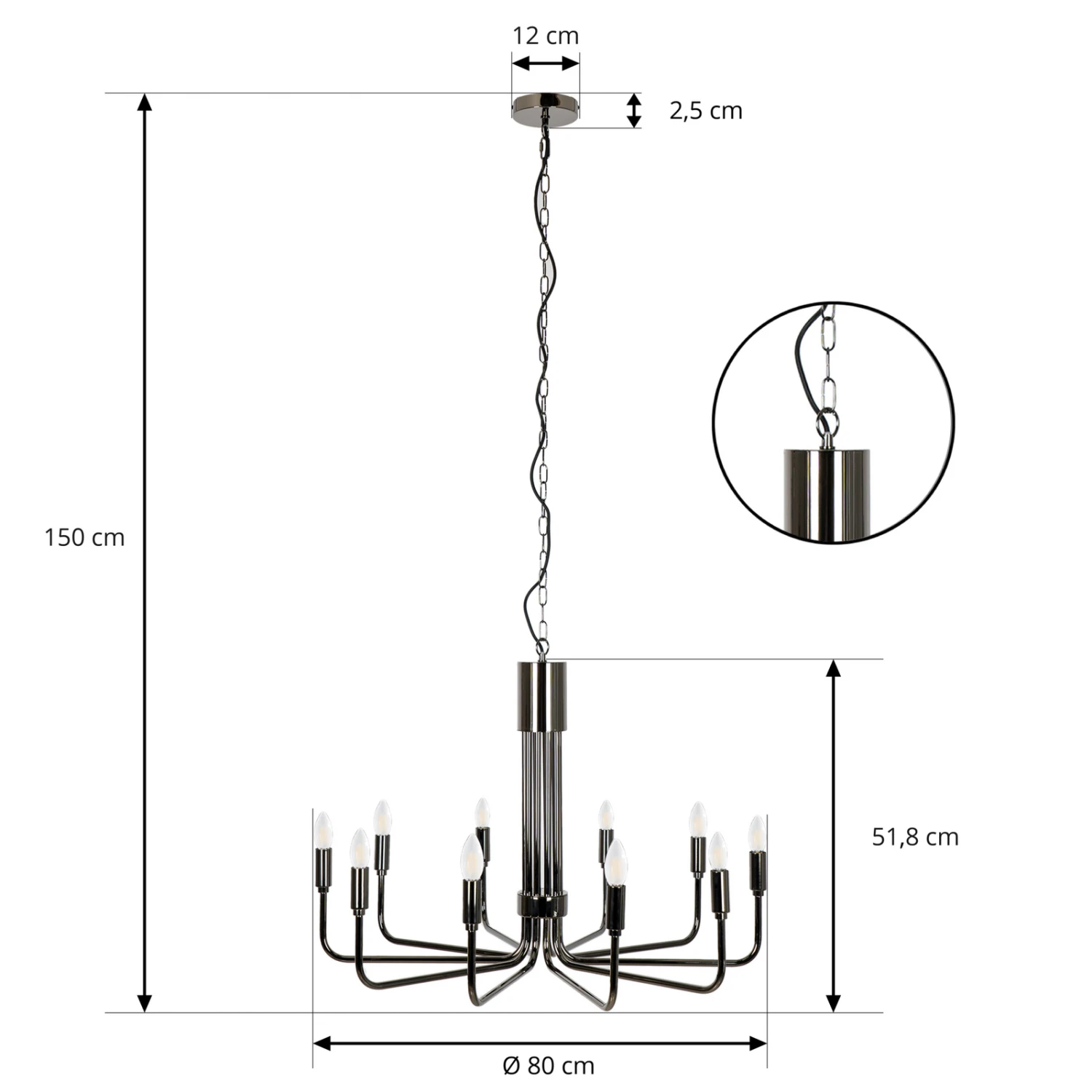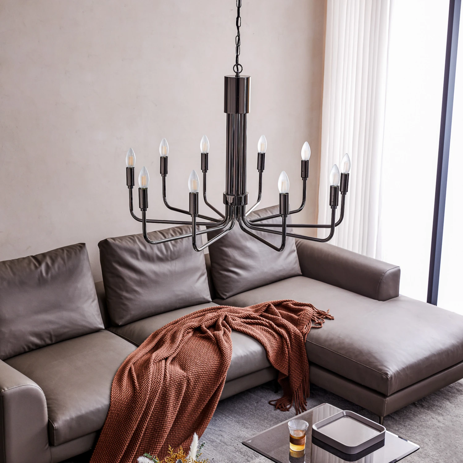 Der Kronleuchter Elanova wurde gänzlich aus Eisen hergestellt und mit einem beeindruckenden Finish in der Gunmetal-Farbe überzogen. Er bietet Platz für insgesamt zehn Leuchtmittel und kann somit auch größere Raumbereiche hervorragend ausleuchten. Im Gegensatz zu einem ganz klassischen Kronleuchter wurde bei diesem Design auf opulente Verzierungen verzichtet und sich ganz auf das Wesentliche konzentriert. Deshalb lässt sich diese besondere Leuchte auch mit moderneren Einrichtungsstilen gut kombinieren.