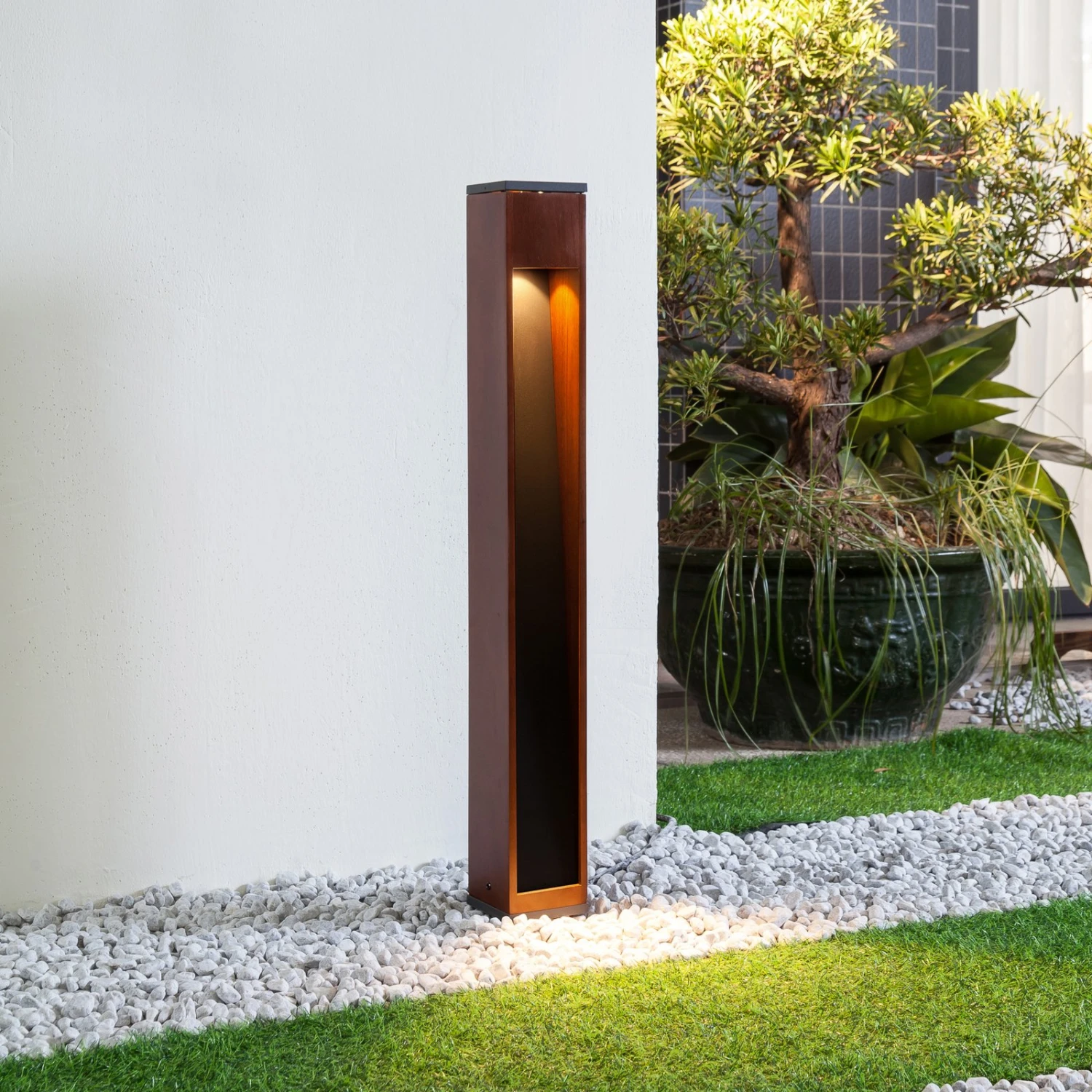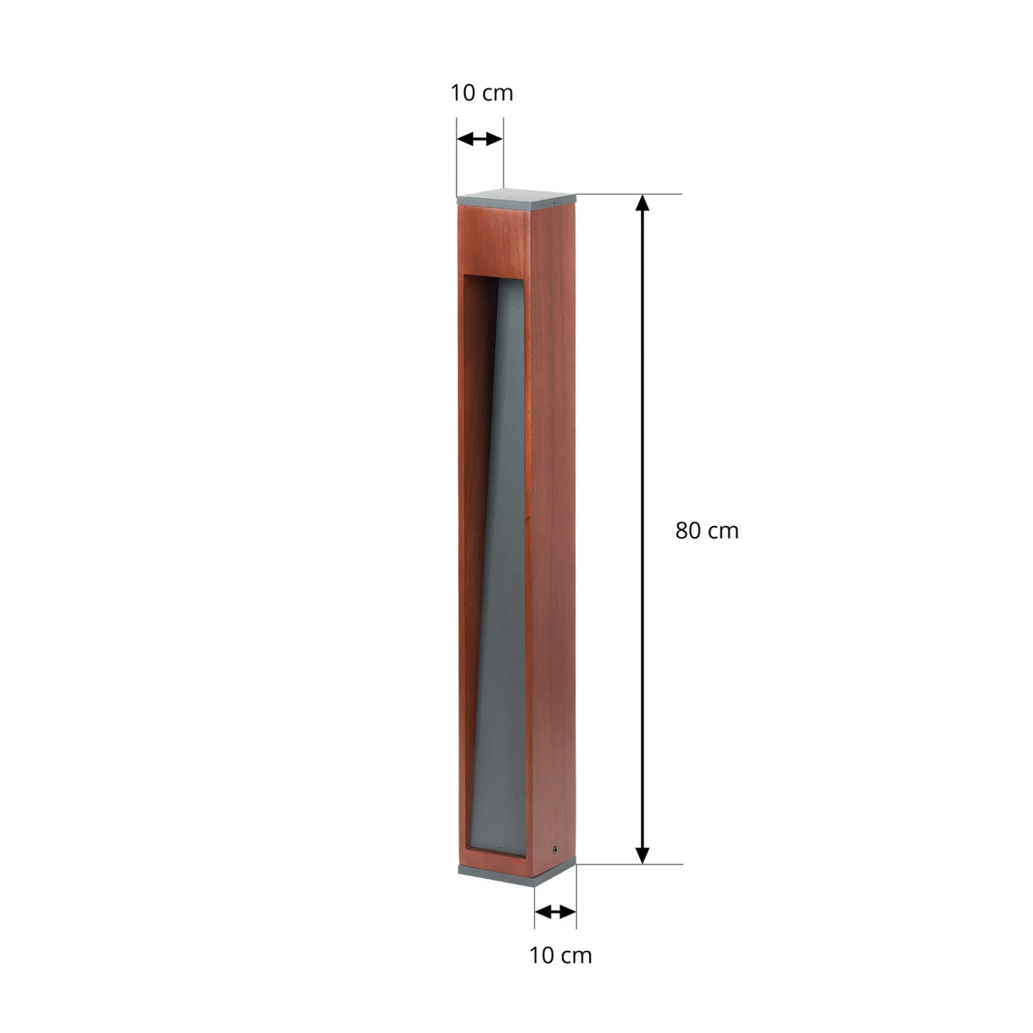 Fredo ist eine Wegelampe mit dem gewissen Etwas, denn die Leuchte verkörpert nicht nur eine stilvolle Modernität, sondern bringt auch Natürlichkeit in ihr Aussehen mit dem eckigen Leuchtenkorpus, der zum größten Teil aus Teakholz mit dunklem Finish besteht und ein wenig anthrazitfarbenes Aluminium integriert. Die einzusetzende Lampe sitzt im oberen Teil und sie strahlt das Licht nach unten ab, so dass man von einer blendfreien und weichen Lichtwirkung ausgehen kann. Damit hat man stets ein sanftes Orientierungslicht zur Verfügung, um Stolperfallen gut erkennen zu können, wenn die Dunkelheit bereits hereingebrochen ist.