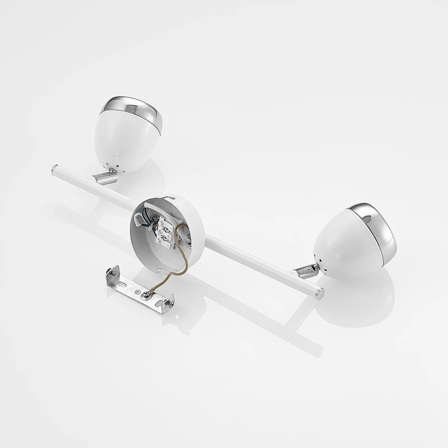 Der Deckenstrahler Khaled kommt in einem schlanken, weitläufigen Design und überzeugt mit seinem eleganten Aussehen. An einer runden Deckenhalterung ist eine längliche Strebe horizontal angebracht und trägt zwei Leuchtenschirme an ihren Enden. Der komplette Leuchtenkörper besteht aus Stahl und ist in weiß gehalten, währenddessen am oberen Rand der Lampenschirme jeweils ein chromfarbener Ring angebracht ist, der der Optik das gewisse Etwas verleiht. In die Leuchte können GU10 Leuchtmittel eingesetzt werden und sorgen für die entsprechende Ausleuchtung. Das weitläufige Äußere des Deckenspots Khaled und sein elgantes Design lassen sich mühelos in moderne Einrichtungsstile integrieren und finden vor allem in länglich geschnittenen Räumen einen perfekten Platz.