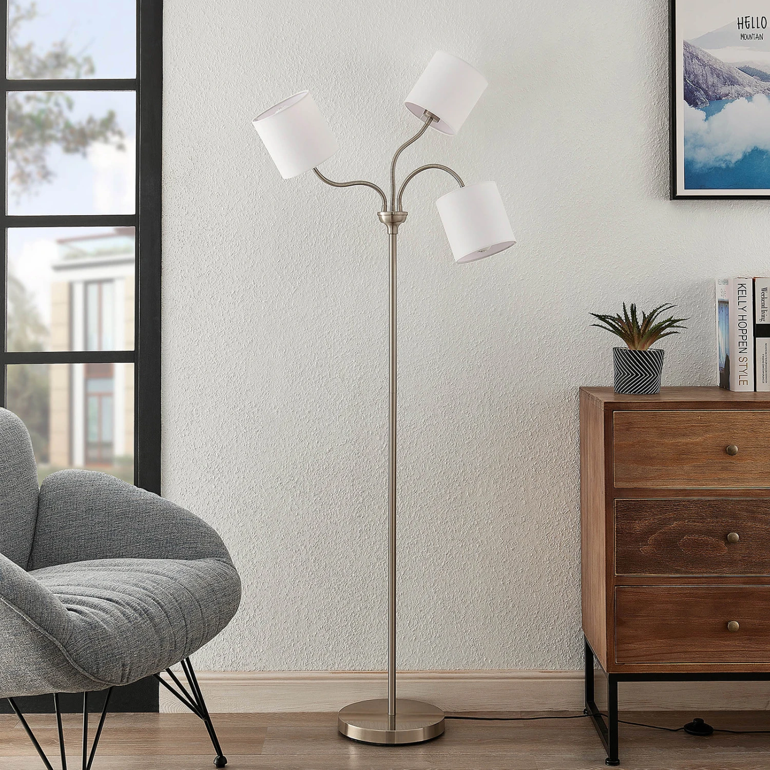 Dreiflammige Stoff-Stehleuchte Manu mit weißen Textilschirmen und Flexarmen