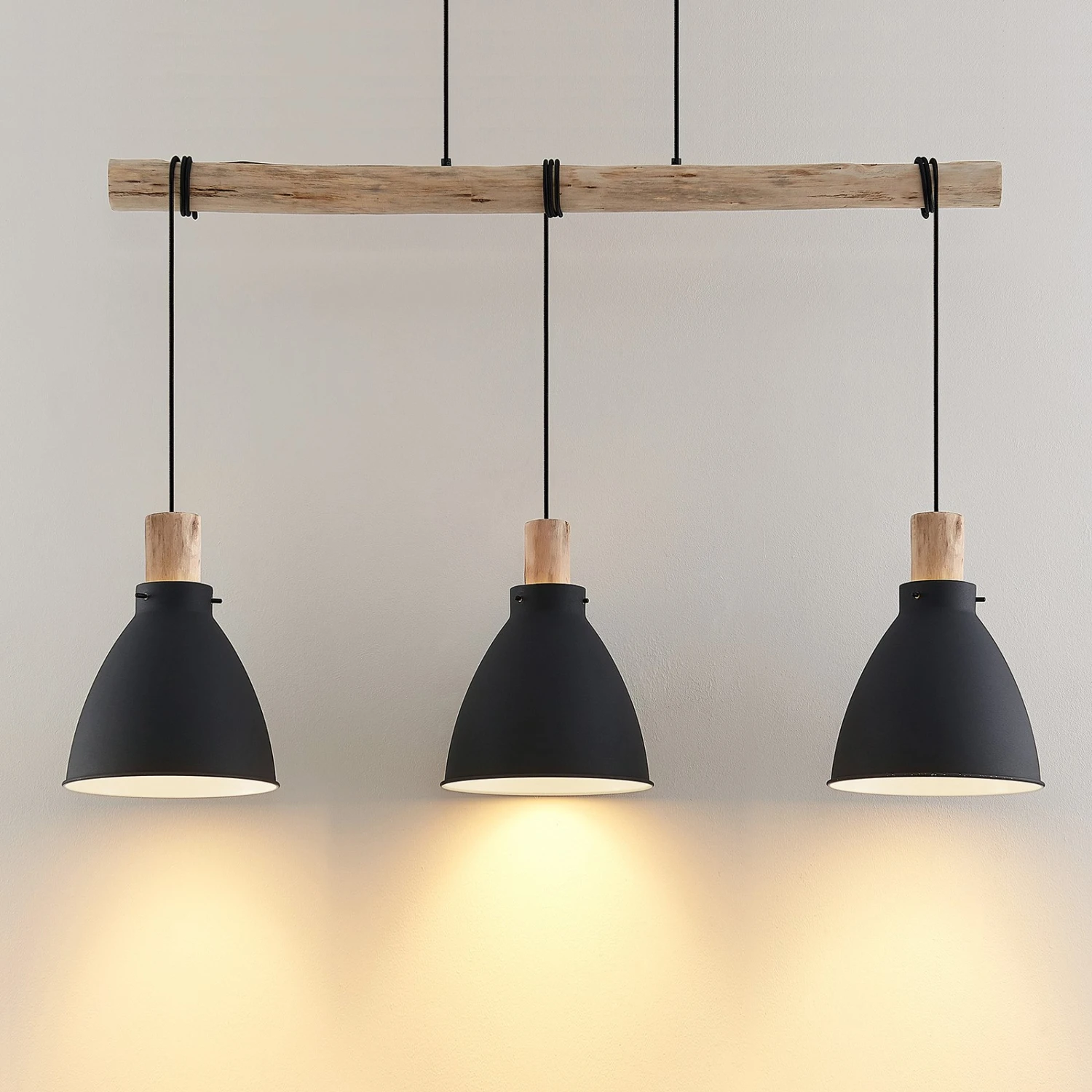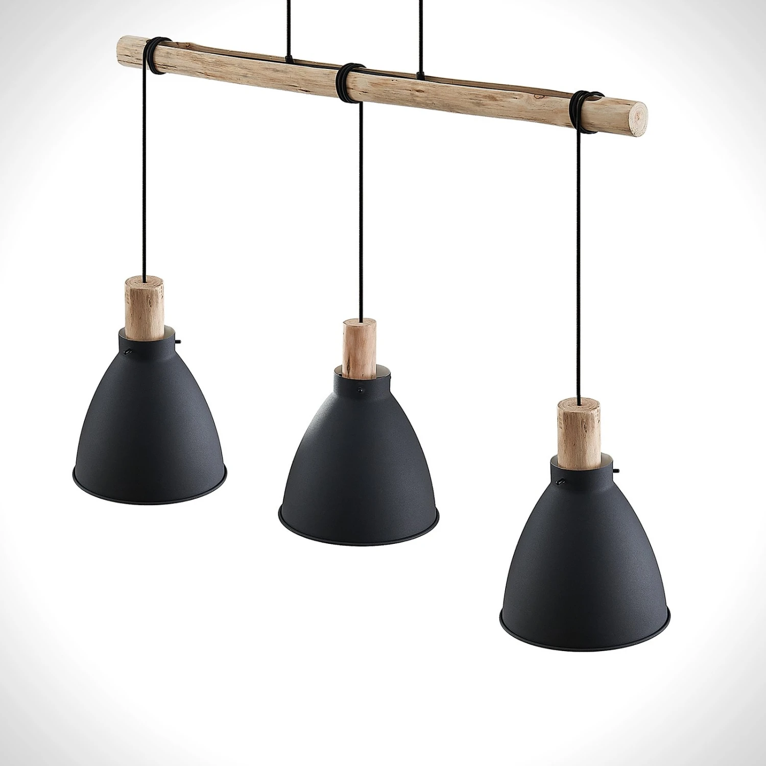 Ungemein dekorativ und flexibel präsentiert sich die dreiflammige Hängeleuchte Trebale zum einen durch die Kombination aus mattschwarz lackiertem Metall und Details aus Eukalyptusholz und zum anderen durch die Aufhängung, die in der Höhe variiert werden kann, indem die Schirme mit ihren Kabeln um die Holzstange gewickelt werden und damit auch auf unterschiedliche Abhängungen gebracht werden können.